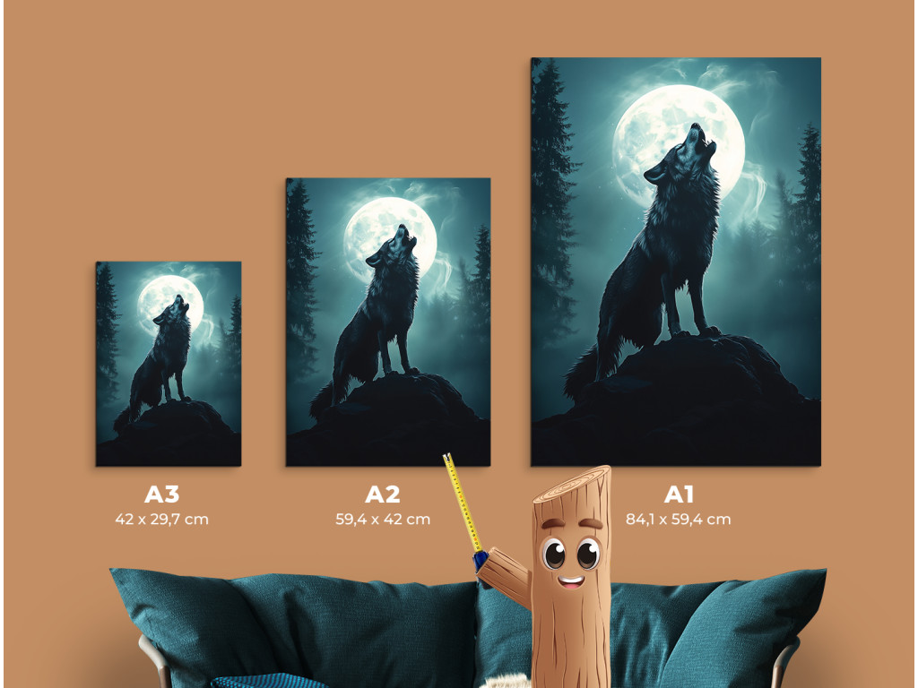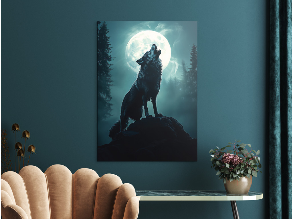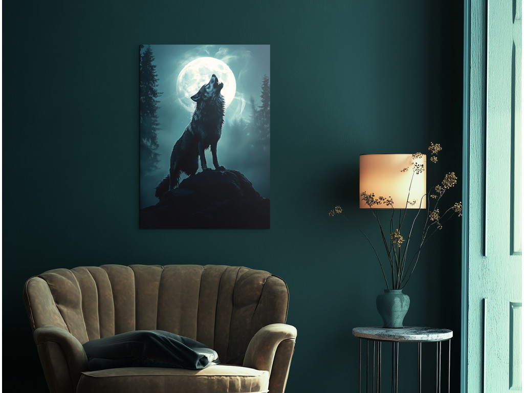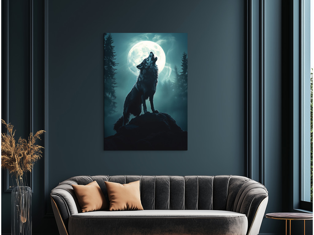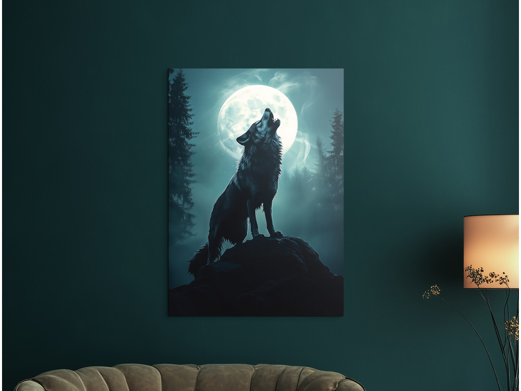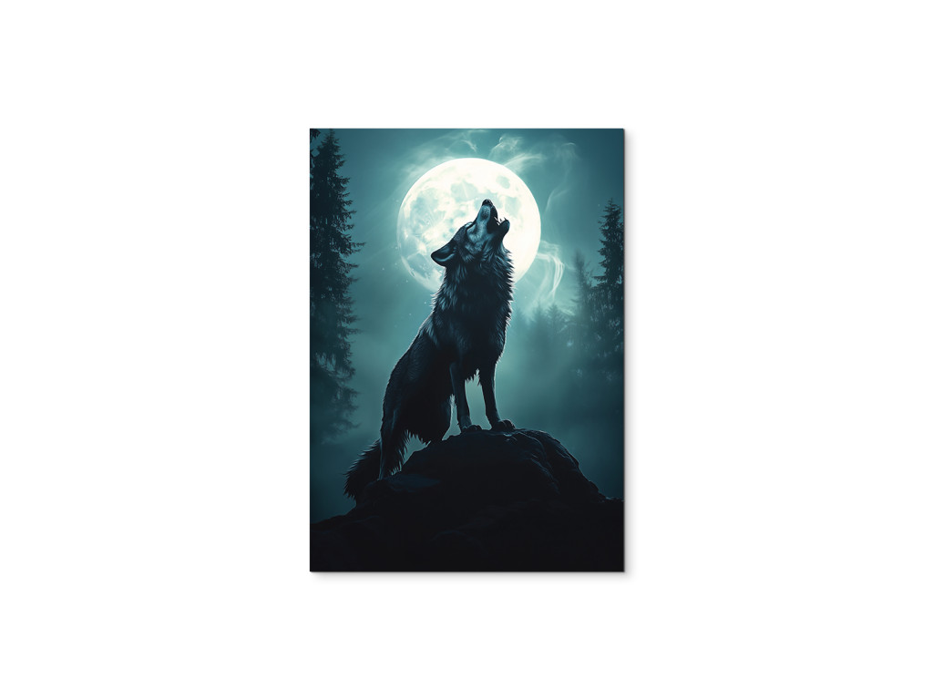 Wolfsmond zeigt die Silhouette eines Wolfes, der auf einem Felsvorsprung heult, während hinter ihm ein riesiger Vollmond in Blau-Weiß-Tönen leuchtet. Sein Licht taucht die Landschaft in einen sanften Schein und hebt die Konturen der Bäume und des Wolfes selbst hervor. Die gesamte Komposition wirkt magisch und gleichzeitig natürlich – wie ein ewiges Symbol für Freiheit, Einsamkeit und Verbundenheit mit den Kräften der Natur.