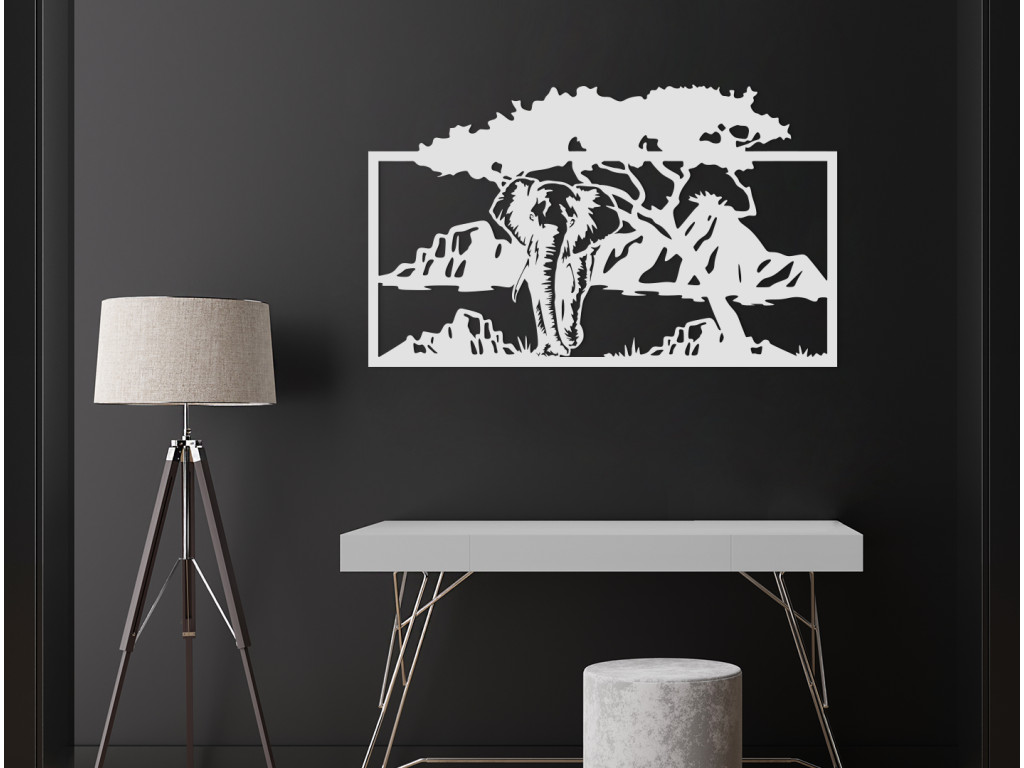 Die hölzerne Wanddekoration mit dem afrikanischen Motiv eines Elefanten in der Savanne ist eine ausgezeichnete Geschenkidee. Dank des universellen Designs und der hochwertigen Verarbeitung macht es sich gut in modernen wie auch in traditionell eingerichteten Räumen.