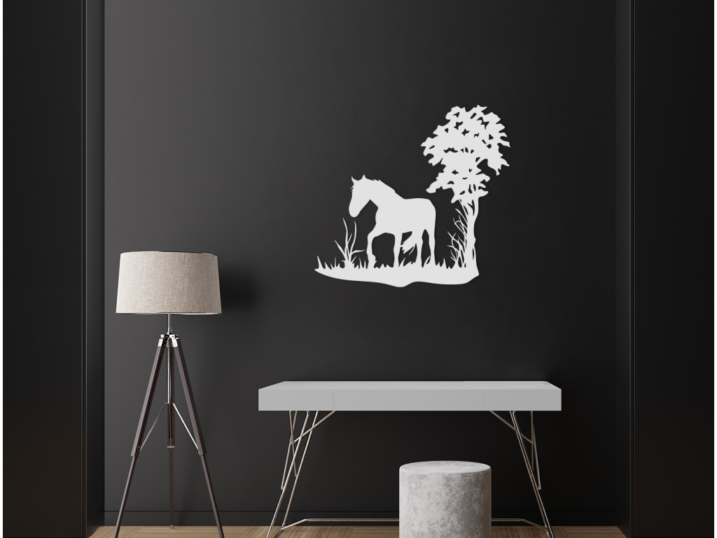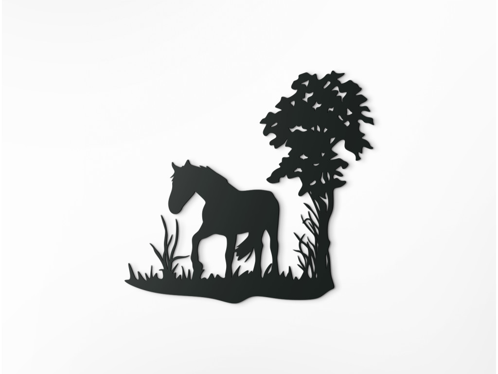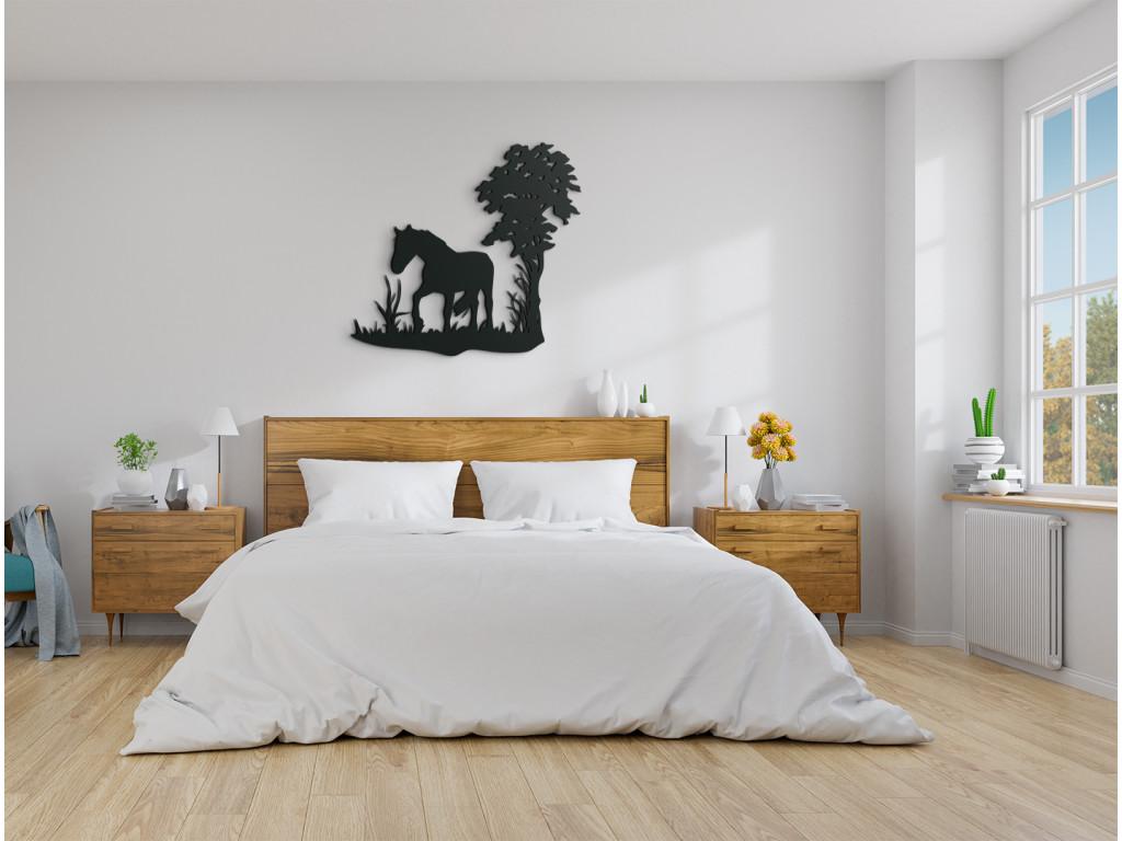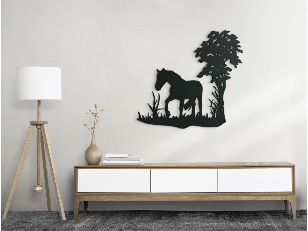 Die Wanddekoration mit dem einsamen Pferd unter einem Baum eignet sich wunderbar als Geschenk für Pferdeliebhaber. Das elegante Design in trendiger Ausfertigung fügt sich spielerisch in Räume mit traditioneller oder auch moderner Einrichtung ein.