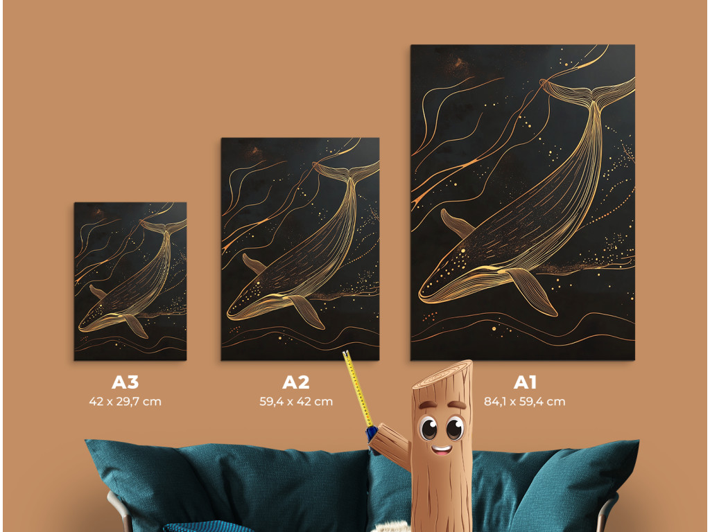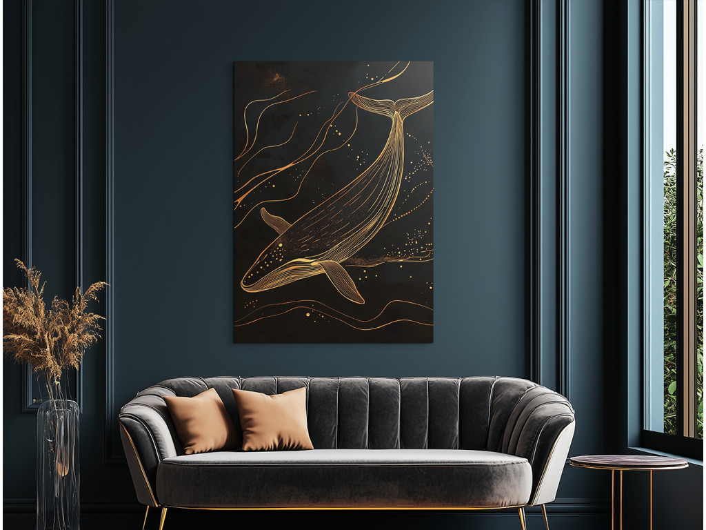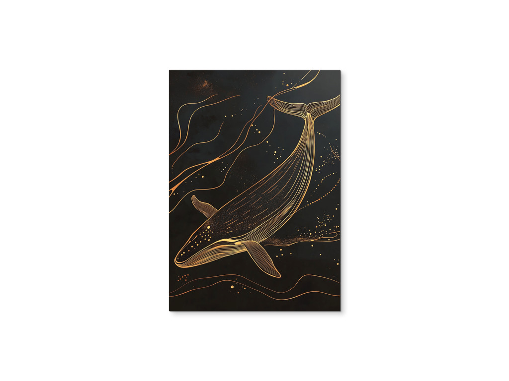 Goldene Tiefe ist ein minimalistisches Bild, das die Silhouette eines Wals aus Gold zeigt, der in der Dunkelheit des Ozeans schwimmt. Der schwarze Hintergrund symbolisiert unendliche Tiefe, während die goldene Linie des Walkörpers Ruhe, Eleganz und Mystik ausstrahlt. Das Bild wirkt klar und doch kraftvoll – eine ideale Ergänzung für ein modernes Interieur, das Ruhe und Symbolik in der Einfachheit sucht.