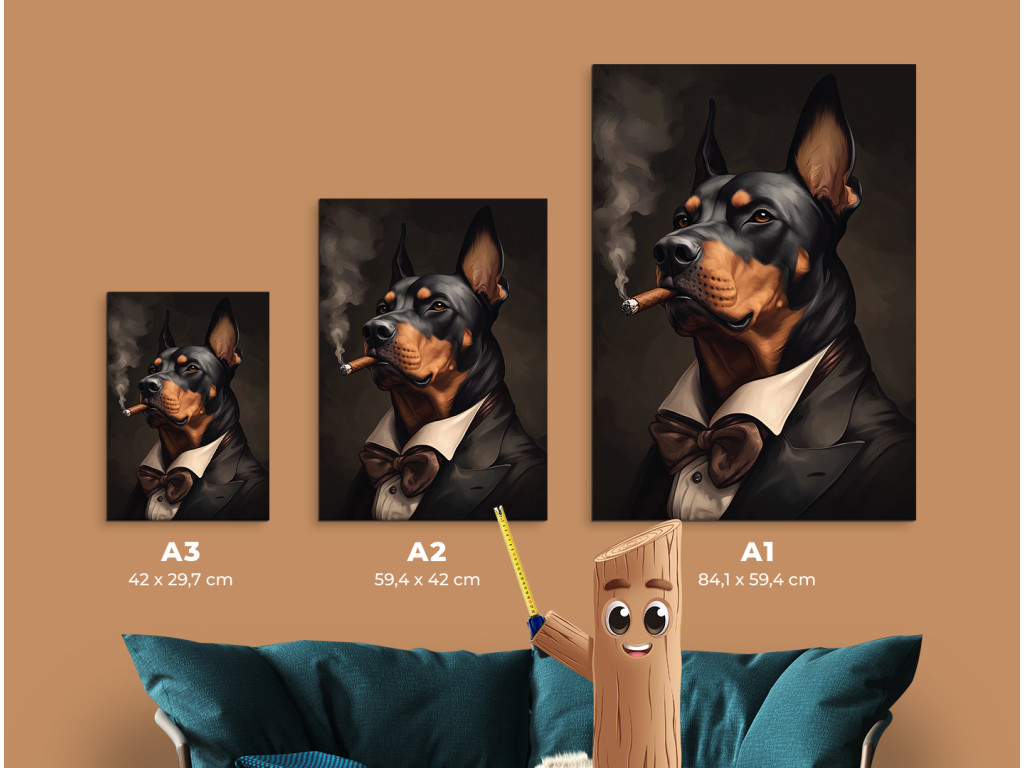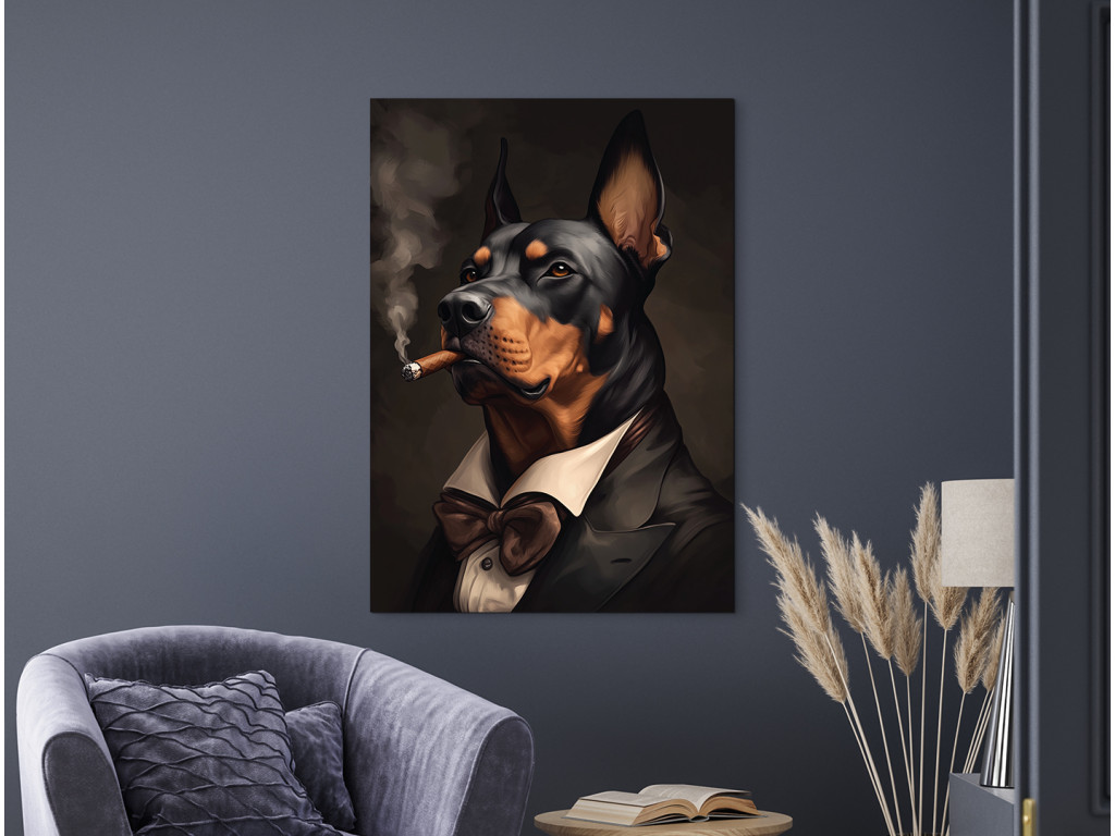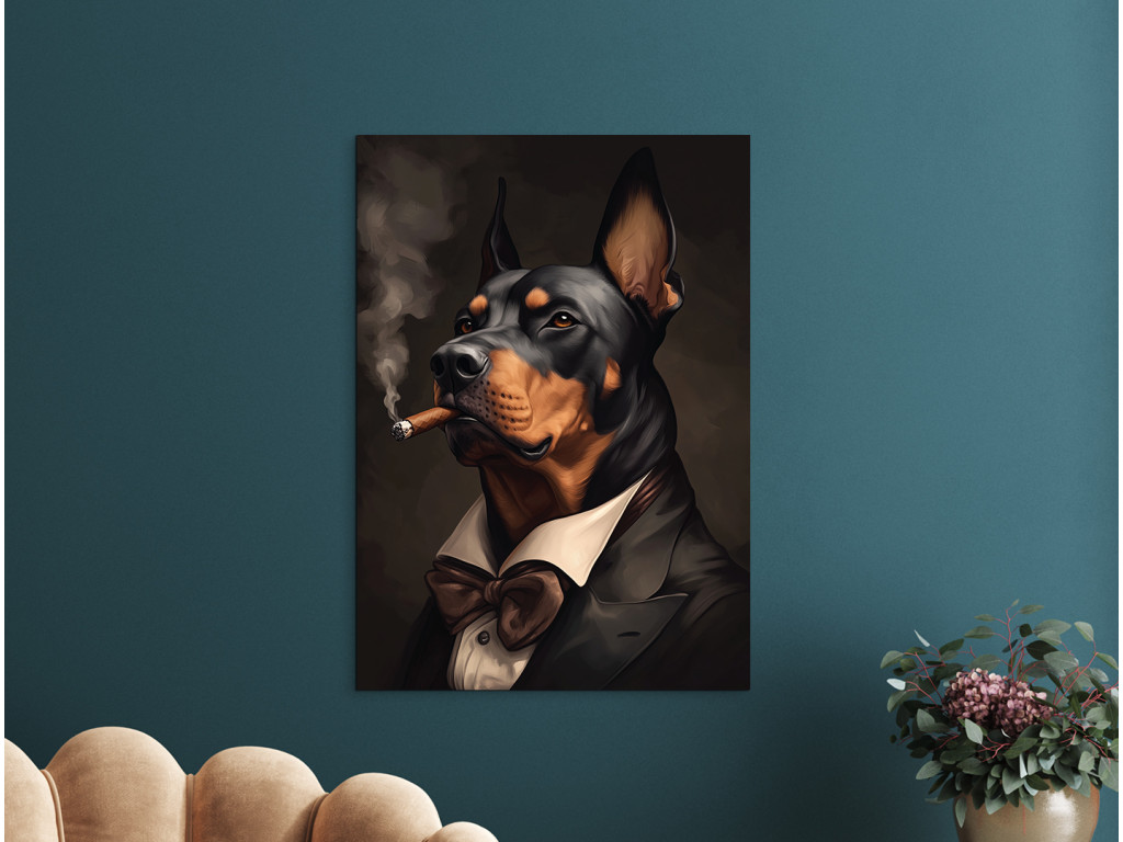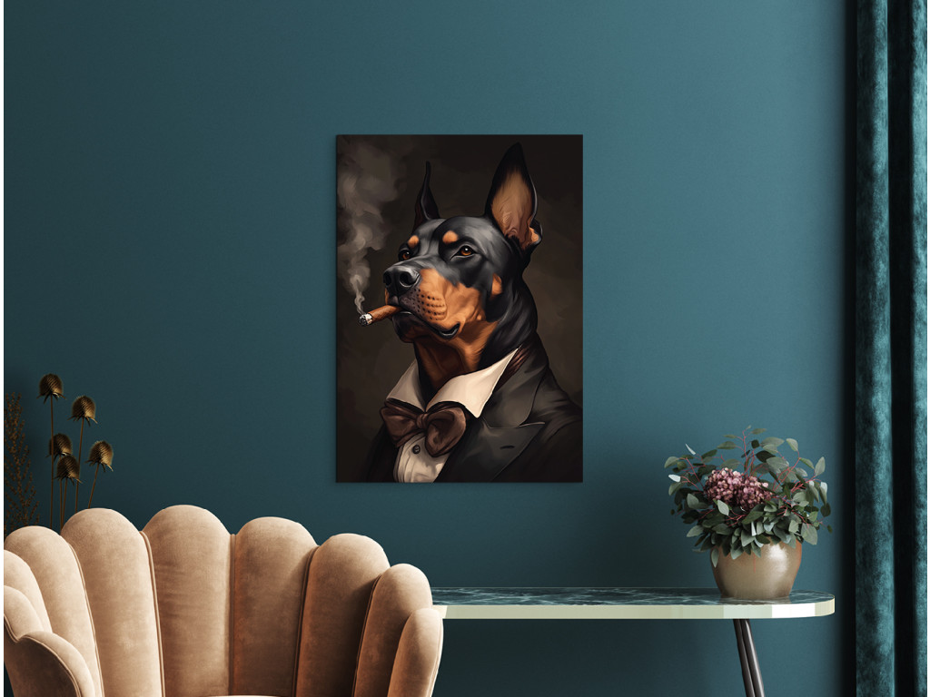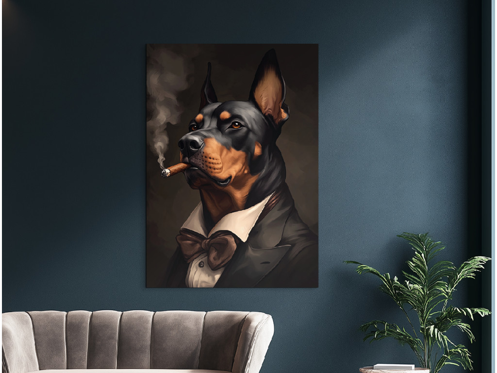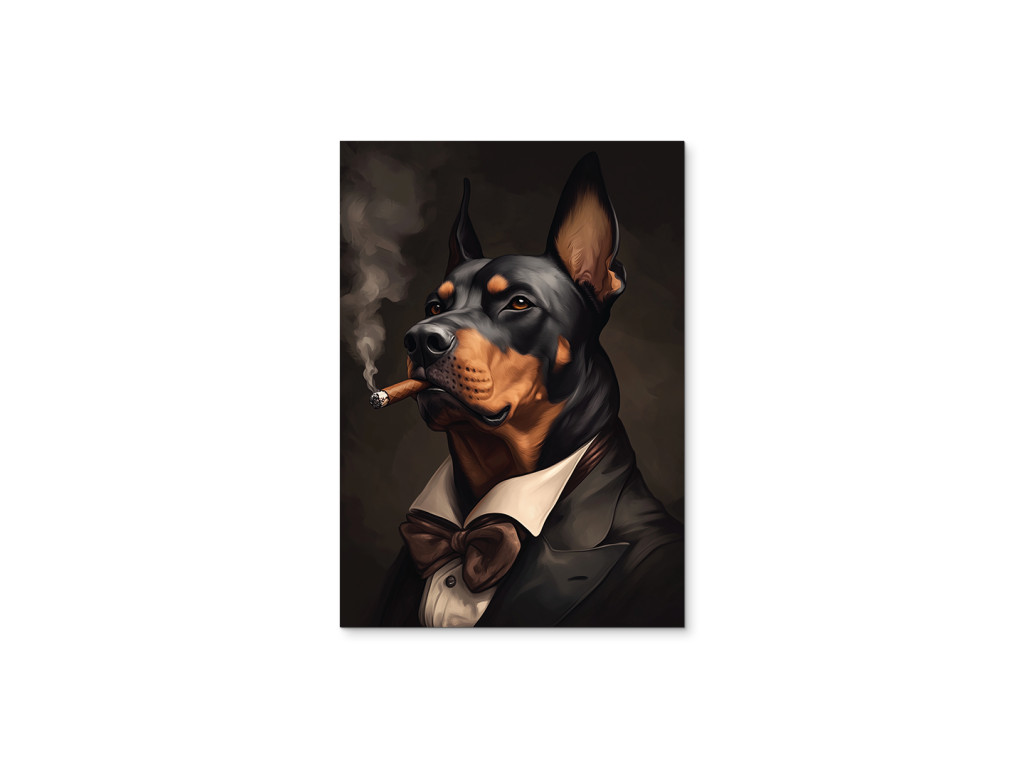 Doberman - der Boss ist ein markantes und elegant provokantes Porträt eines Hundes mit einer Haltung echter Autorität. Der schlanke und imposante Dobermann trägt einen schwarzen Anzug mit weißem Hemd und brauner Fliege, während er eine Zigarre im Maul hält, aus der ein dünner Rauchfaden aufsteigt. Der dunkle Hintergrund unterstreicht seinen Ausdruck und seine starke Persönlichkeit, was das Bild zu einer idealen Ergänzung für Innenräume mit Sinn für Stil, Humor und markante Charaktere macht.