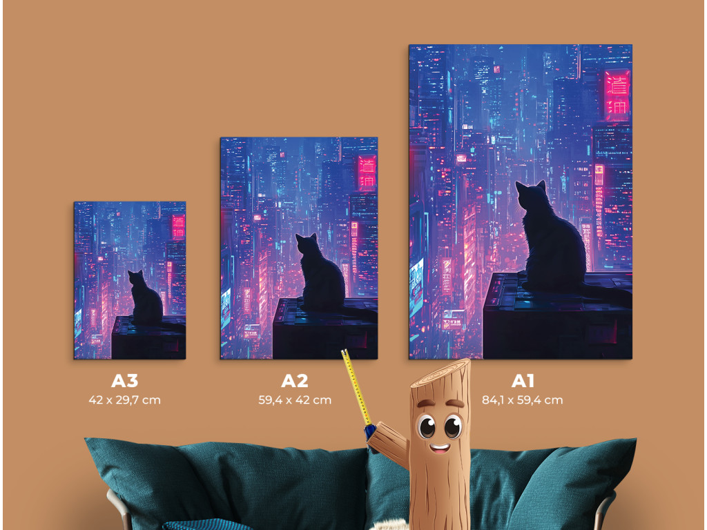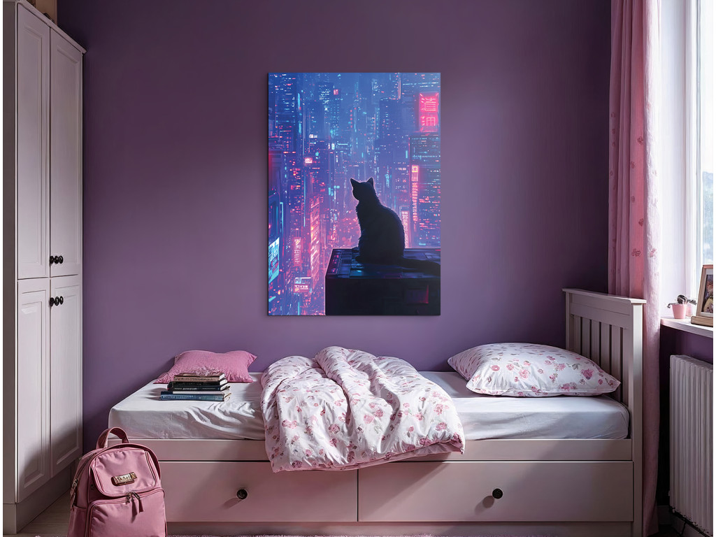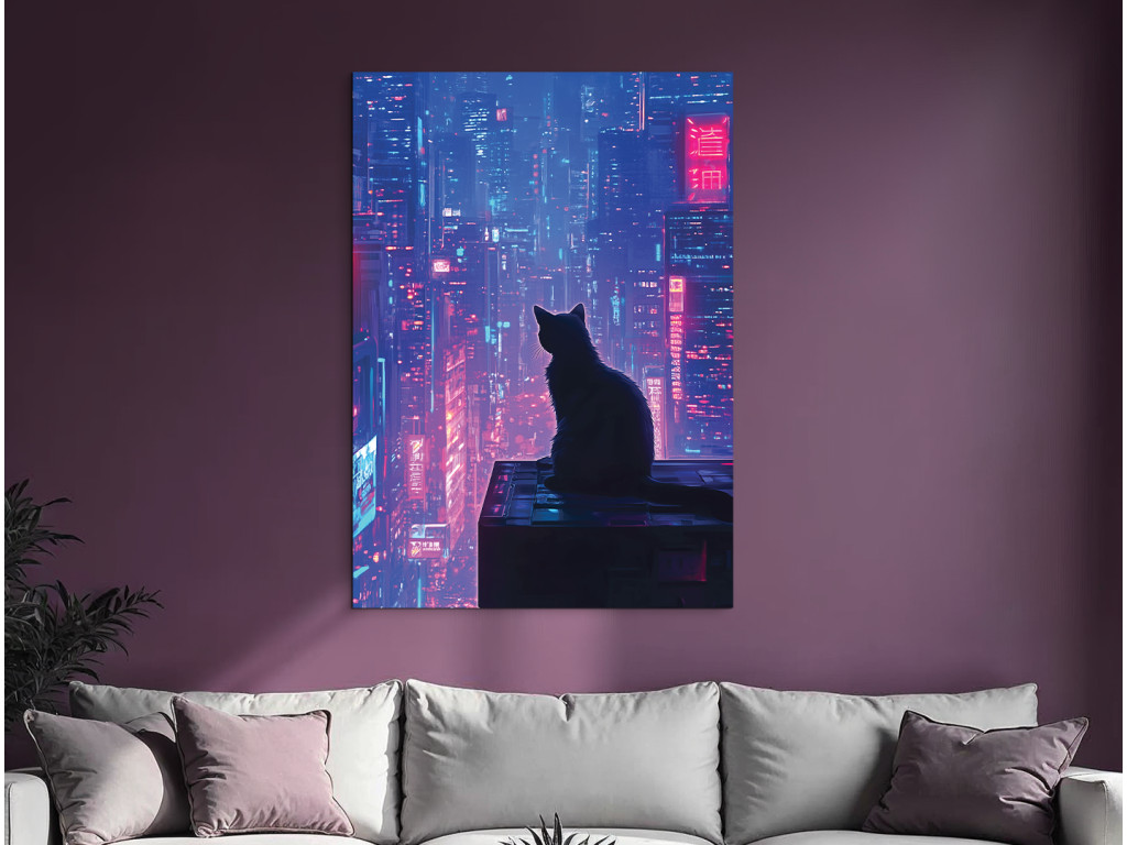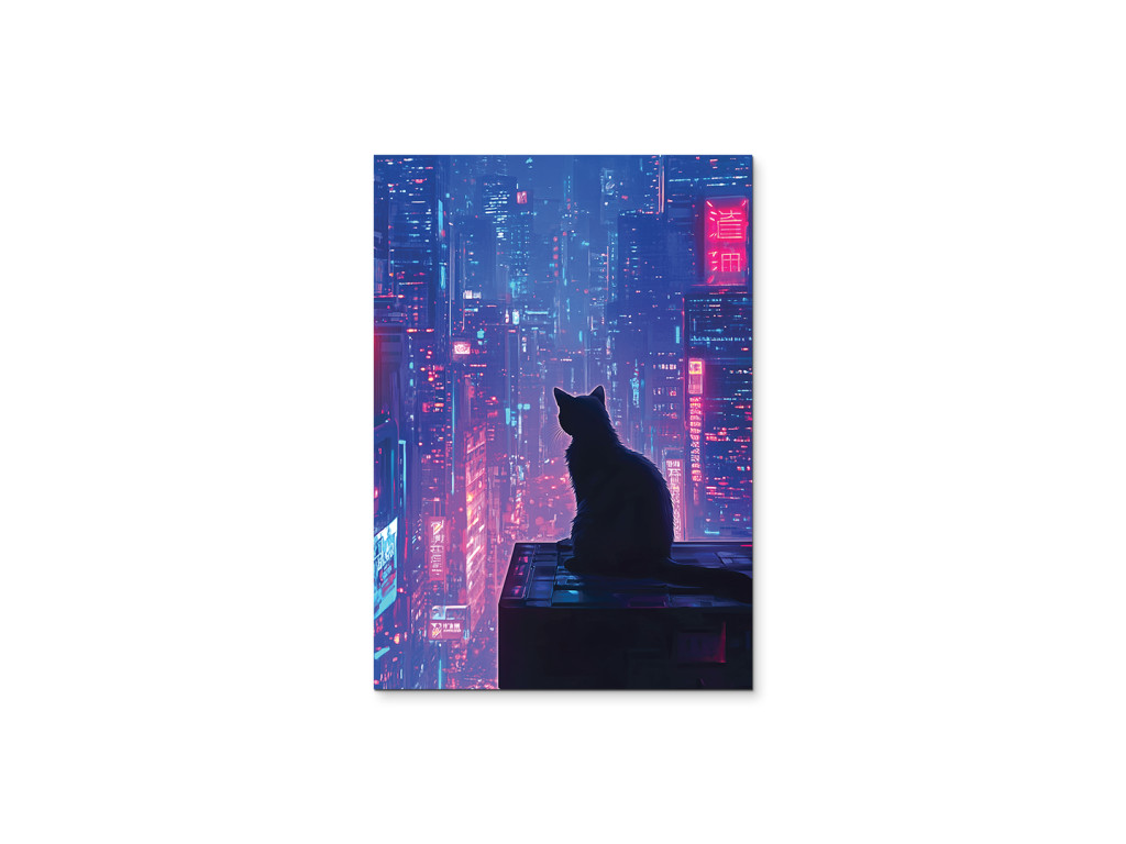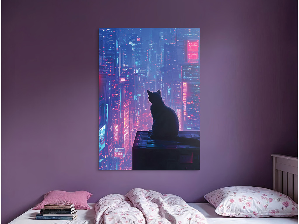 Mačka nad mestom (Katze über der Stadt) ist ein traumhaftes und leicht geheimnisvolles Bild, das die Silhouette einer Katze auf einem Dach in einer nächtlichen Großstadt zeigt. In der Ferne leuchten beleuchtete Wolkenkratzer in Violett-, Rosa- und Schwarztönen, die einen Kontrast zur ruhigen Gestalt der Katze bilden, die das Geschehen unter sich beobachtet. Das Bild wirkt ruhig, poetisch und gleichzeitig ein wenig mystisch – eine ideale Ergänzung für ein modernes Ambiente mit einer Atmosphäre der Stille, Lichter und nächtlichen Geschichten.