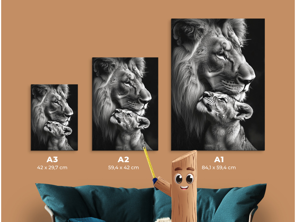 Unter dem Schutz des Löwen ist ein Schwarz-Weiß-Porträt zu sehen, das die starke Bindung zwischen dem Löwen und seinem Jungen zeigt. Der majestätische Löwe blickt ruhig und wachsam geradeaus, während das Junge ihn mit Vertrauen und Bewunderung ansieht. Die Details des Fells, der Augen und des Ausdrucks kommen durch den Kontrast von Licht und Schatten besonders gut zur Geltung, wodurch das Bild sowohl kraftvoll als auch intim wirkt. Das Werk strahlt Respekt, Geborgenheit und eine tiefe Verbundenheit aus, die jeden Liebhaber der Natur, der Familie und der Stille in der Kraft anspricht.