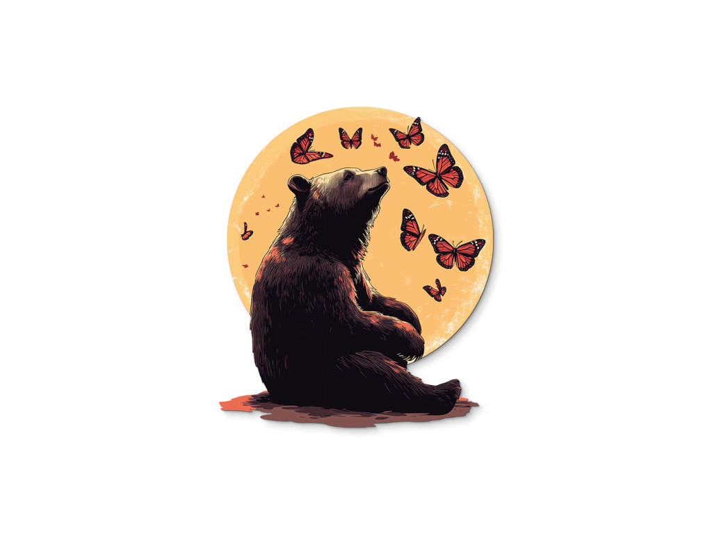 Die Darstellung eines ruhig sitzenden Bären, der nach oben in einen orange-gelben Kreis blickt, der an die Sonne oder den Mond erinnert. In seinem Licht flattern zarte Schmetterlinge, als würden sie still in der Luft tanzen. Die Szene wirkt magisch und friedlich und verbindet die Kraft der Natur mit der Zartheit des Details.