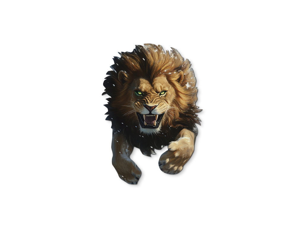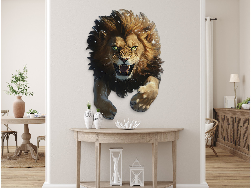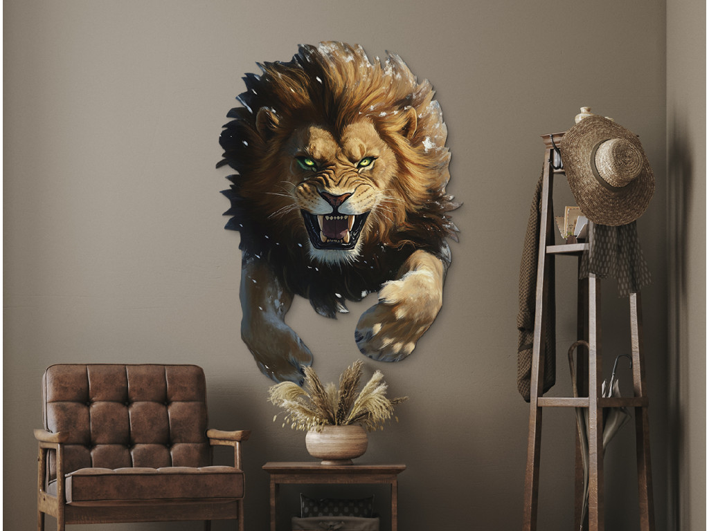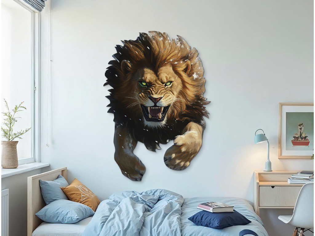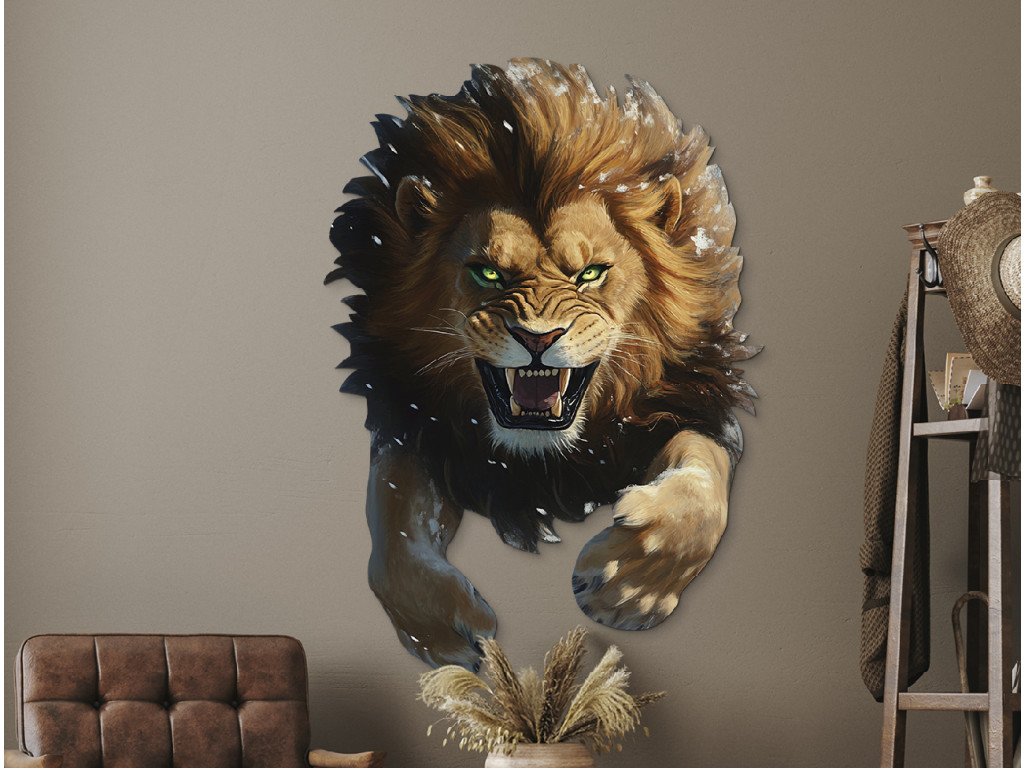 Dieser originelle Wandaufkleber zeigt einen brüllenden Löwen mit zerzaustem Fell und durchdringenden grünen Augen. Der dreidimensionale Effekt verleiht dem Bild Dynamik und Kraft, während das geöffnete Maul mit den Zähnen die Wildheit und Entschlossenheit unterstreicht. Ein markantes Element für Ihr Interieur mit der Energie der Wildnis.