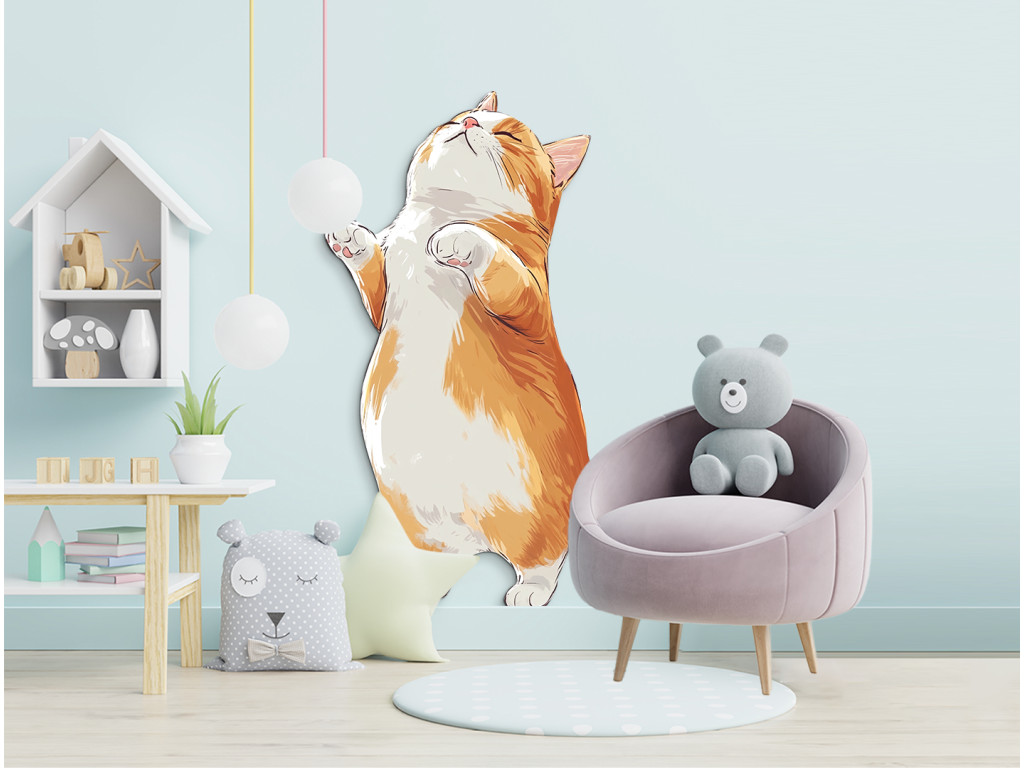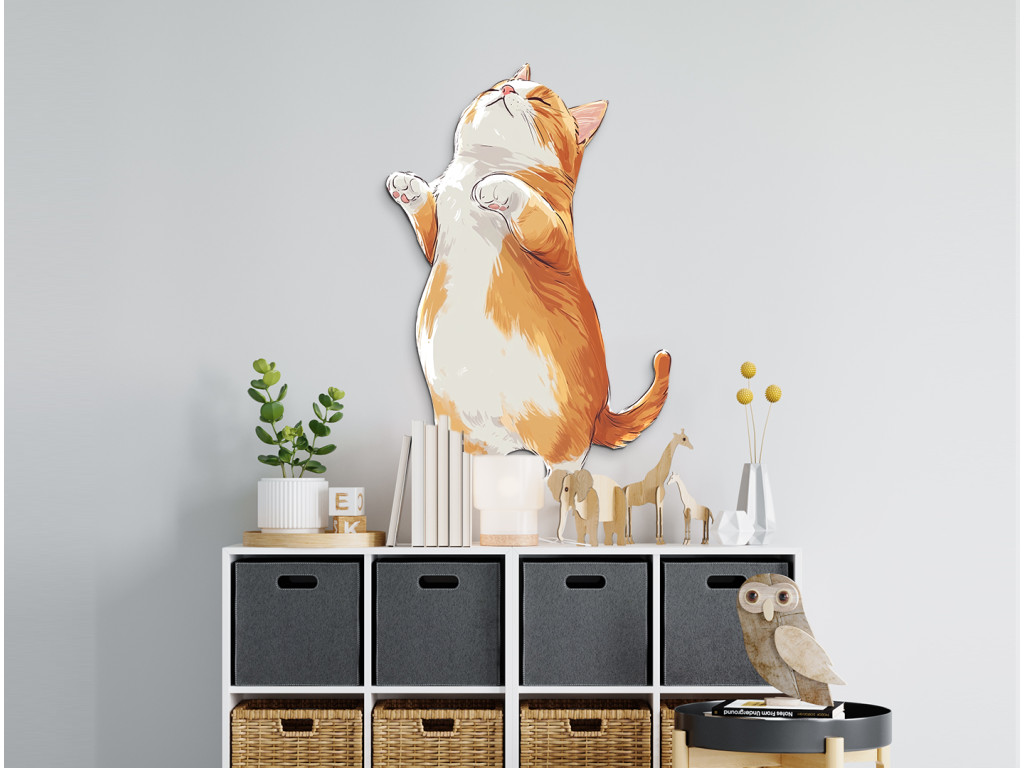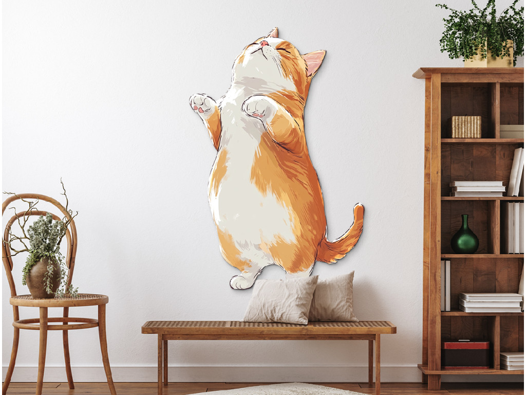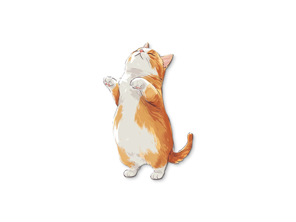 Eine entzückende orange-weiße Katze mit einem volleren Körper steht auf ihren Hinterbeinen, den Kopf zum Himmel erhoben und die Augen geschlossen, als würde sie die Sonnenstrahlen oder den Duft in der Luft genießen. Ihre Haltung wirkt zufrieden und ruhig – wie die Verkörperung unbeschwerter Freude und katzenhafter Gelassenheit.