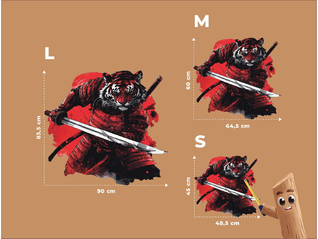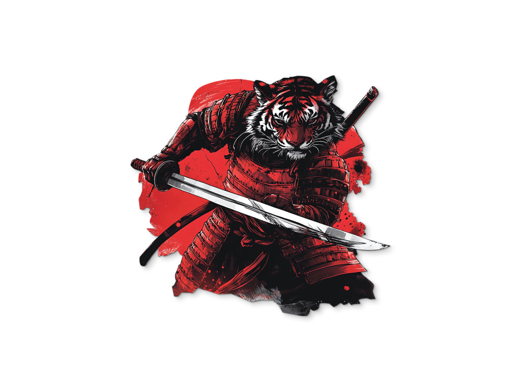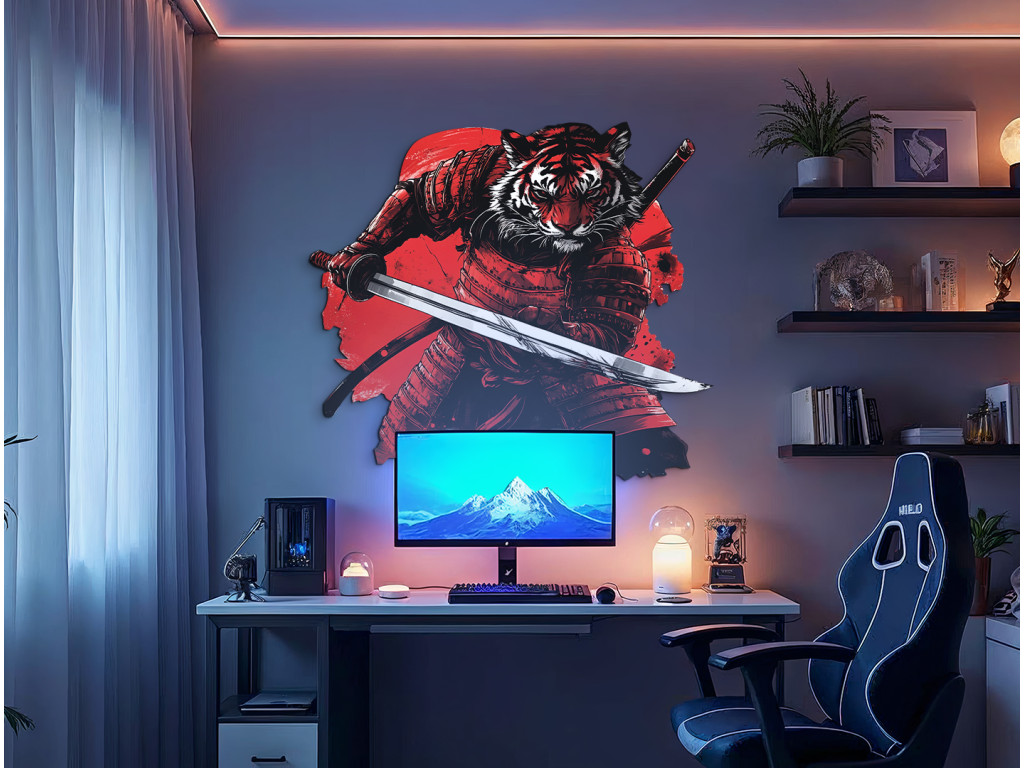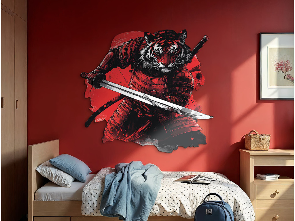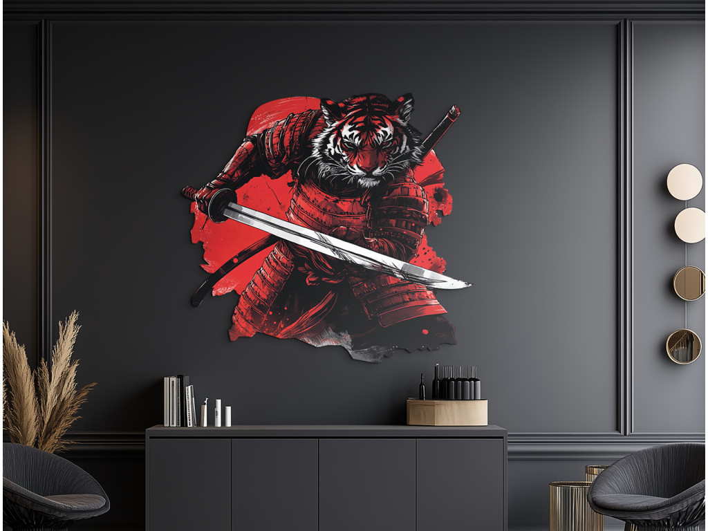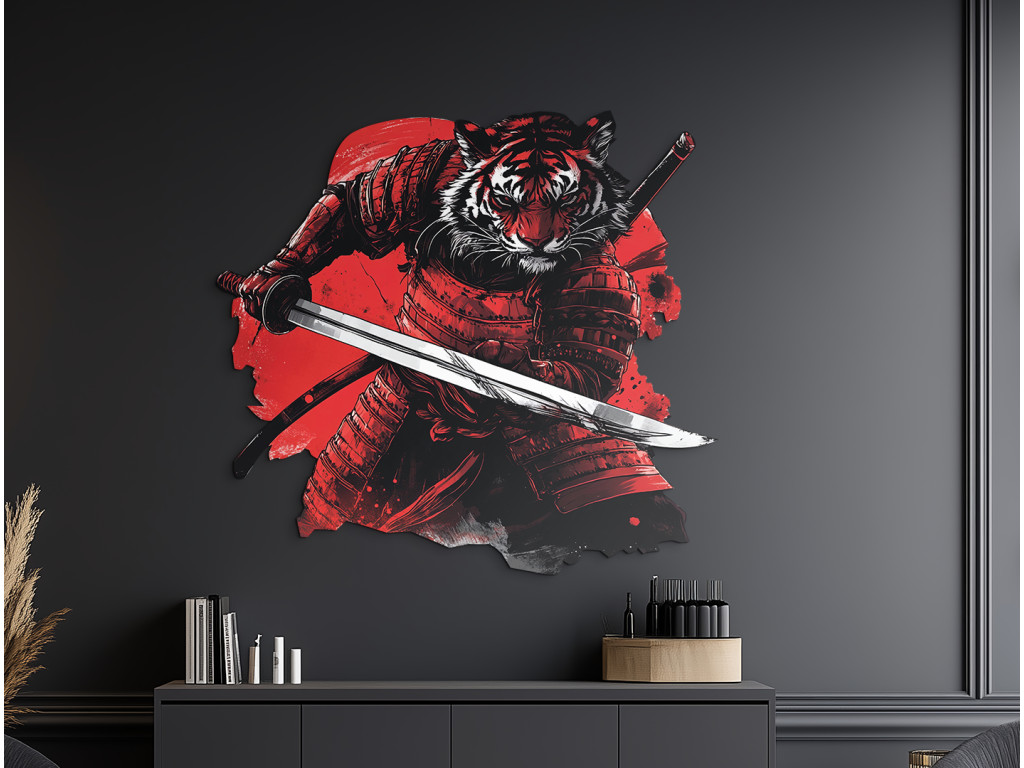 Ein markantes Kunstwerk, das einen Tiger in Samurai-Rüstung mit einem zum Kampf bereitstehenden Katana darstellt. Die Verbindung der wilden Kraft des Tigers mit der Ehre des Samurai schafft ein visuell starkes Motiv voller Mut, Tradition und Kampfgeist. Ein ideales Stück für Innenräume mit Charakter.