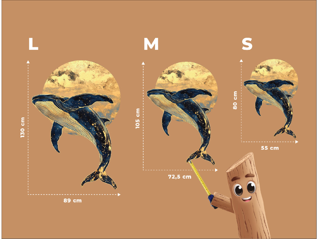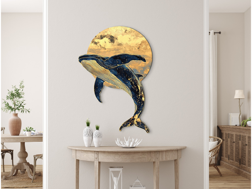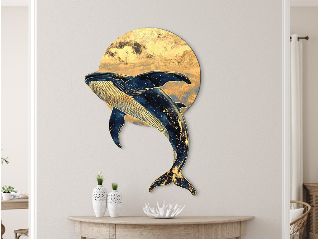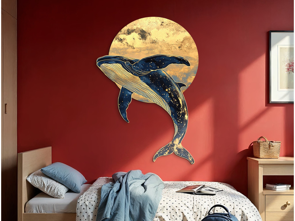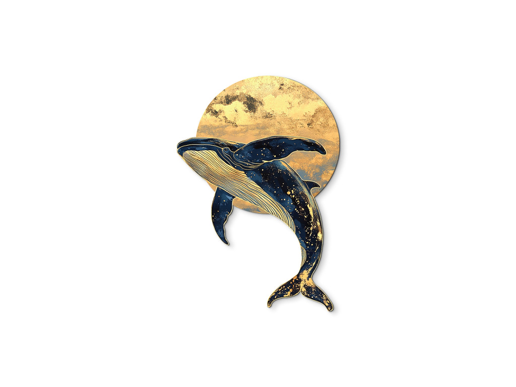 Die Darstellung eines Wals, der durch den nächtlichen Raum schwimmt, verbindet die Majestät des Ozeans mit der Fantasie des Weltalls. Sein Körper ist mit einer sternförmigen Textur bedeckt, als wäre er Teil des Weltalls selbst, und im Hintergrund leuchtet ein gelblicher Kreis, der an den Mond oder die Sonne erinnert. Das Werk vermittelt Ruhe, Tiefe und Unendlichkeit – sei es des Ozeans oder des Himmels.