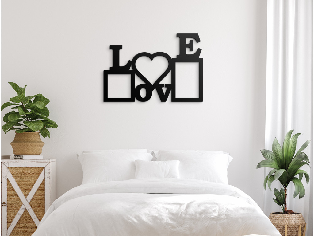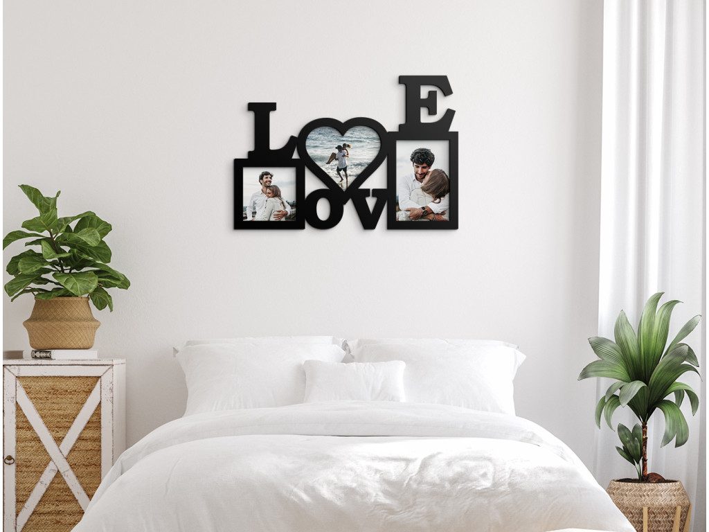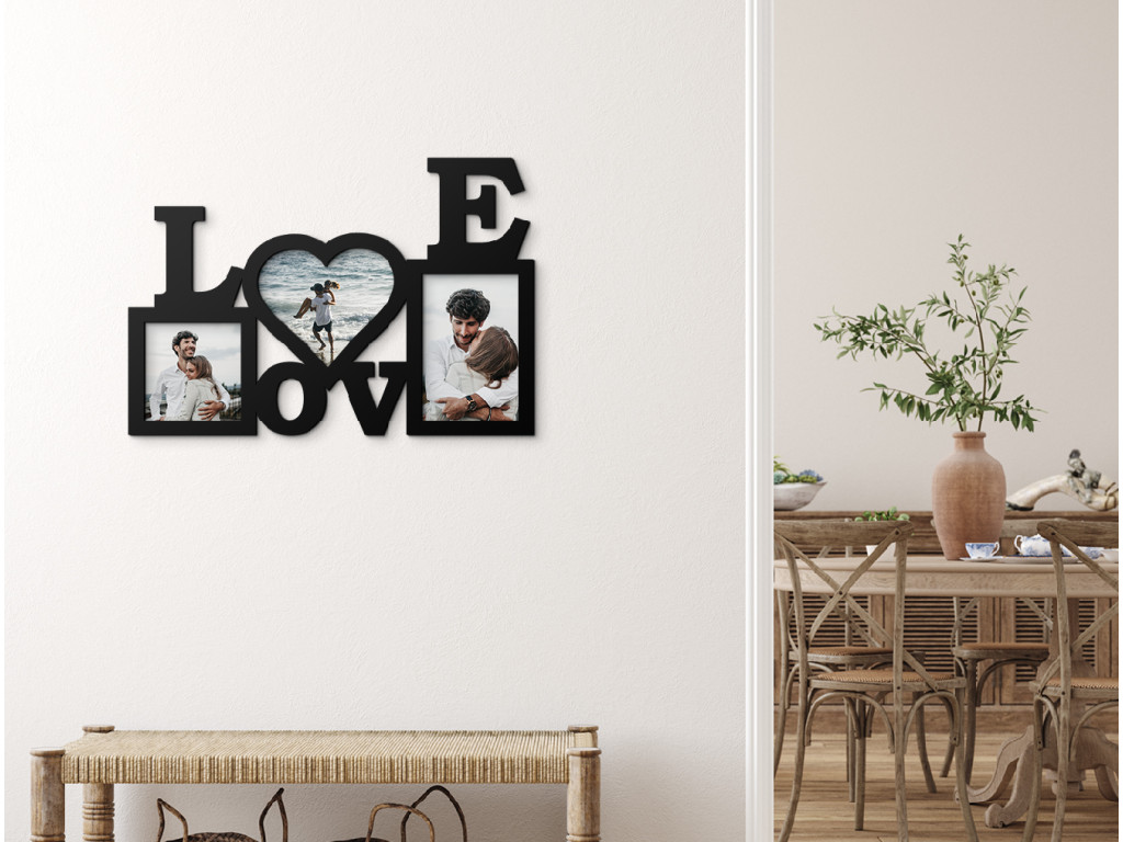 Den Fotorahmen für die Wand mit der Aufschrift „Love“ können Sie perfekt auf den Rest Ihrer Einrichtung abstimmen – ganz gleich, ob Sie den Fotorahmen im Wohnzimmer, über dem Bett im Schlafzimmer oder im Flur aufhängen möchten. Sie haben Platz für 3 Fotos, wobei das mittlere direkt in das Herz eingesetzt wird. Das Produkt besteht ausschließlich aus dem Rahmen, Glas oder andere Materialien sind nicht enthalten.