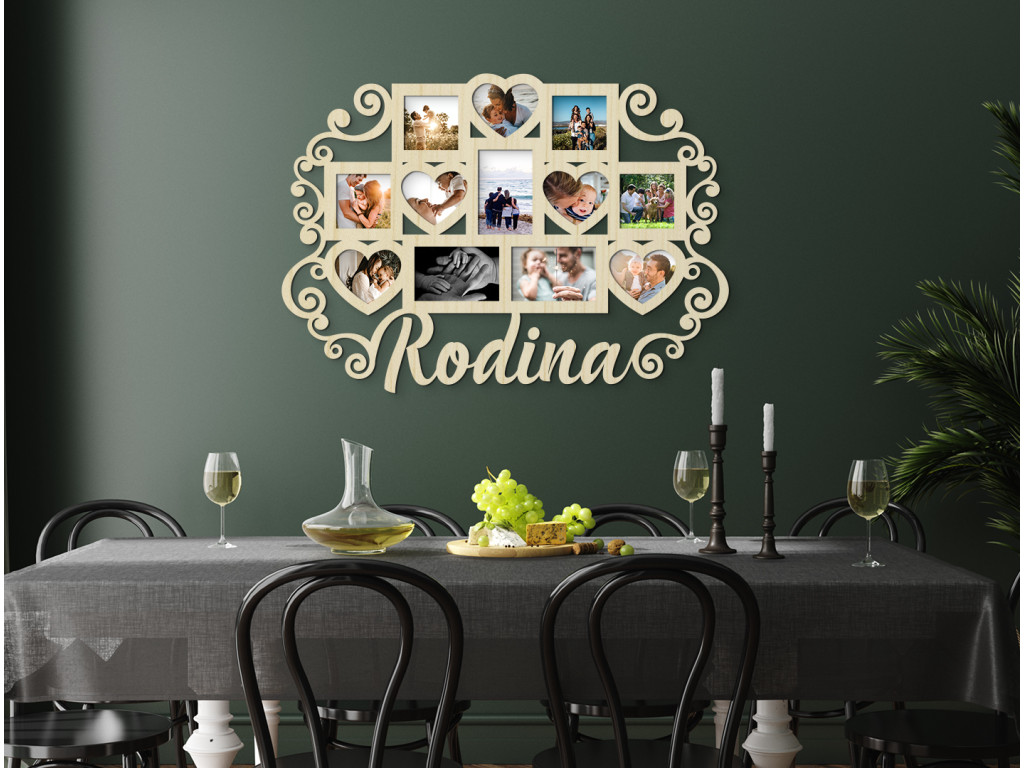 Sie kennen das sicher. Manche Fotos sind so schön und bedeutungsvoll, dass es einfach schade ist, sie einfach nur in einem Album abzuheften. Dank eines großen Familienfotorahmens aus Naturmaterial, den wir in einem Dekor Ihrer Wahl anfertigen, können Sie sie immer im Blick haben. Das Design ist schlicht und funktional – Sie können bis zu 12 Schnappschüsse aus Ihrem gemeinsamen Leben in den Rahmen kleben. Unten werden sie mit der Aufschrift „Familie“ und Ornamenten um den Rahmen herum verziert.