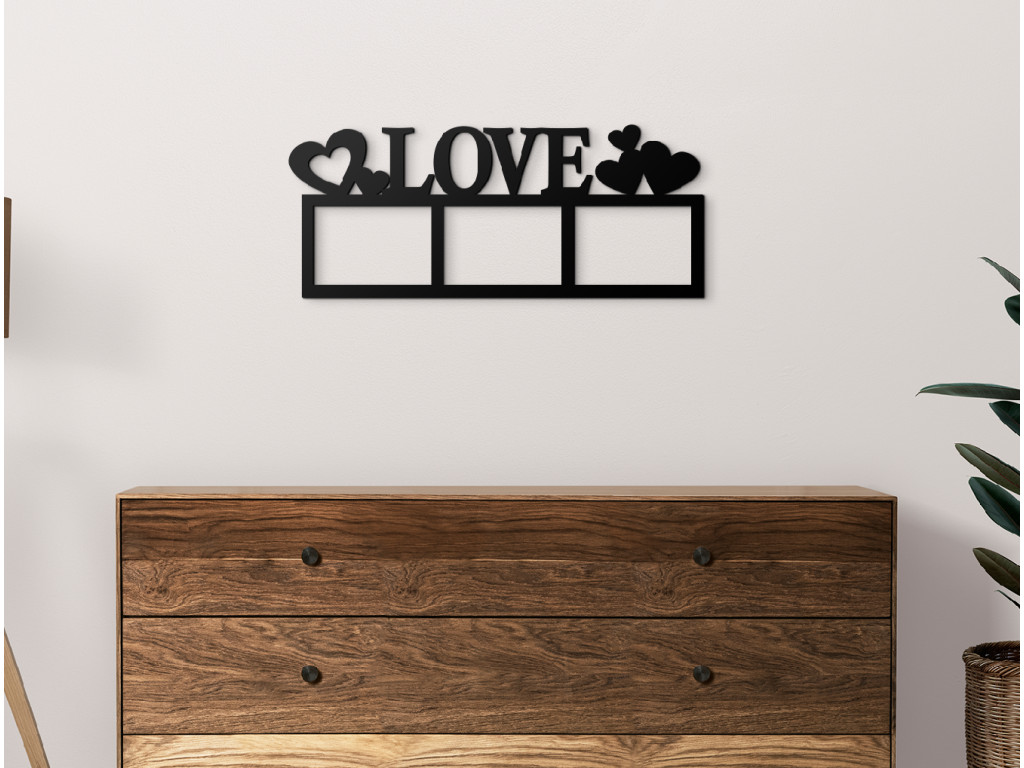 Wenn Ihre Lieblingsfotos horizontal ausgerichtet sind, ist dieser Fotorahmen die ideale Wahl für Sie. So haben Sie die schönsten Momente Ihrer Beziehung jeden Tag vor Augen und nicht nur in einem Album. Das Design bietet Platz für 3 Fotos und besteht aus dem englischen Schriftzug LOVE und fünf Herzen. Sie haben derzeit die Wahl zwischen mehreren Dekoren, die sich leicht an Ihre Einrichtung oder die Wandfarbe anpassen lassen. Das Produkt besteht ausschließlich aus dem Rahmen, Glas oder andere Materialien sind nicht enthalten.