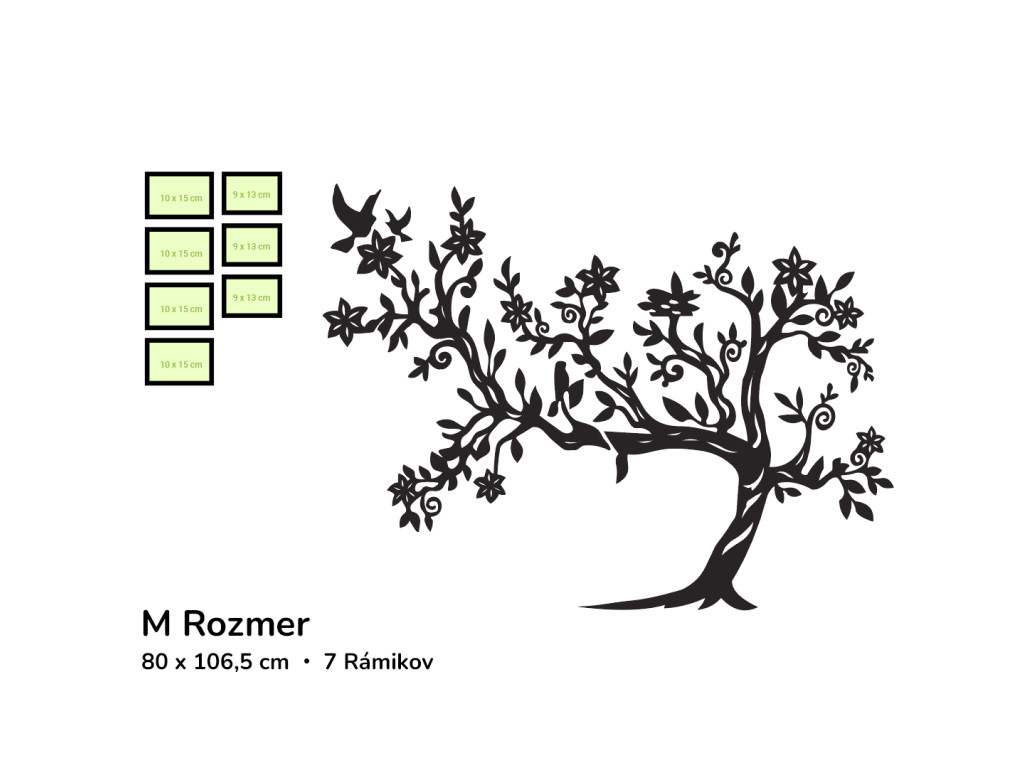 Der Fotorahmen für die Wand besteht aus einem großen Stamm mit blühenden Ästen eines weit ausladenden Baumes, auf dem Sie die beiliegenden Fotorahmen platzieren können. Die Größe S enthält 4 Rahmen, die Größe M 7 Rahmen und die Variante L 10 Rahmen. Außerdem sind 2 fliegende Tauben enthalten, die Sie so positionieren können, dass sie um den Baum herum oder alleine fliegen. Bei der Positionierung der Elemente sind der Kreativität keine Grenzen gesetzt, so dass Sie die horizontale oder vertikale Ausrichtung der Fotos nach Belieben wählen können. Das Produkt besteht nur aus Rahmen, sie enthalten kein Glas oder anderes Material.
