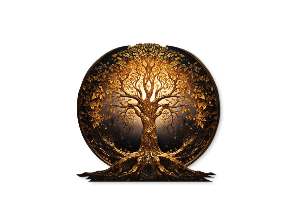 Die elegante runde Dekoration zeigt einen goldenen Lebensbaum mit reich verzweigten Wurzeln und einer Krone aus Blättern, die in sanftem goldenem Licht erstrahlen. Die Komposition wirkt harmonisch und ausgewogen und unterstreicht die Symbolik von Lebenskraft, Wachstum und der Verbindung zwischen Himmel und Erde.