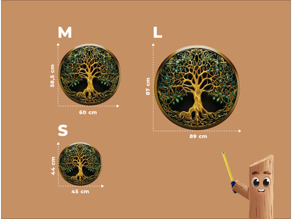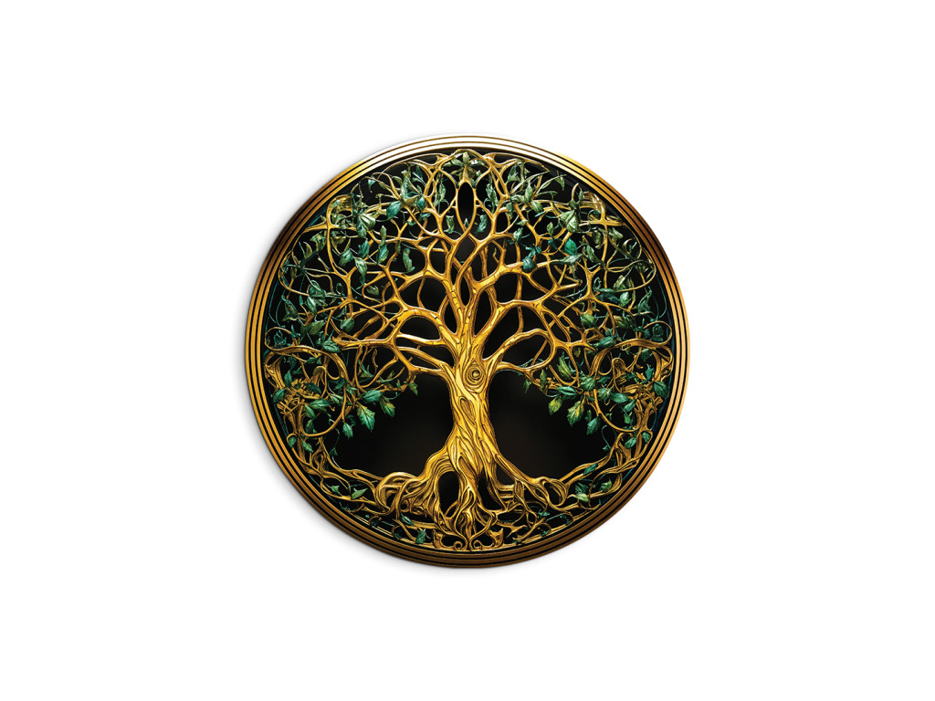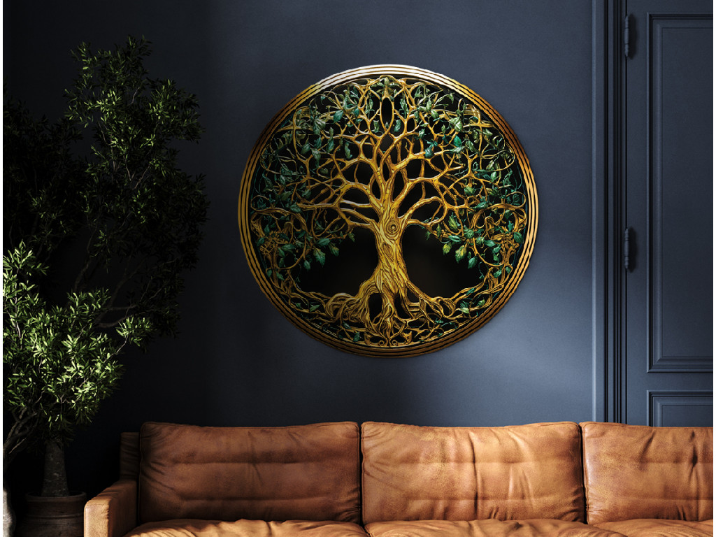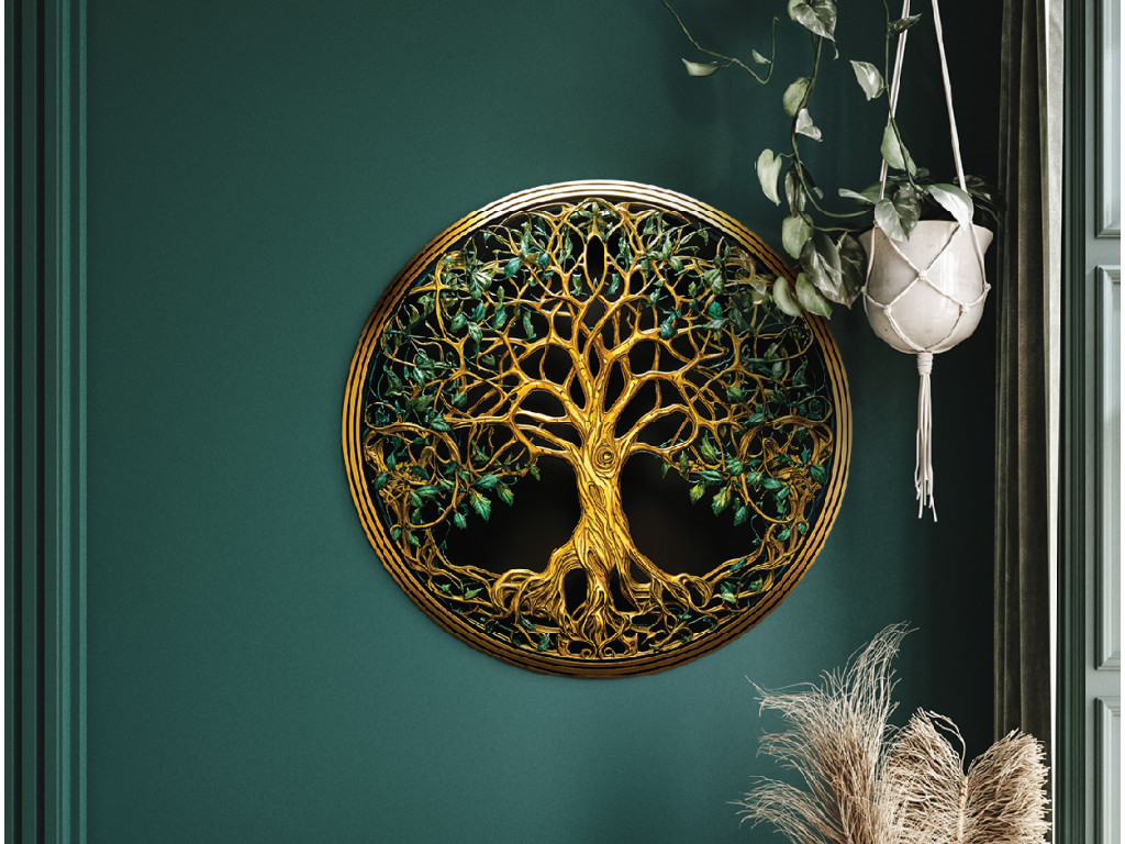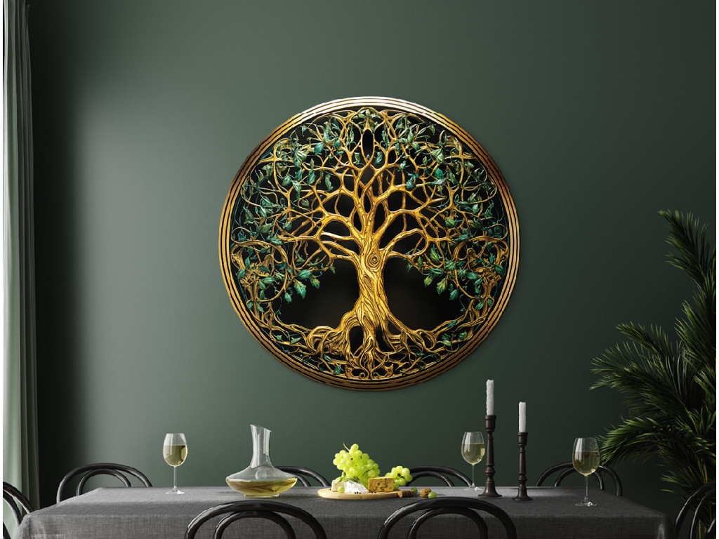 Die runde Wanddekoration in einem eleganten Goldrahmen zeigt einen reich verzierten Baum des Lebens mit detailliert verflochtenen Wurzeln und Ästen. Die grünen Blätter verleihen dem Bild einen lebendigen Akzent und bilden einen Kontrast zur dunkelgrünen Wand, an der das Bild hängt.