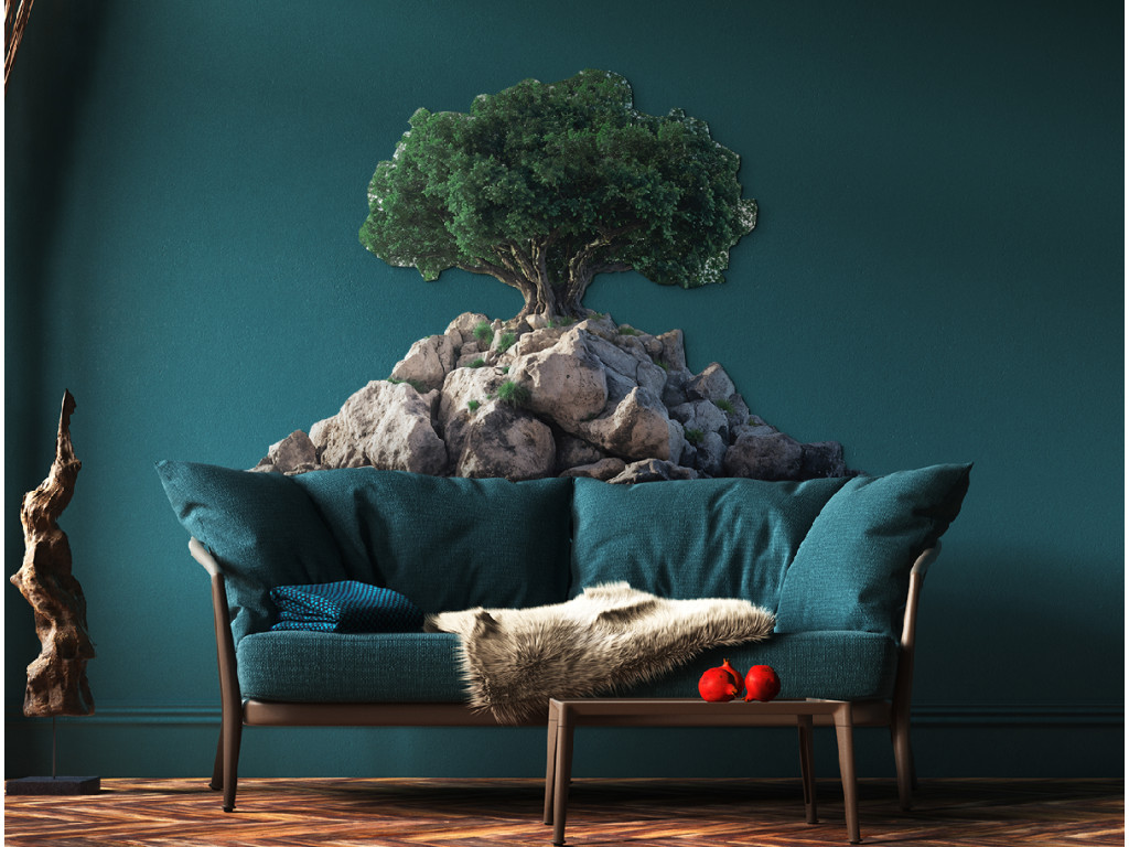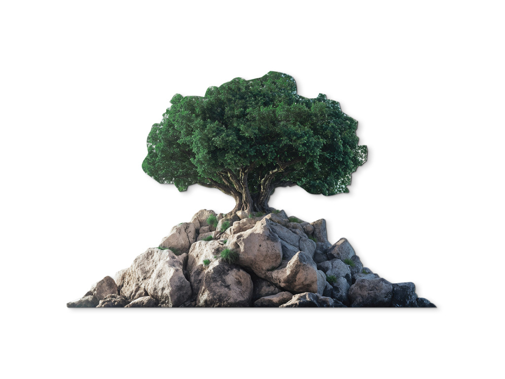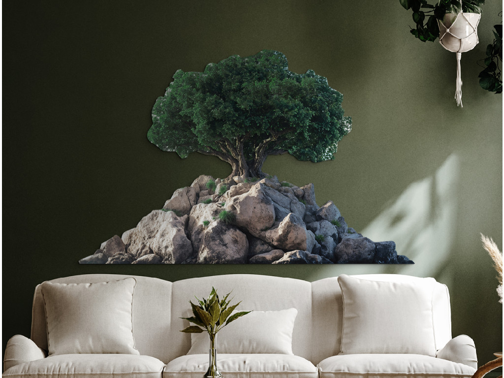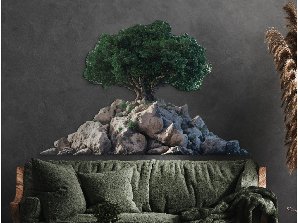 Der elegant geformte Bonsai auf felsigem Untergrund symbolisiert das Gleichgewicht zwischen Kraft und Ruhe. Der Kontrast zwischen der grünen Krone und dem weißen Hintergrund unterstreicht seine Details und natürliche Schönheit. Dieses Werk wirkt rein, ausgeglichen und meditativ und eignet sich ideal, um ein angenehmes Ambiente zu schaffen.