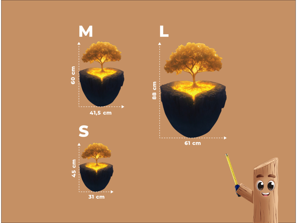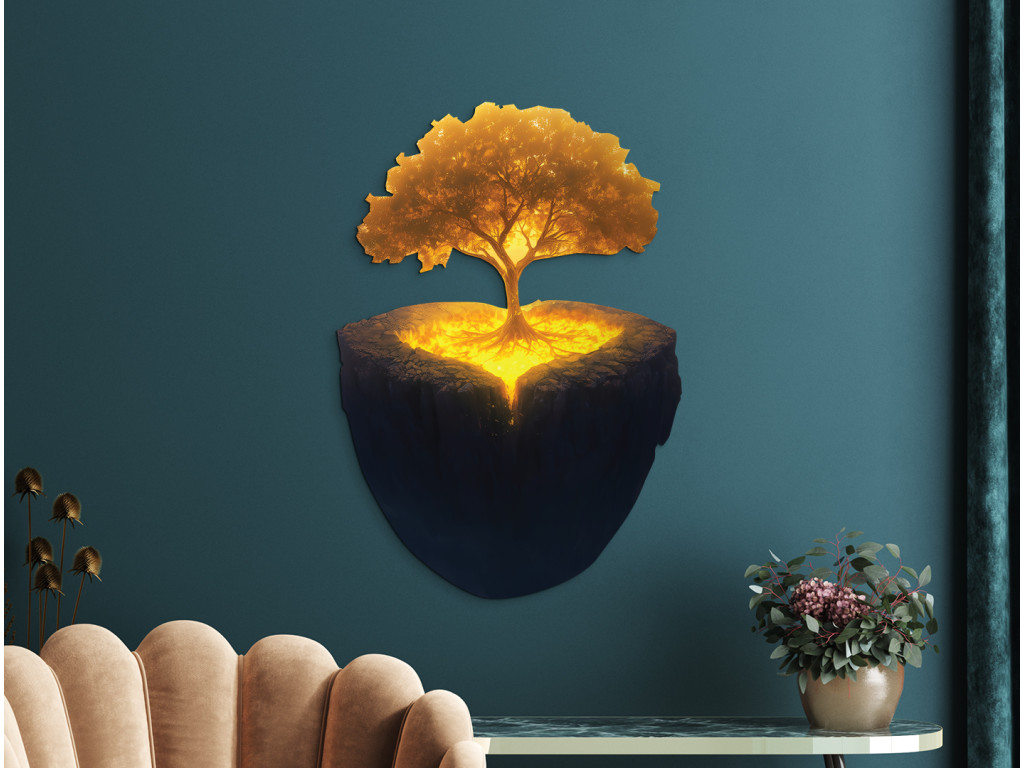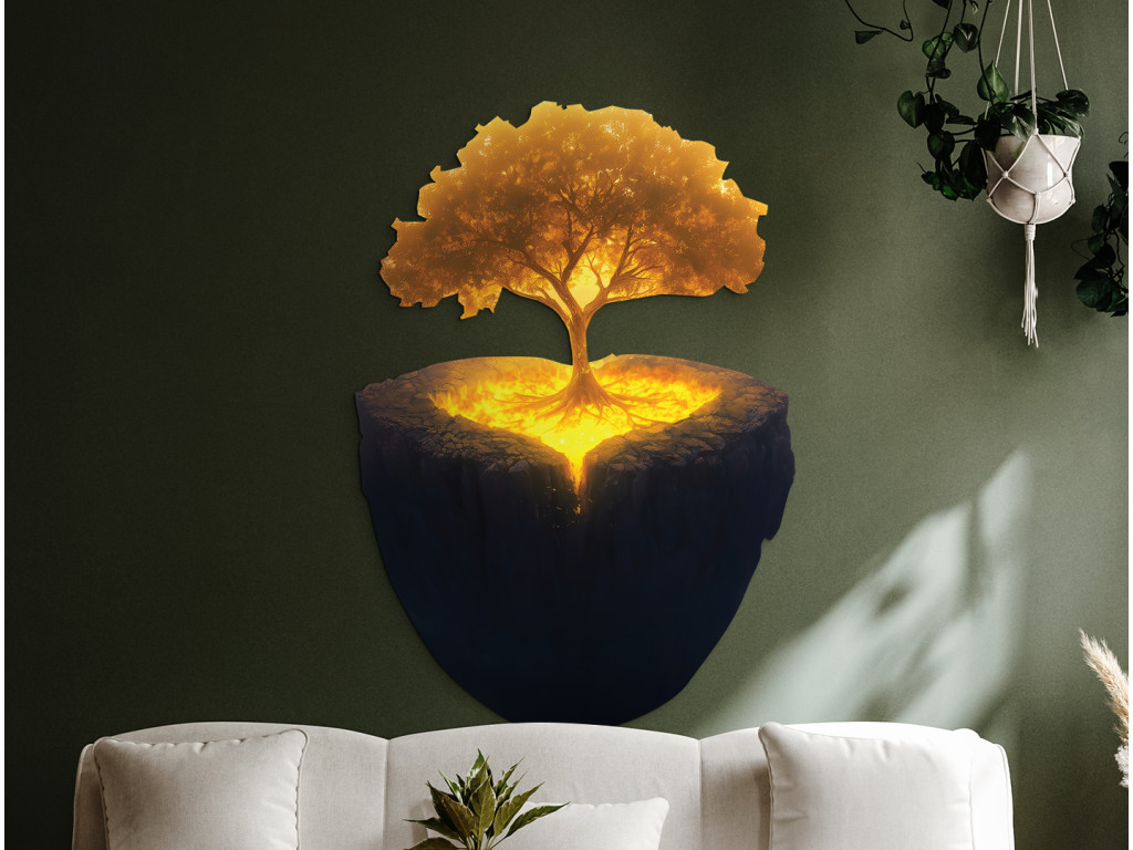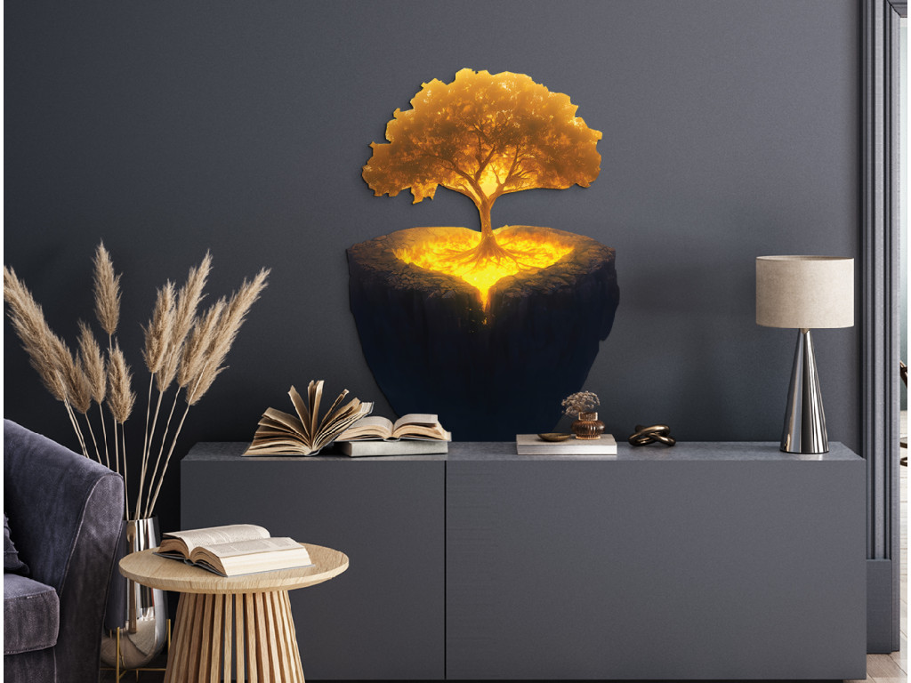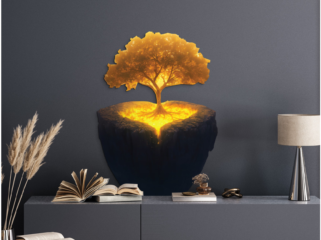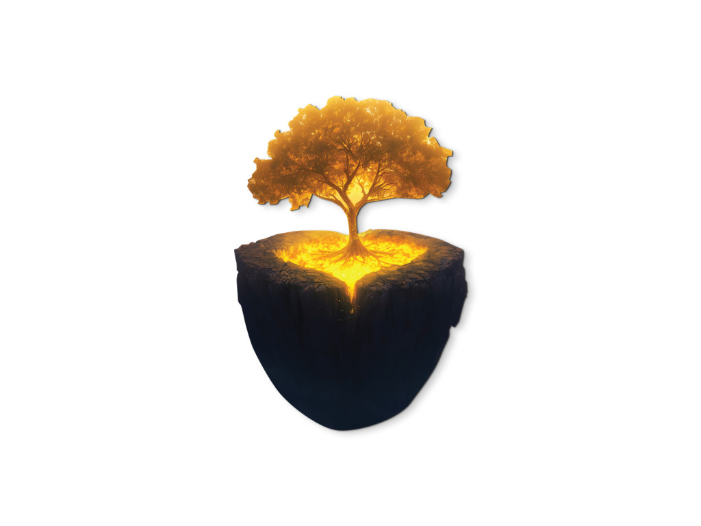 Das Bild zeigt einen goldenen Baum des Lebens, der aus einer dunklen, schwebenden Insel wächst. Seine leuchtenden Wurzeln verbreiten ein orange-gelbes Licht, das wie ein energetischer Kern des Lebens pulsiert. Der reine weiße Hintergrund verstärkt den Kontrast zwischen Licht und Dunkelheit und verleiht dem Werk eine minimalistische Kraft und symbolische Tiefe.