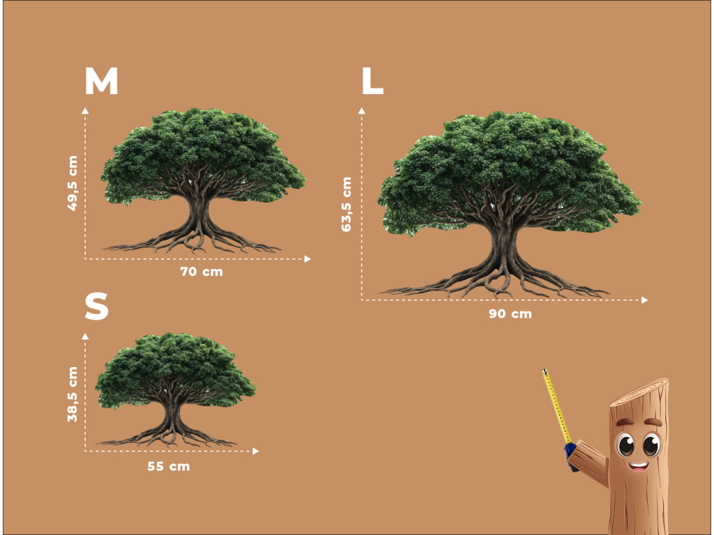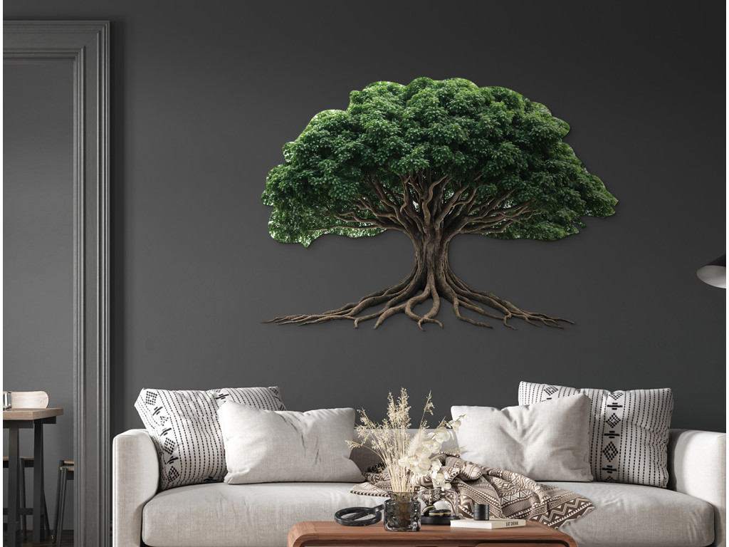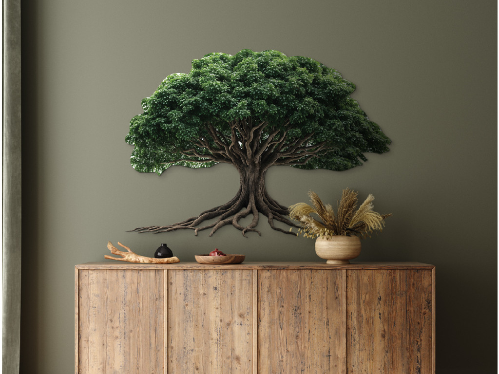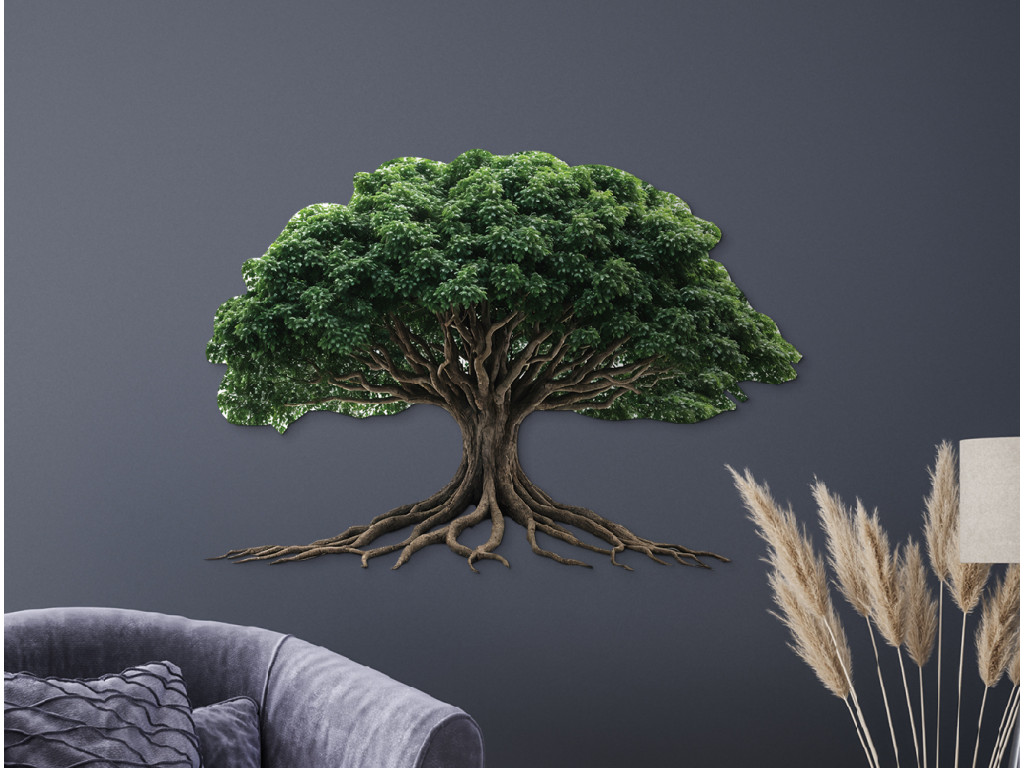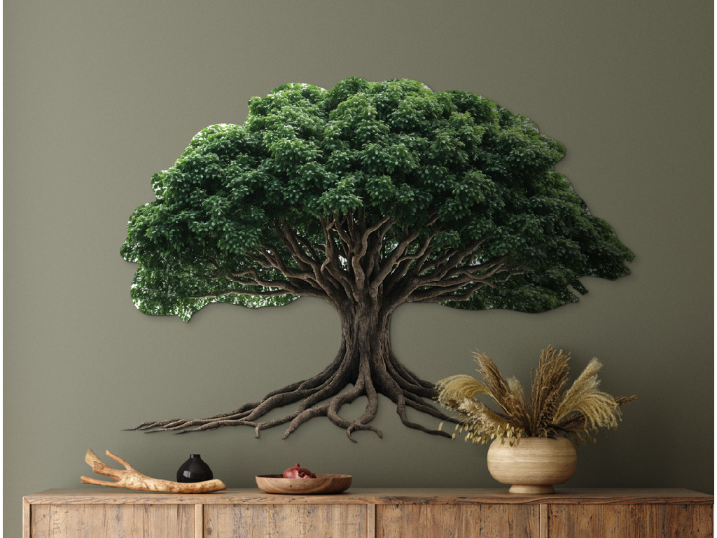 Das Wandkunstwerk zeigt einen Baum mit einer üppigen grünen Krone und verzweigten Wurzeln, die sich eindrucksvoll über die Wand erstrecken. Die Kraft des Baummotivs symbolisiert Stabilität und Verbundenheit mit der Erde. Eine ideale Ergänzung für Innenräume, die ein Gleichgewicht zwischen Natur und Ästhetik suchen.