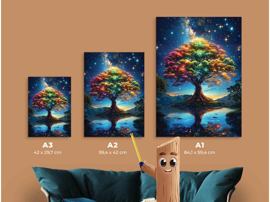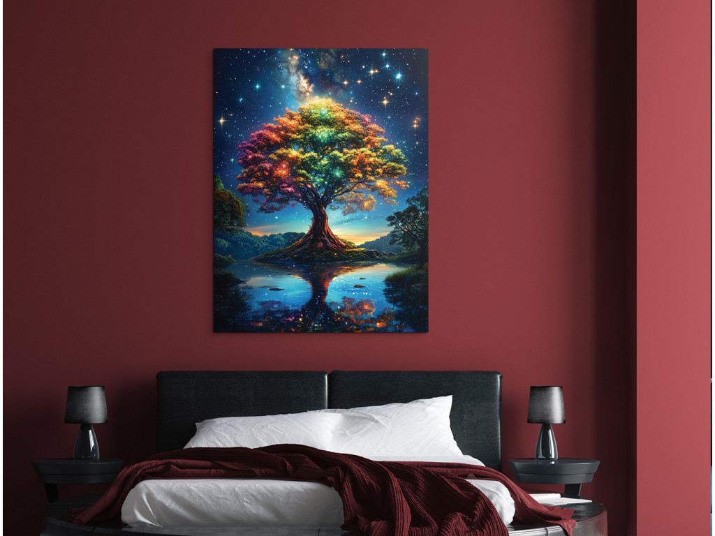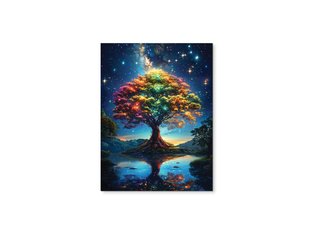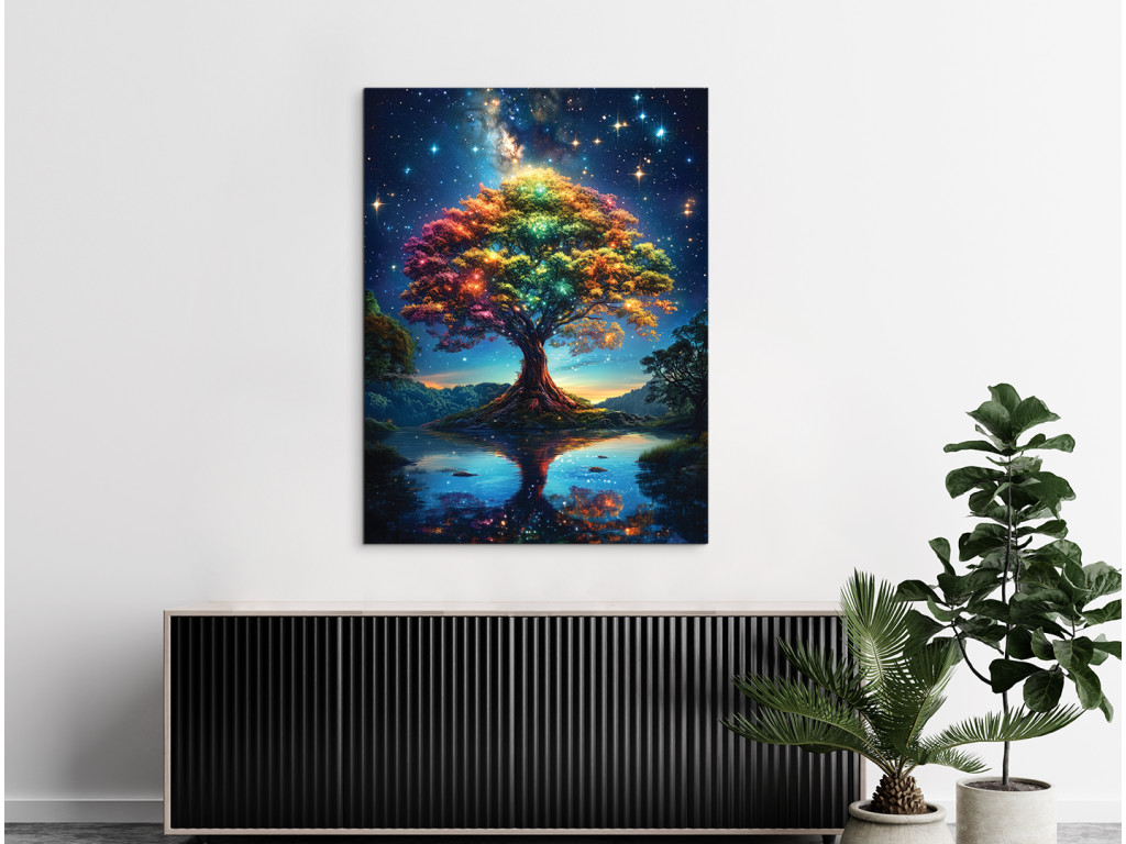 Der farbenfrohe Baum des Lebens vor dem Hintergrund des Sternenhimmels wirkt wie eine Brücke zwischen dem Universum und der Erde. Seine Silhouette spiegelt sich in der Wasseroberfläche wider und schafft so eine ruhige und traumhafte Komposition. Das Bild bringt Inspiration, Stille und eine spirituelle Dimension in den Raum.