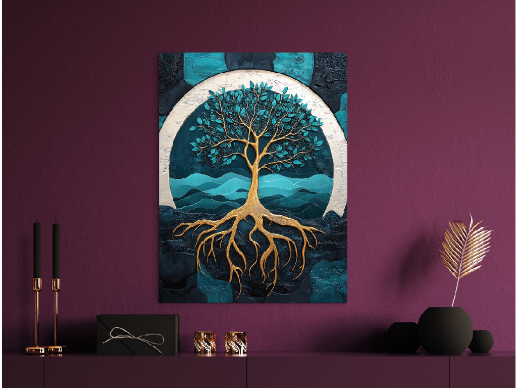Die markanten Wurzeln und die goldene Baumkrone bilden ein starkes Symbol für die Verbindung zwischen Himmel und Erde. Der türkisblaue Hintergrund mit sanften Bögen vermittelt ein Gefühl von Ruhe und Harmonie. Die Oberflächenstruktur und die goldenen Elemente verleihen dem Bild Tiefe, Kunstfertigkeit und natürliche Energie.
