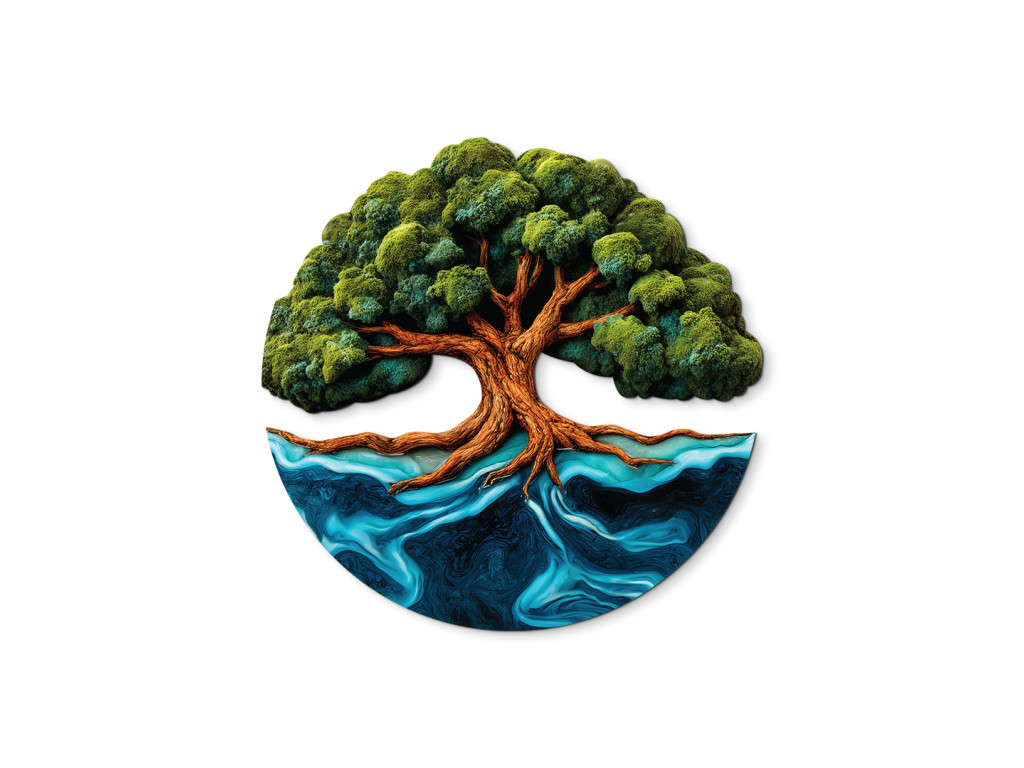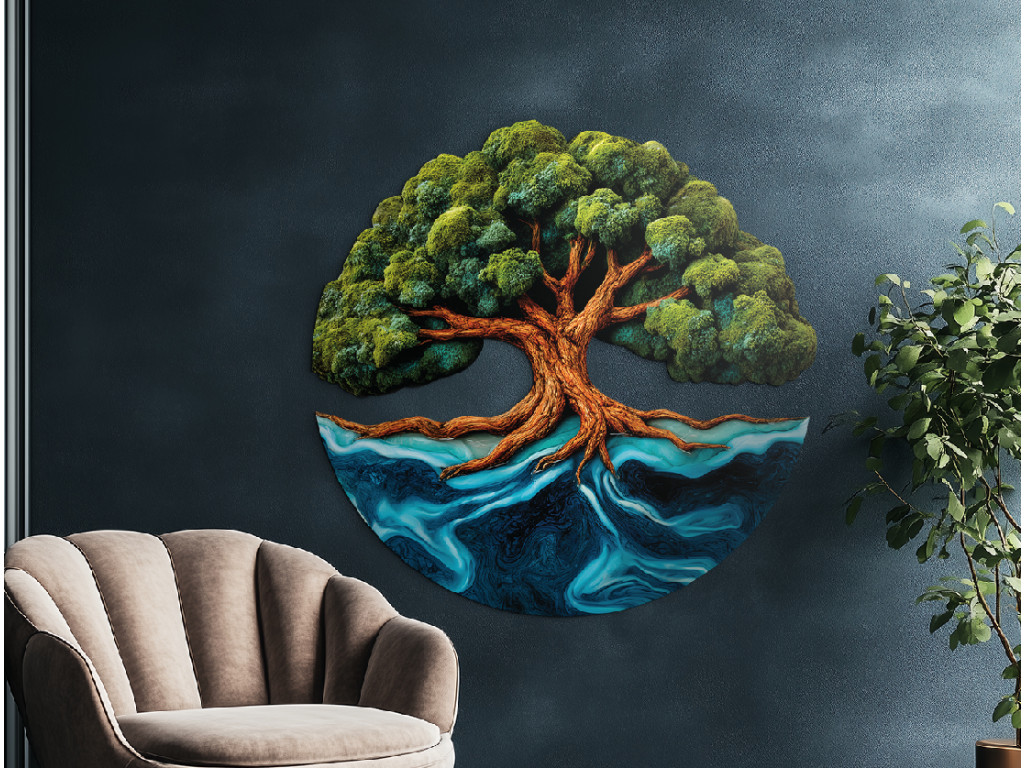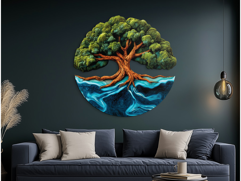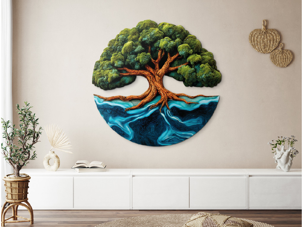 Der Mooslebensbaum Mächtigkeit ist ein originelles UV-gedrucktes Bild, das die Kraft der Natur mit moderner Technologie verbindet. Der dominante Stamm wächst zu einer üppigen Krone heran, die an lebendes Moos erinnert und frisch und natürlich wirkt. Seine verzweigten Wurzeln reichen bis ins Wasser und sehen aus wie Epoxidharz, wodurch ein einzigartiger Kontrast zwischen der Stabilität des Baumes und der Fließfähigkeit der Elemente entsteht.