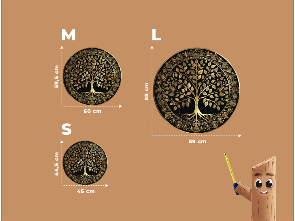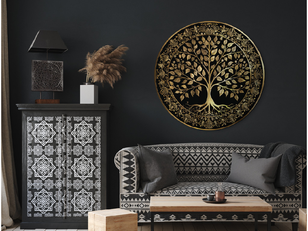 Elegante runde Dekoration mit dem Motiv Baum des Lebens in Goldfarbe auf schwarzem Hintergrund. Der Baum mit seiner üppigen Krone und den verzweigten Wurzeln ist von einem ornamentalen Rand mit Blumenmustern umgeben, was dem Werk einen luxuriösen und symbolischen Charakter verleiht. Ideal als auffälliges Element in modernen und klassischen Innenräumen.