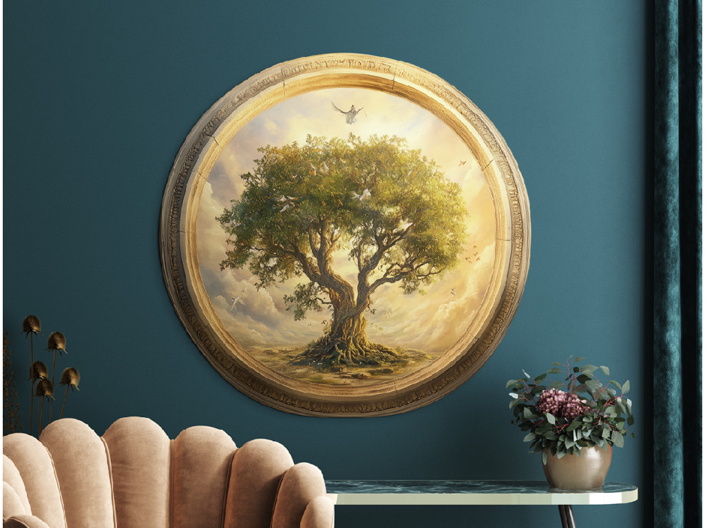 Das runde Bild im Stil eines antiken Medaillons zeigt den Baum des Lebens mit einer grünen Krone und reich verzweigten Wurzeln. Im Hintergrund schweben Vögel am Himmel, von denen einer an eine Friedenstaube erinnert. Das Ganze wird durch einen verzierten Rahmen in Goldtönen abgerundet, der elegant und zeitlos wirkt.