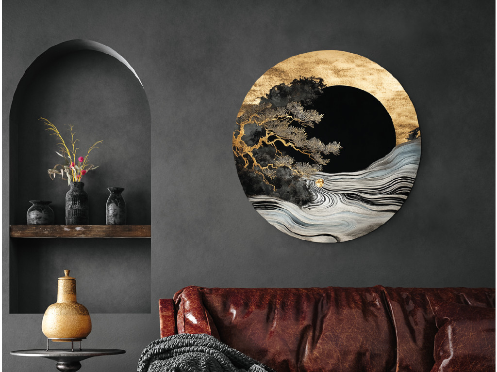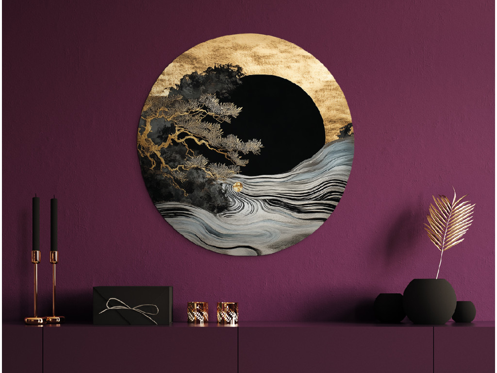 Die runde Wanddekoration „Baum des Lebens“ zeigt eine stilisierte Landschaft mit einer Kiefer, einer ruhigen Wasseroberfläche und einem abstrakten schwarzen Kreis, der an den Mond oder die Sonne erinnert. Die Kombination aus goldenen und dunklen Farbtönen verleiht dem Werk einen eleganten, luxuriösen Charakter.