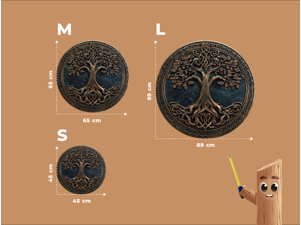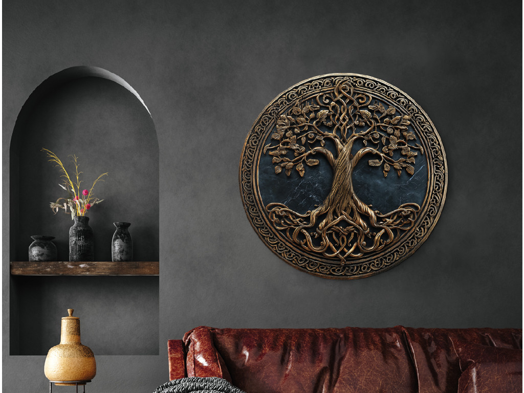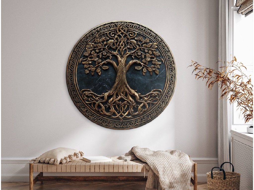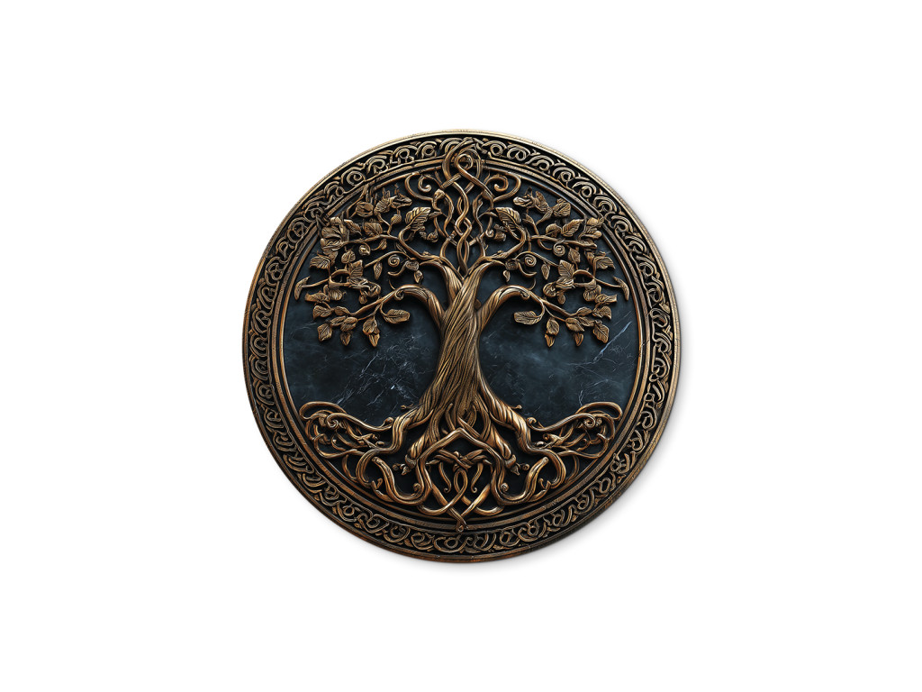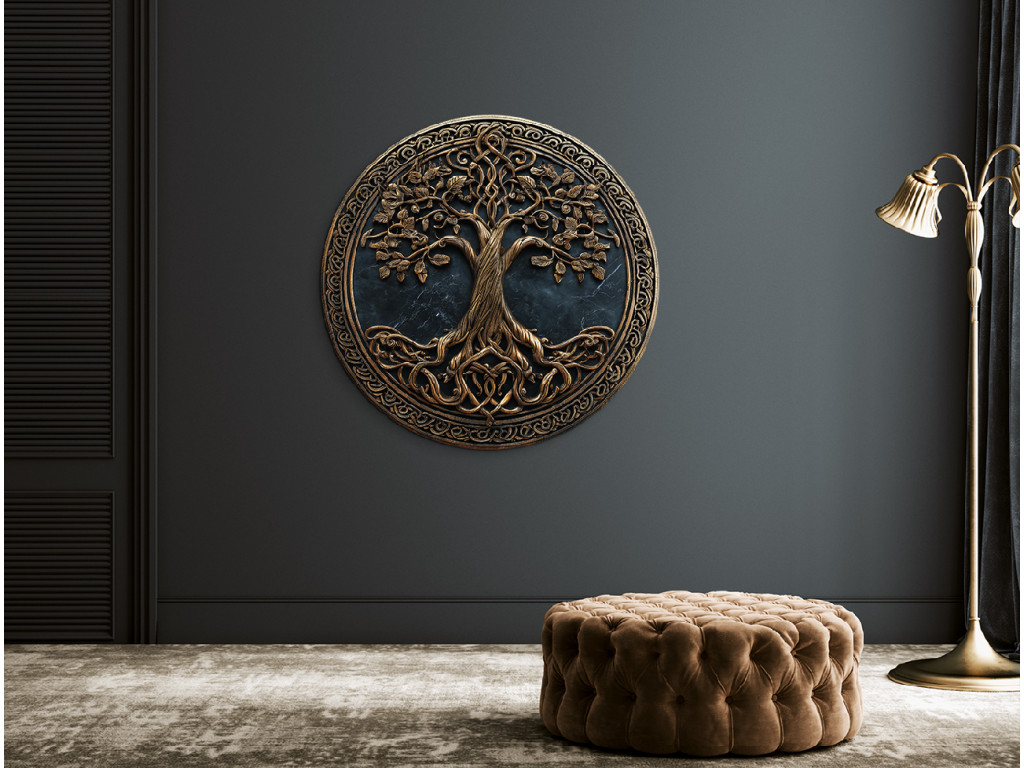 Der runde Baum des Lebens Wurzeln der Kraft wirkt robust und kunstvoll. Goldfarbene Äste, Blätter und verflochtene Wurzeln heben sich vom dunklen Marmorhintergrund ab, während der ornamentale Rand mit keltischen Knoten den mystischen Charakter und die zeitlose Symbolik der Verbundenheit unterstreicht.