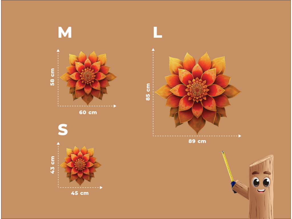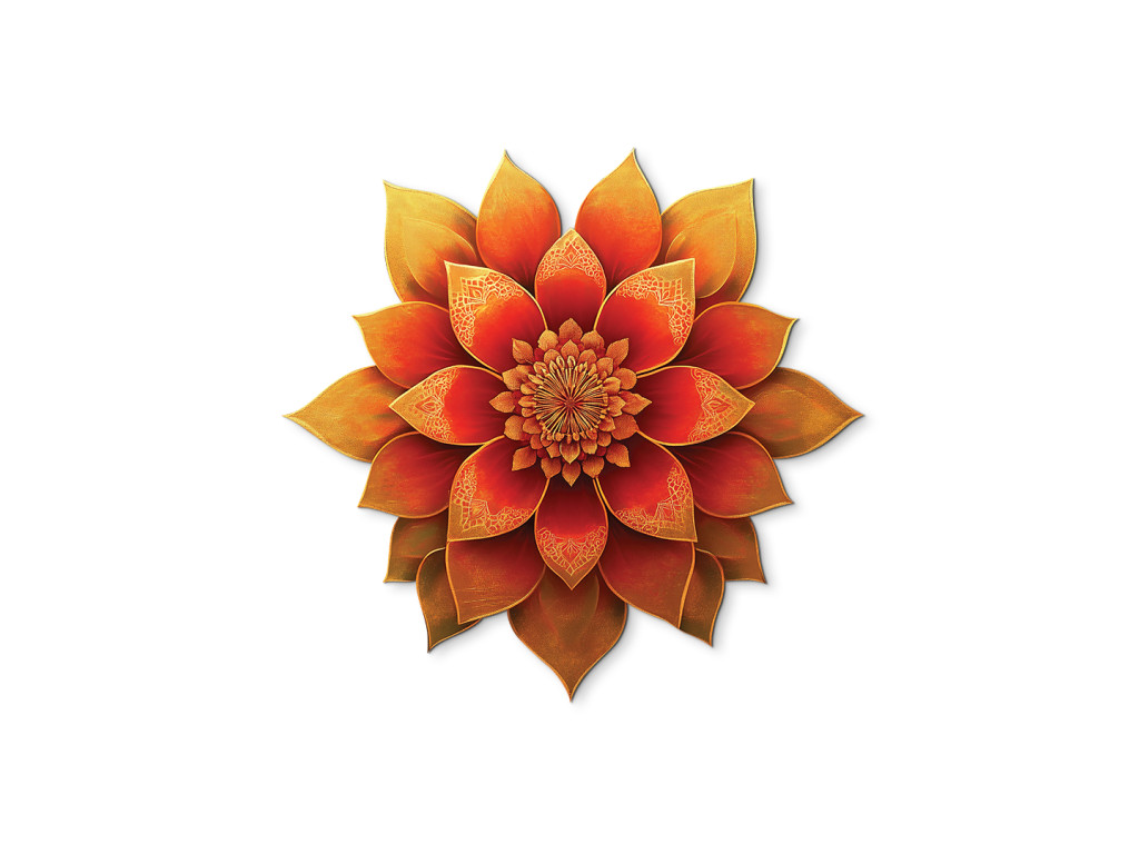 Das Mandala in satten Orangetönen strahlt Wärme, Kreativität und Wohlbefinden aus. Es erinnert an den Sonnenuntergang und schafft eine Atmosphäre innerer Harmonie und Ruhe.