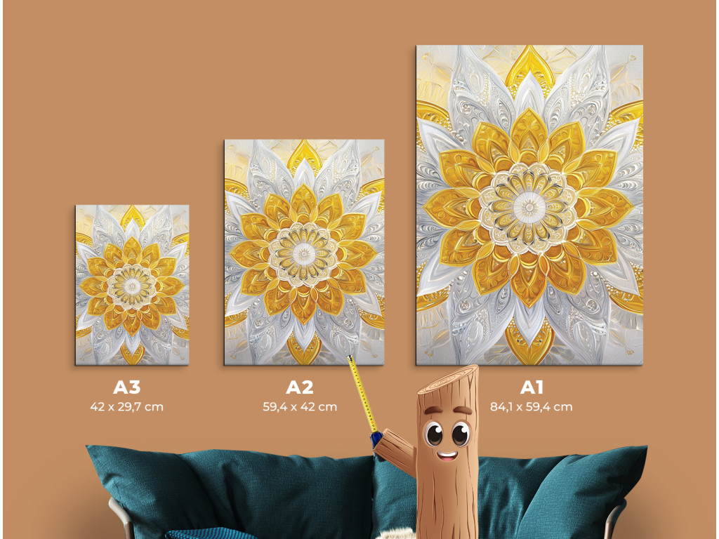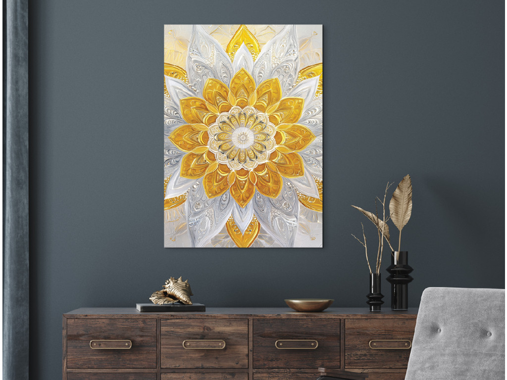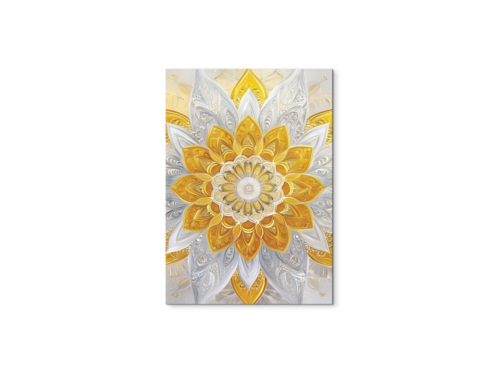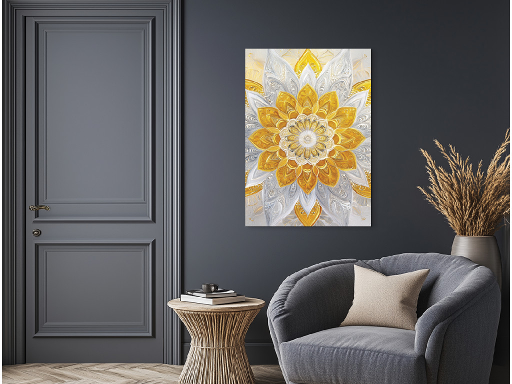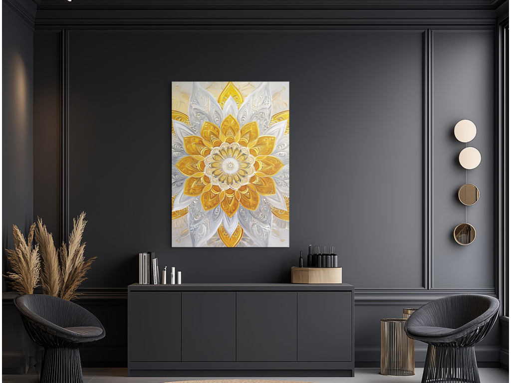 Das vertikal ausgerichtete Mandala Goldener Strahl zeigt ein reichhaltiges Blumenmotiv in einer Kombination aus Gold-, Weiß- und Silbergrau. Das symmetrische Design und die leuchtenden Farben bilden einen harmonischen Kontrast, der besonders in modernen und eleganten Innenräumen zur Geltung kommt.