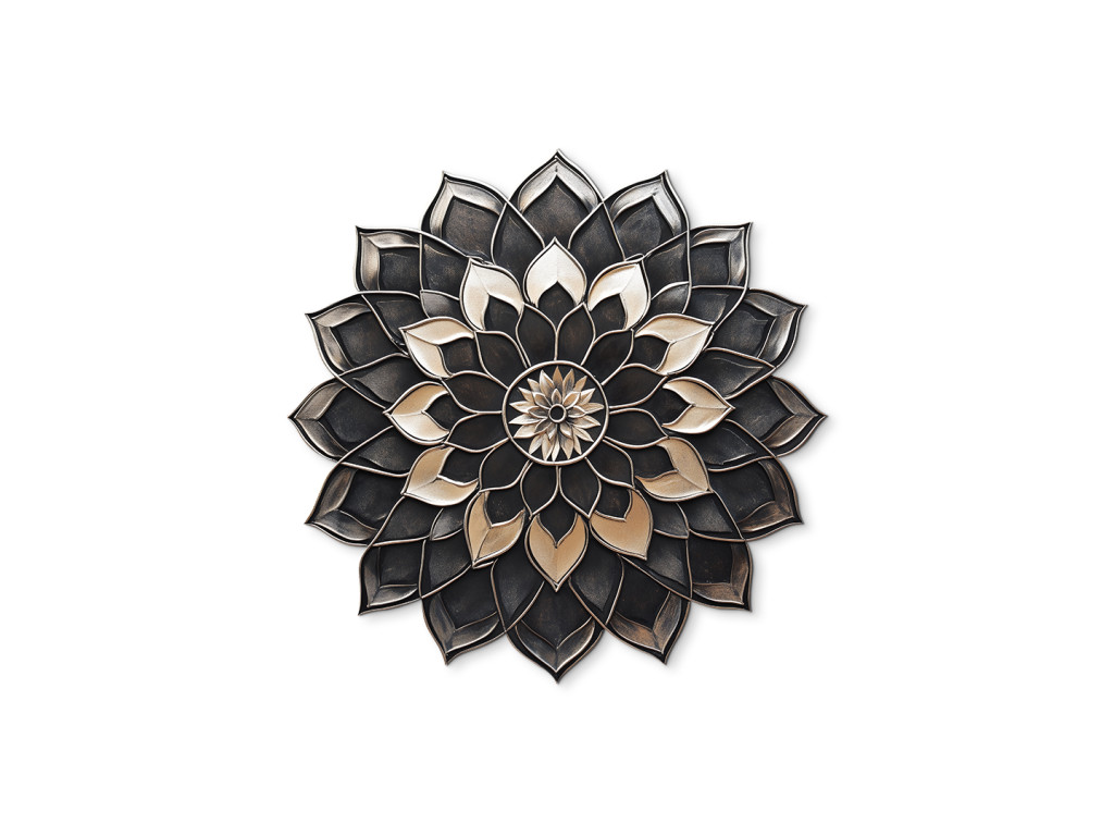 Die elegante runde Dekoration mit geschichteten Blütenblättern vermittelt den Eindruck einer strahlenden Sonne. Die dunklen Außen- und glänzenden Innenbereiche sorgen für Kontrast und Tiefe, während das zentrale Blumendetail den künstlerischen Ausdruck verstärkt. Eine großartige Wahl für eine stilvolle Belebung Ihres Ambientes.
