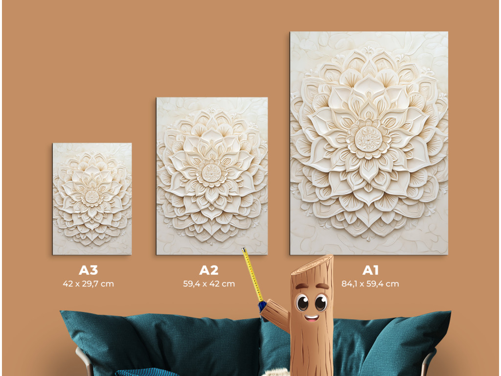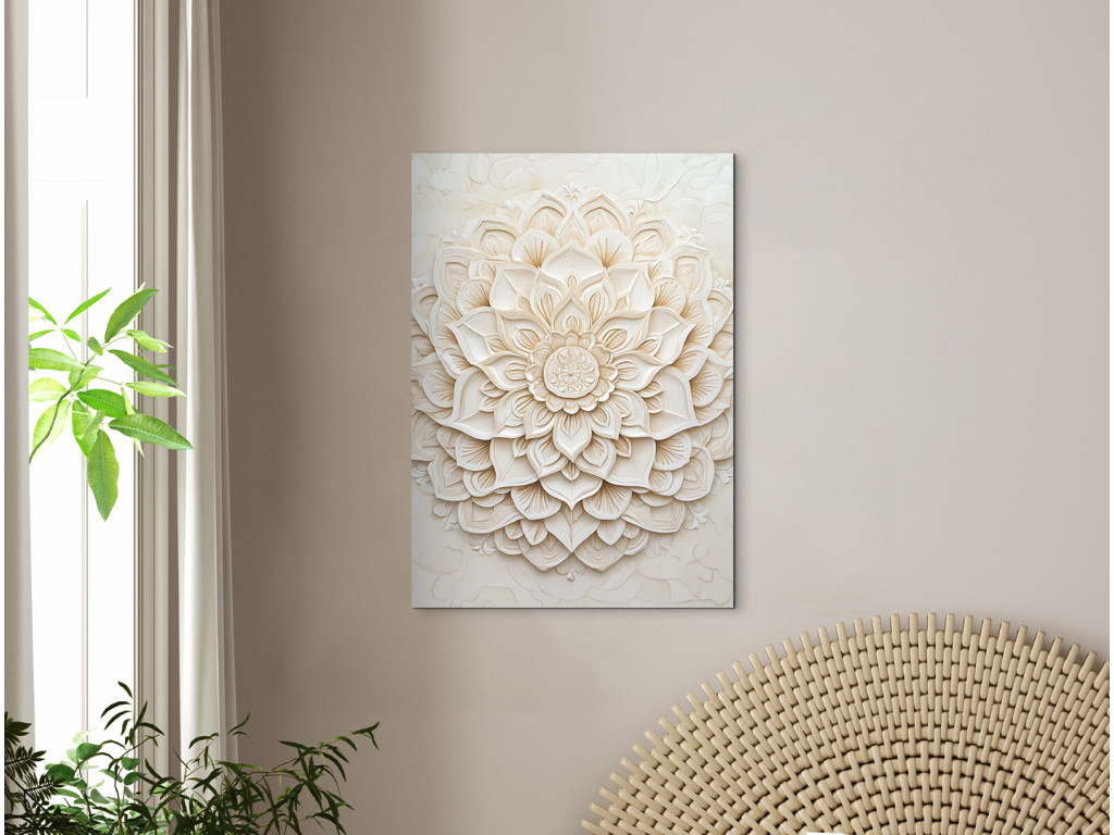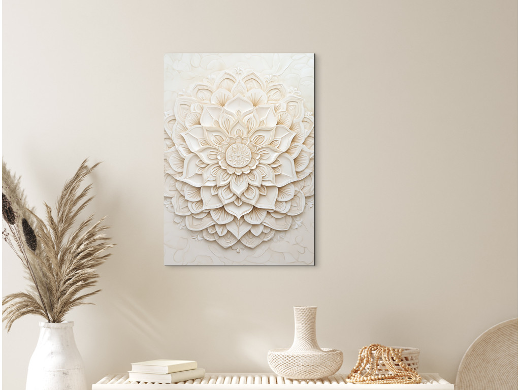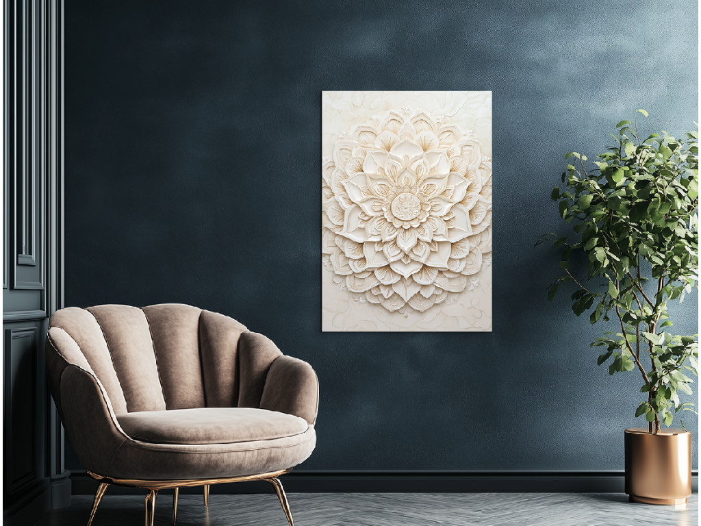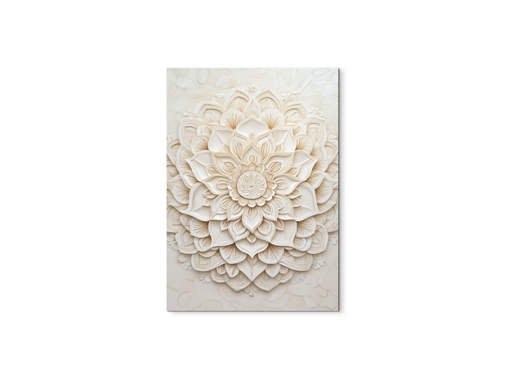Die elegante weiße Mandala Blume der Ruhe mit ihren reich geschichteten Blütenblättern erzeugt einen sanften 3D-Effekt und eine harmonische Symmetrie. Zarte Schatten betonen die detaillierte Struktur und verleihen dem Bild Tiefe. Die hellen, neutralen Farbtöne wirken beruhigend und luftig.