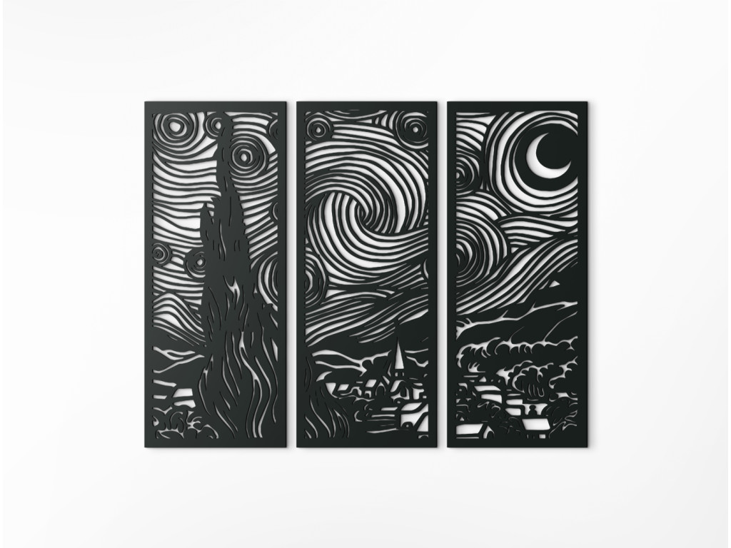 Das dreiteilige Holzbild Sternennacht des Malers Vincent van Gogh ist ein Bild für Anspruchsvolle. Die klassische Darstellung eines Dorfes mit modernen Elementen sorgt für eine elegant aussehende Wand Ihres Wohn- oder Schlafzimmers.