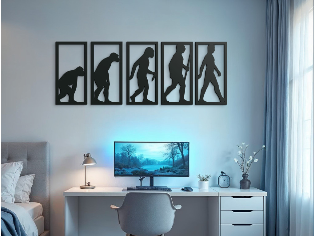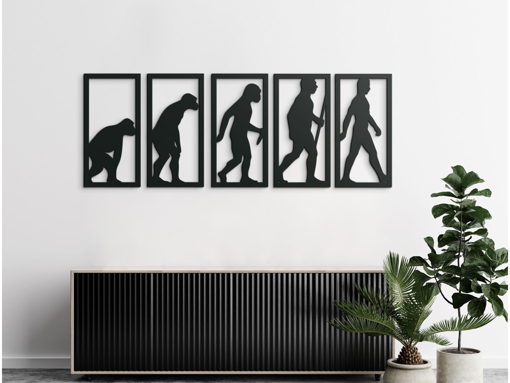 Das mehrteilige Bild Evolution symbolisiert die lange Reise des Menschen von den primitiven Vorfahren bis zur modernen Existenz. Jeder Teil hebt eine andere Phase des Fortschritts hervor und schafft so eine beeindruckende, zusammenhängende Geschichte. Diese einzigartige Assemblage ist ein eindrucksvolles visuelles Element, das zum Nachdenken über unsere gemeinsame Vergangenheit anregt.