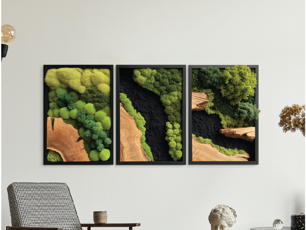 Das dreiteilige Moosbild Tiefe bringt eine perfekte Imitation von lebendem Moos in Ihr Zuhause. Dank moderner UV-Technologie erhalten Sie einen realistischen 3D-Effekt, der keine Pflege benötigt. Dieses Bild behält über Jahre hinweg sein frisches Aussehen und kostet weniger als klassische Moosbilder. Wählen Sie ein originelles Stück, das die Schönheit der Natur mit Zweckmäßigkeit verbindet.