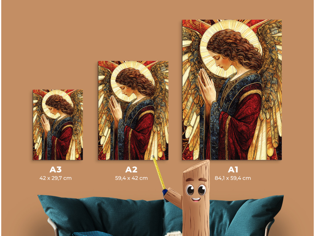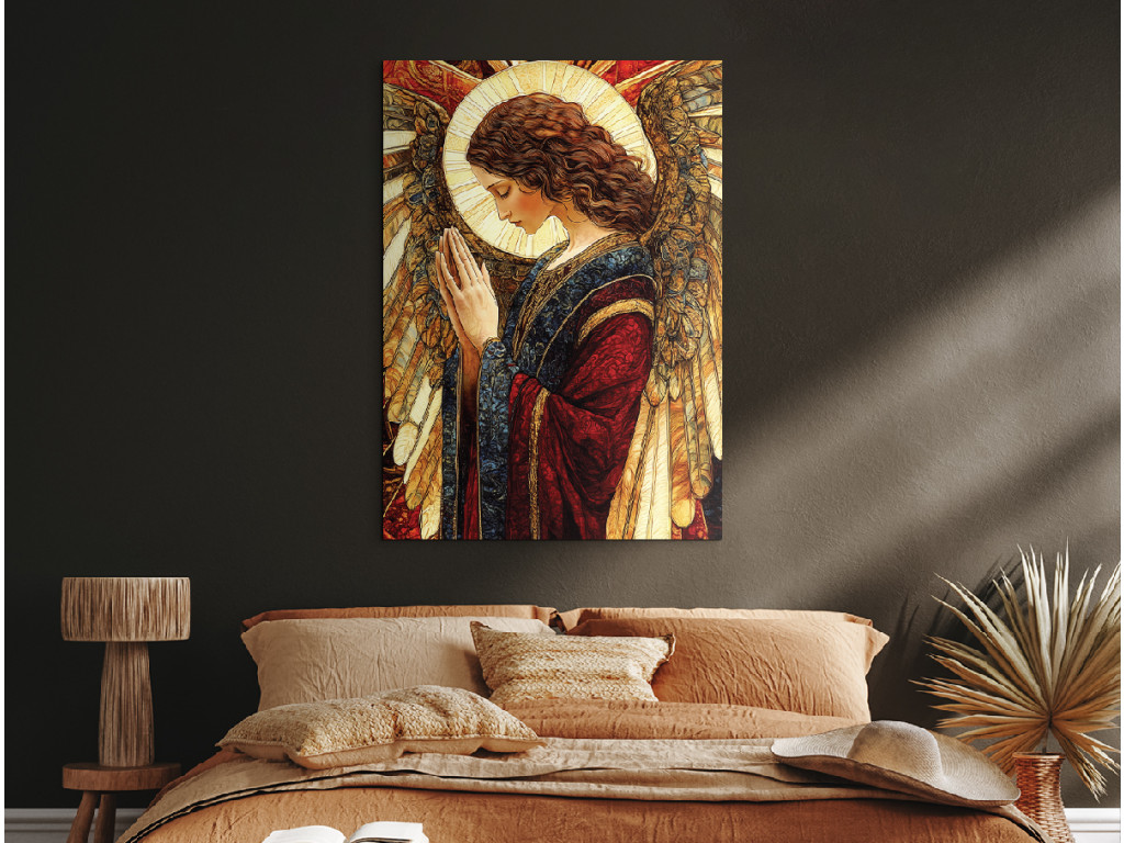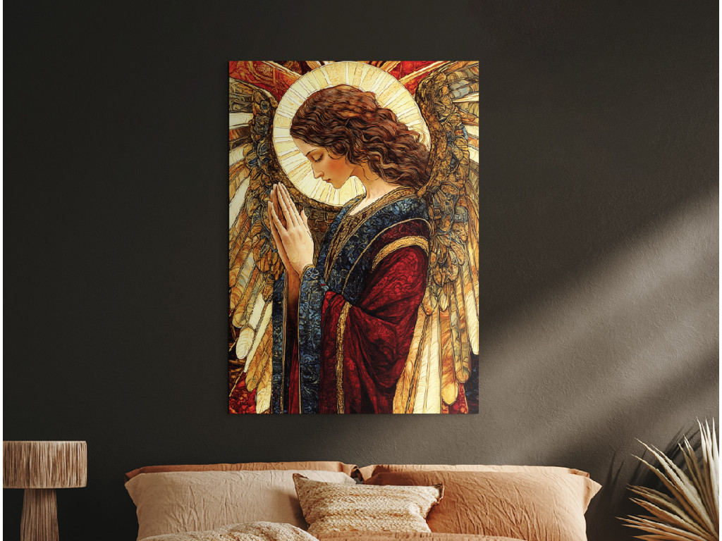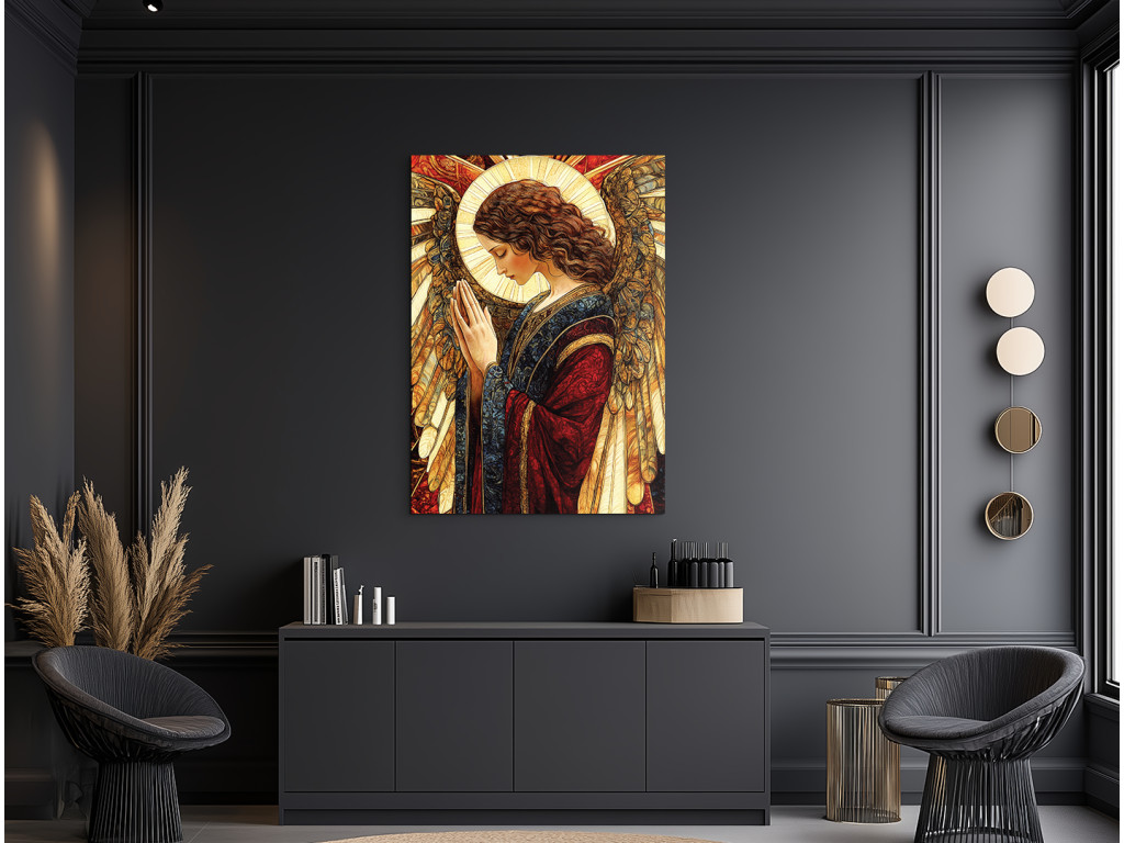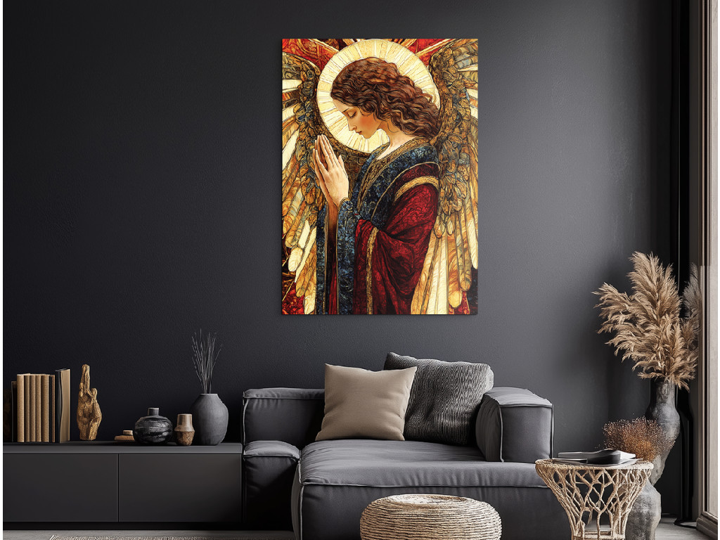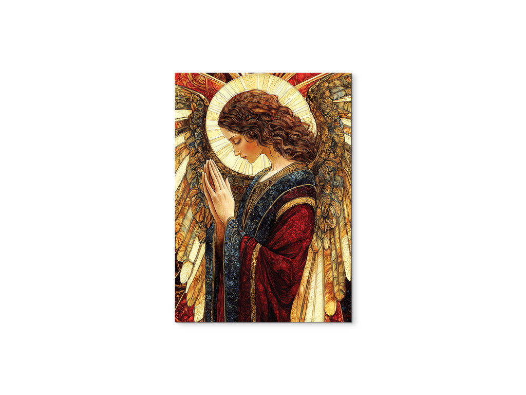 Das Bild zeigt einen Engel in einem beeindruckenden blau-roten Gewand, das Frieden und Kraft symbolisiert. Die Gestalt des Engels strahlt ein sanftes Licht aus und wirkt wie ein schützendes und friedfertiges Symbol, das ein Gefühl von Ruhe, Glauben und Ausgeglichenheit vermittelt.