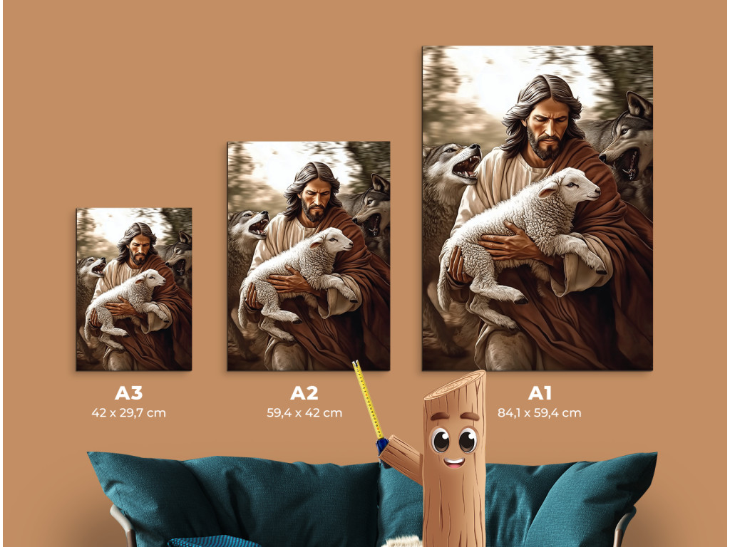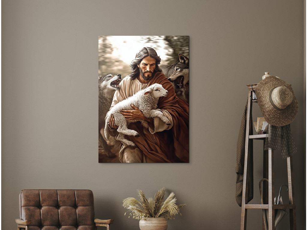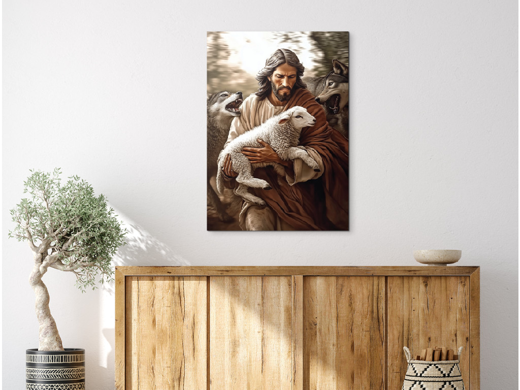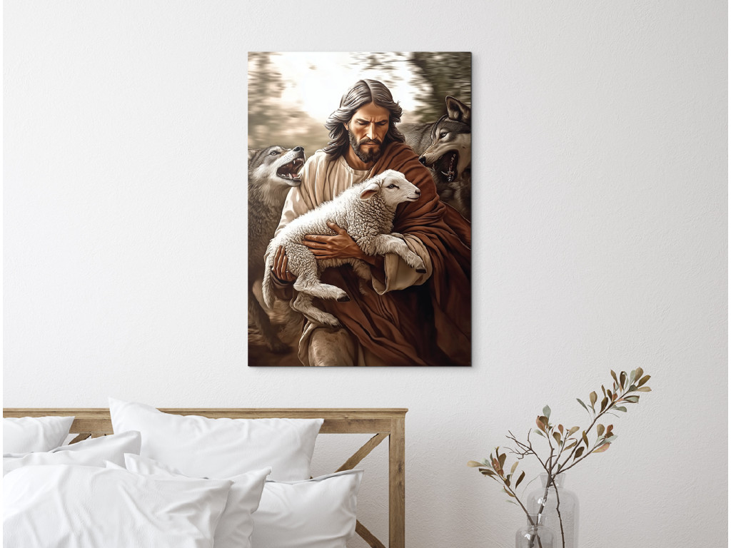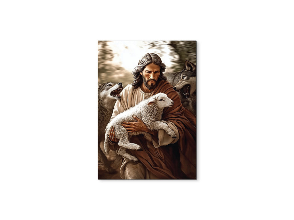 Das Kunstwerk zeigt Jesus Christus, wie er mit Gelassenheit und Entschlossenheit ein Lamm umarmt, das er vor den räuberischen Wölfen schützt, die in der Umgebung lauern. Die Szene symbolisiert die unerschütterliche Liebe, Opferbereitschaft und den Schutz, den Christus den Schwachen und Schutzlosen bietet. Der Kontrast zwischen der ruhigen Gestalt Jesu und der bedrohlichen Umgebung spiegelt den Kampf zwischen Licht und Dunkelheit wider.
