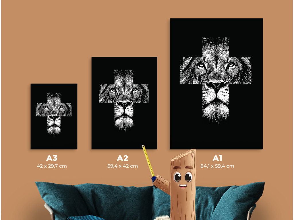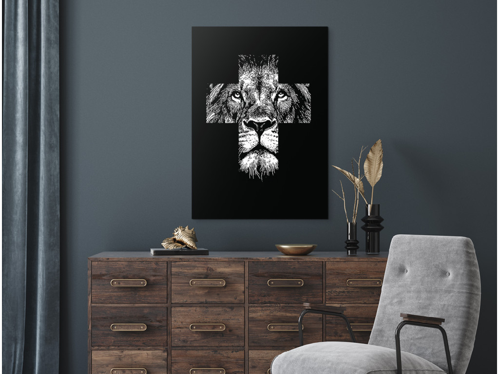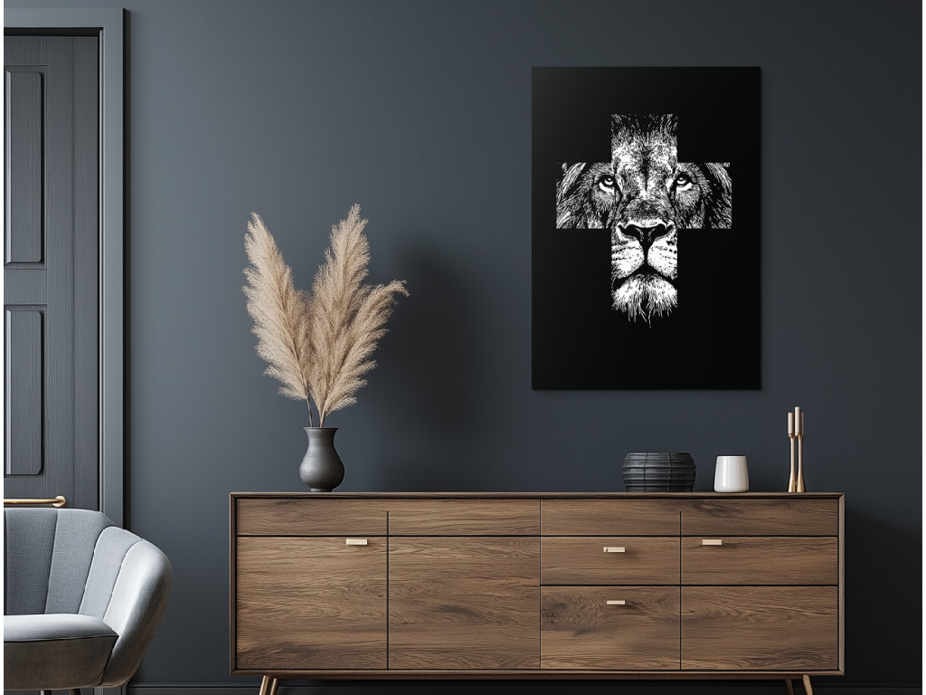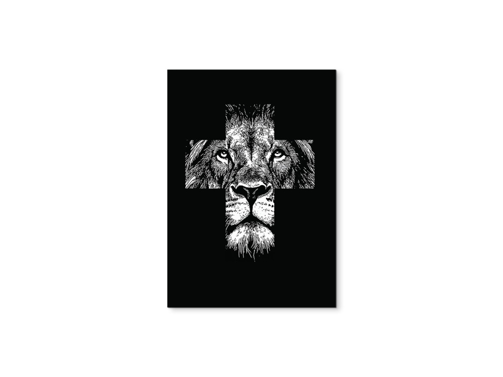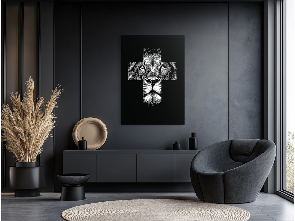 Das minimalistische Schwarz-Weiß-Bild Kraft des Glaubens verbindet das Gesicht eines Löwen – Symbol für Kraft und Mut – mit dem christlichen Motiv des Kreuzes. Die weiße Textur auf schwarzem Hintergrund bildet einen starken Kontrast, der die Details des Ausdrucks und die symbolische Komposition hervorhebt. Es handelt sich um ein modernes spirituelles Werk, das Glauben mit innerer Kraft verbindet.