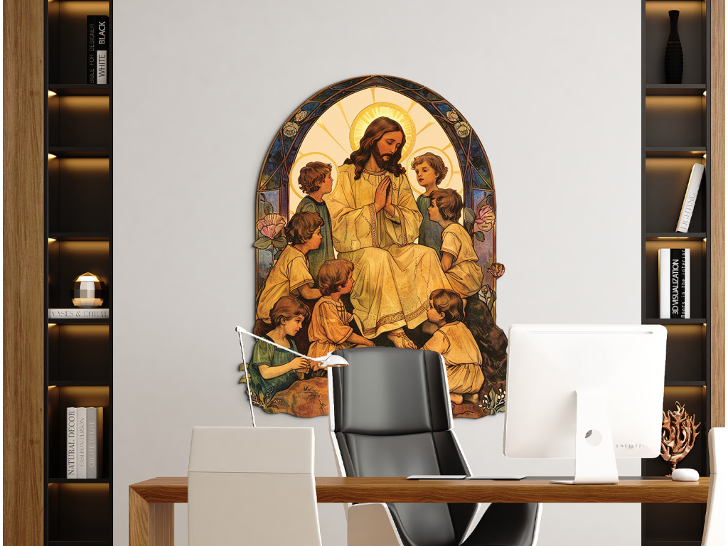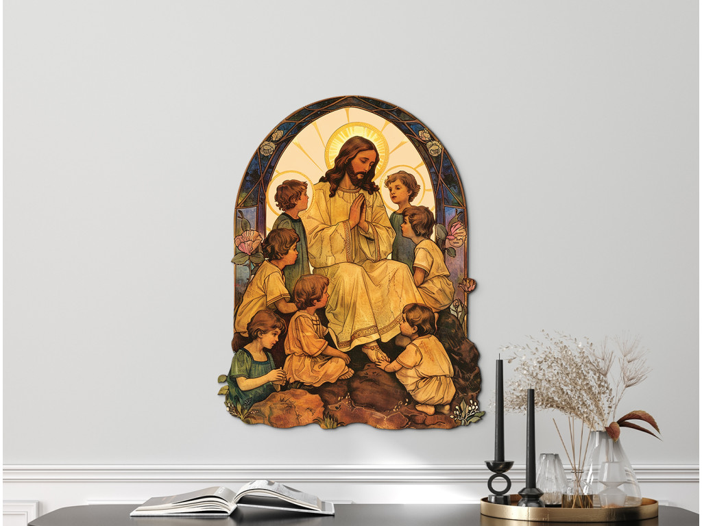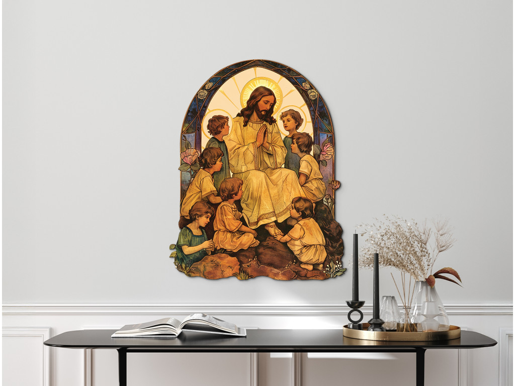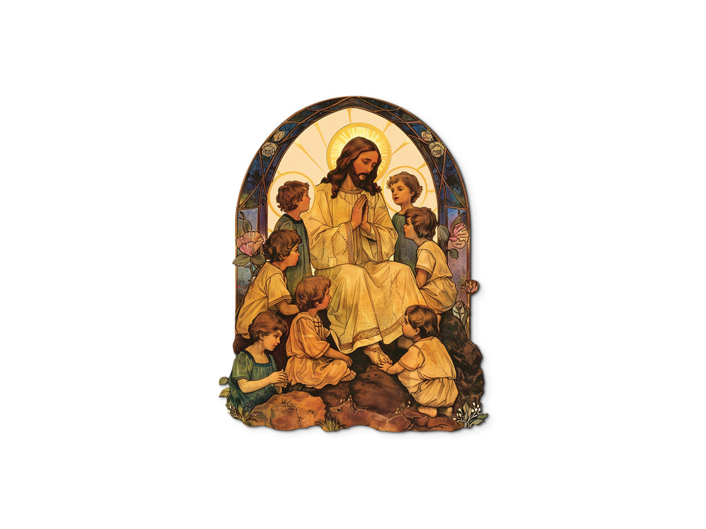 Das Bild zeigt Jesus Christus, wie er inmitten einer Gruppe von Kindern sitzt, in einem Stil, der an Glasmalerei oder Glasbilder erinnert. Jesus mit Heiligenschein hat die Hände zum Gebet oder Segen gefaltet, während die Kinder, die um ihn herum sitzen, ehrfürchtig und vertrauensvoll in sein Gesicht blicken. Der gewölbte Hintergrund mit farbigen Details unterstreicht den sakralen und friedlichen Charakter der Szene, die an die Worte der Bibel erinnert: „Lasst die Kinder zu mir kommen; hindert sie nicht daran! Denn Menschen wie ihnen gehört das Reich Gottes.“
