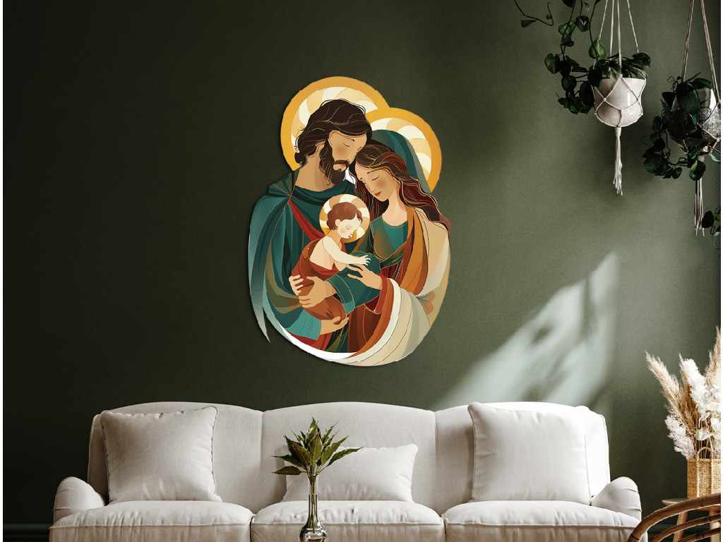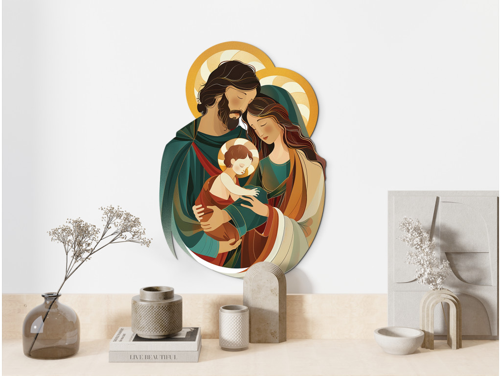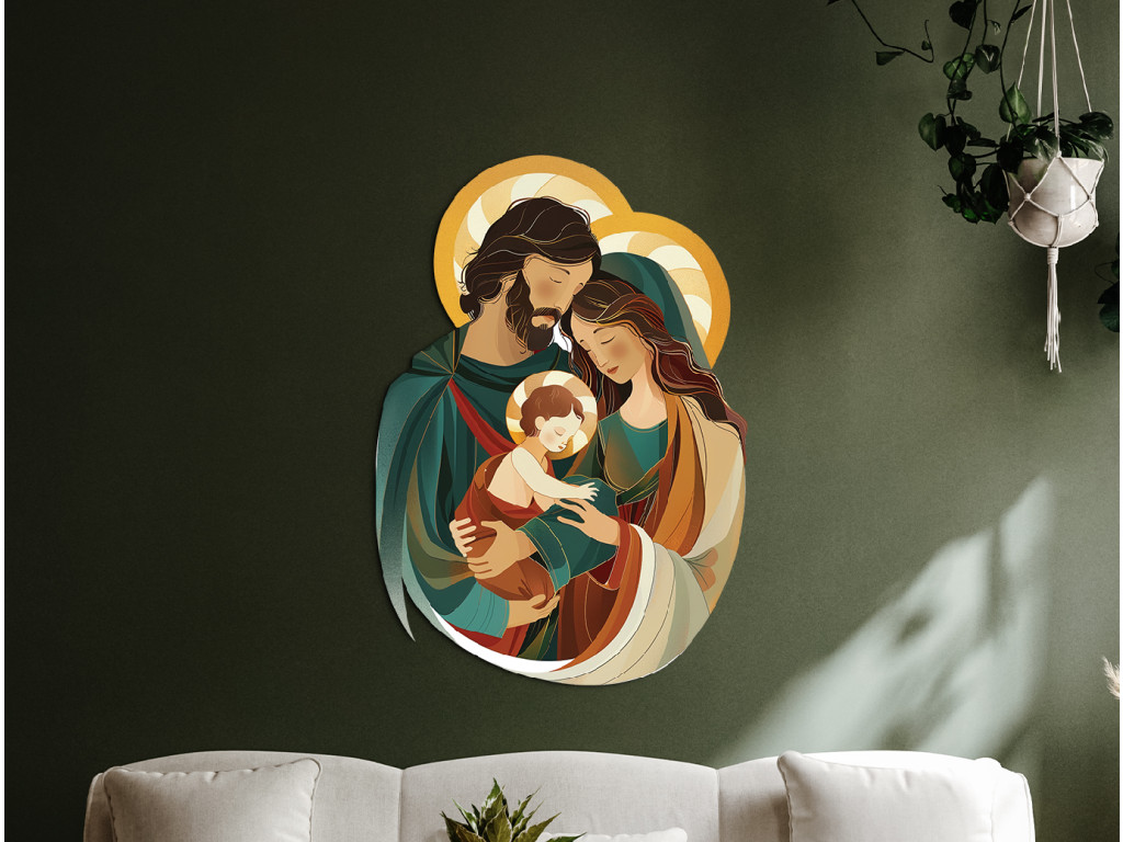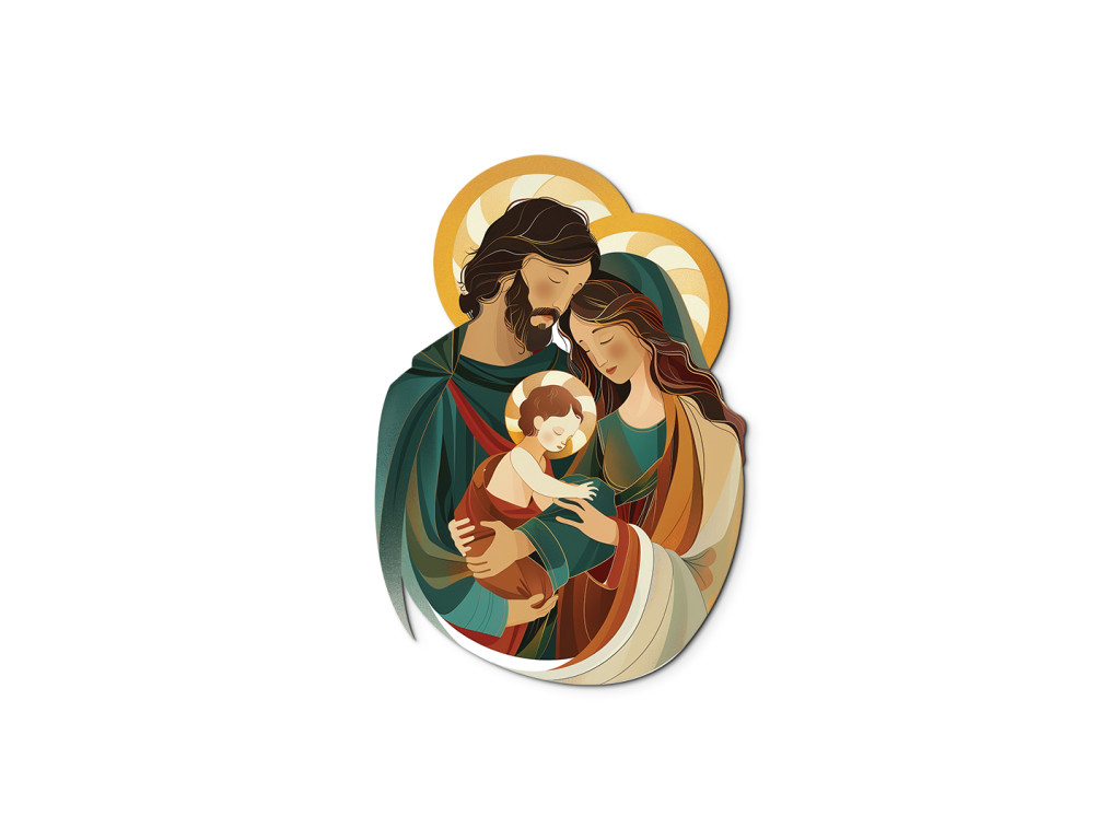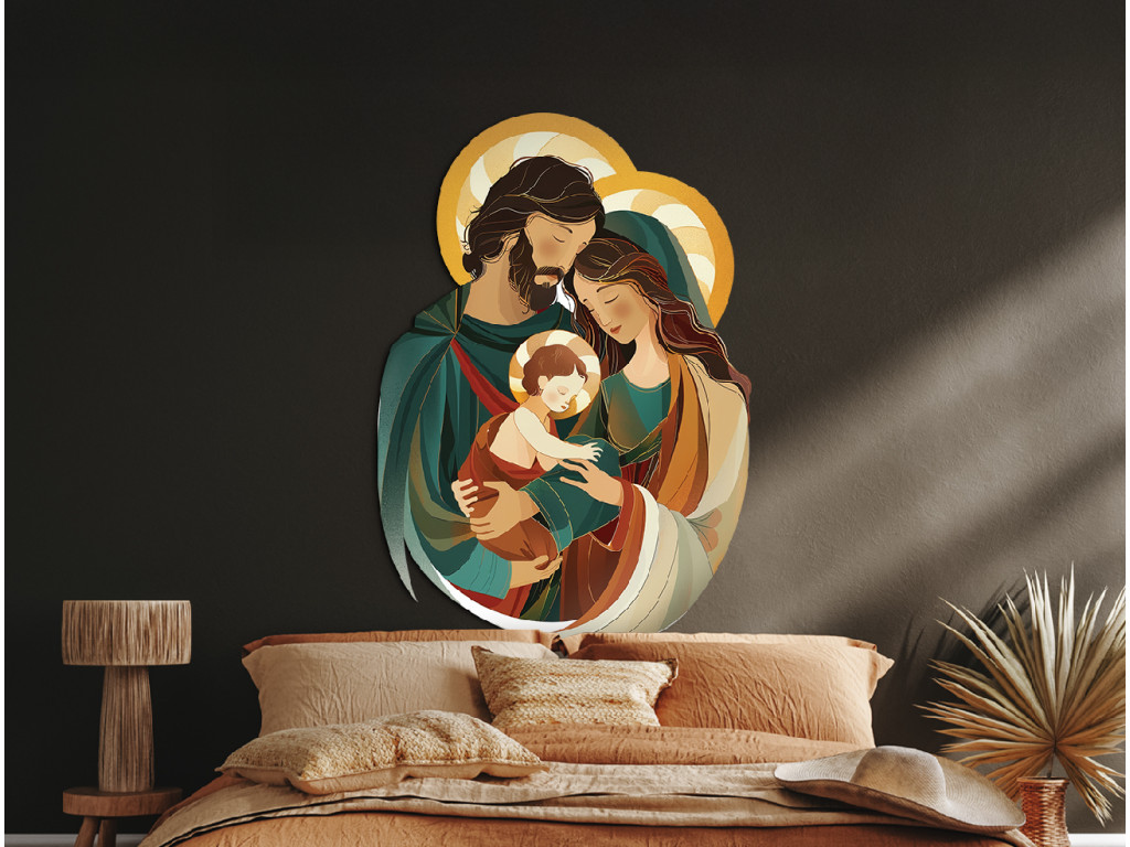Das Bild zeigt eine moderne, stilisierte Darstellung der Heiligen Familie – der Jungfrau Maria, des Heiligen Josef und des Jesuskindes – in einer zärtlichen und harmonischen Umarmung. Josef umarmt Maria mit dem Jesuskind im Arm, wodurch das Bild Wärme, Ruhe und Einheit ausstrahlt. Die sanften Farben und vereinfachten Formen machen diese Szene zu einem liebevollen und friedlichen Motiv, das sich auch für ein Kinderzimmer oder einen Familienraum eignet.