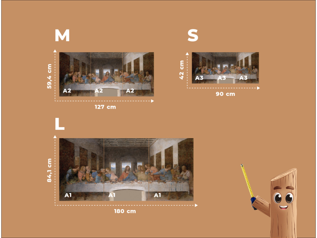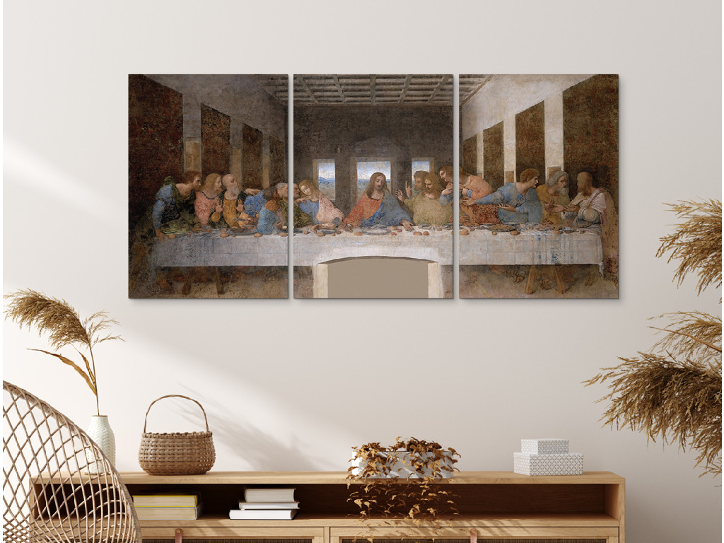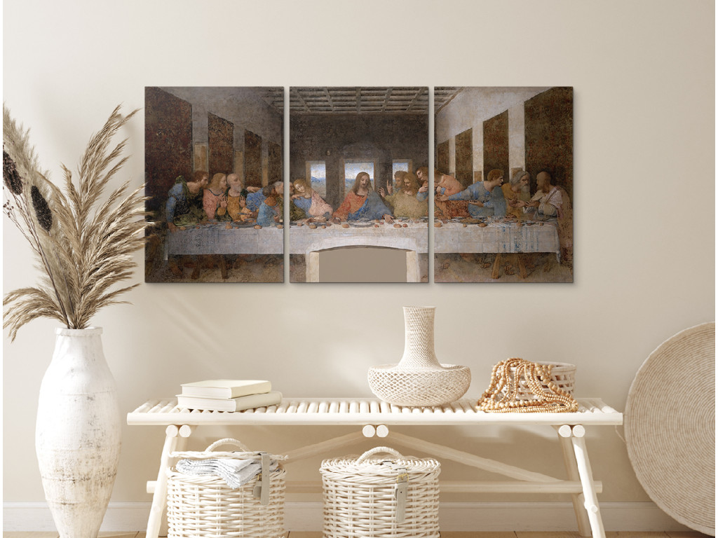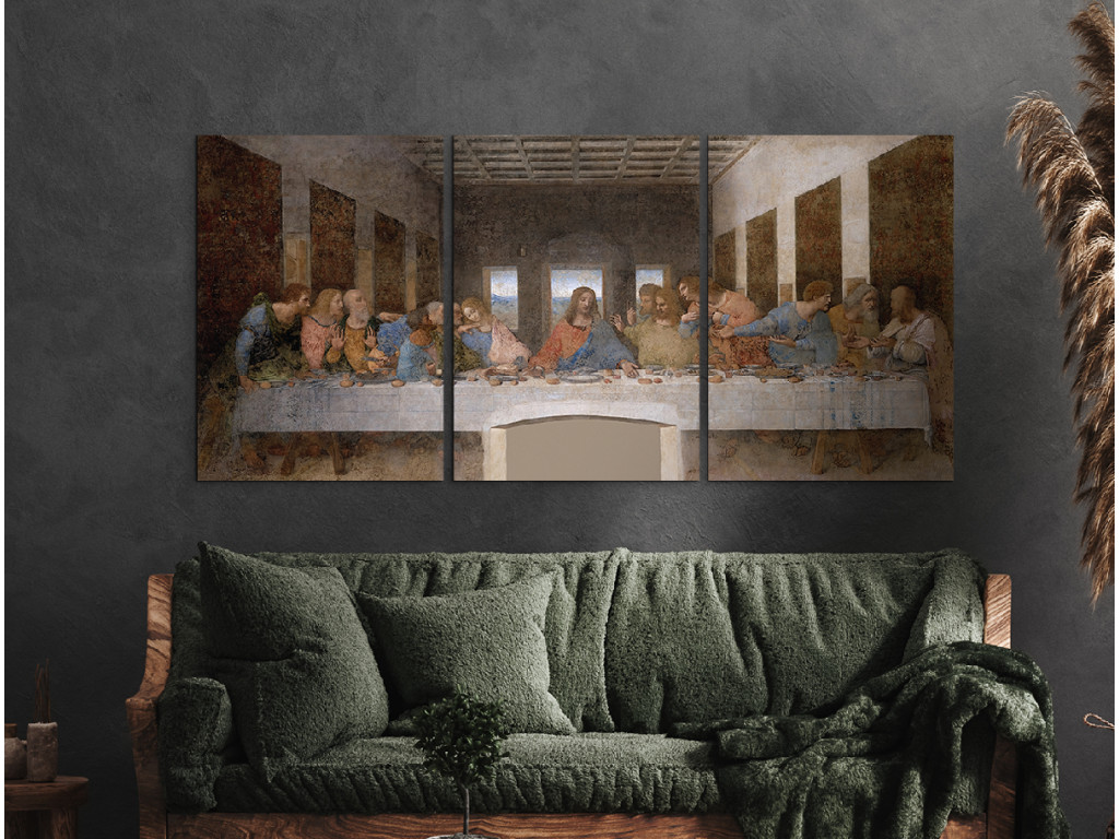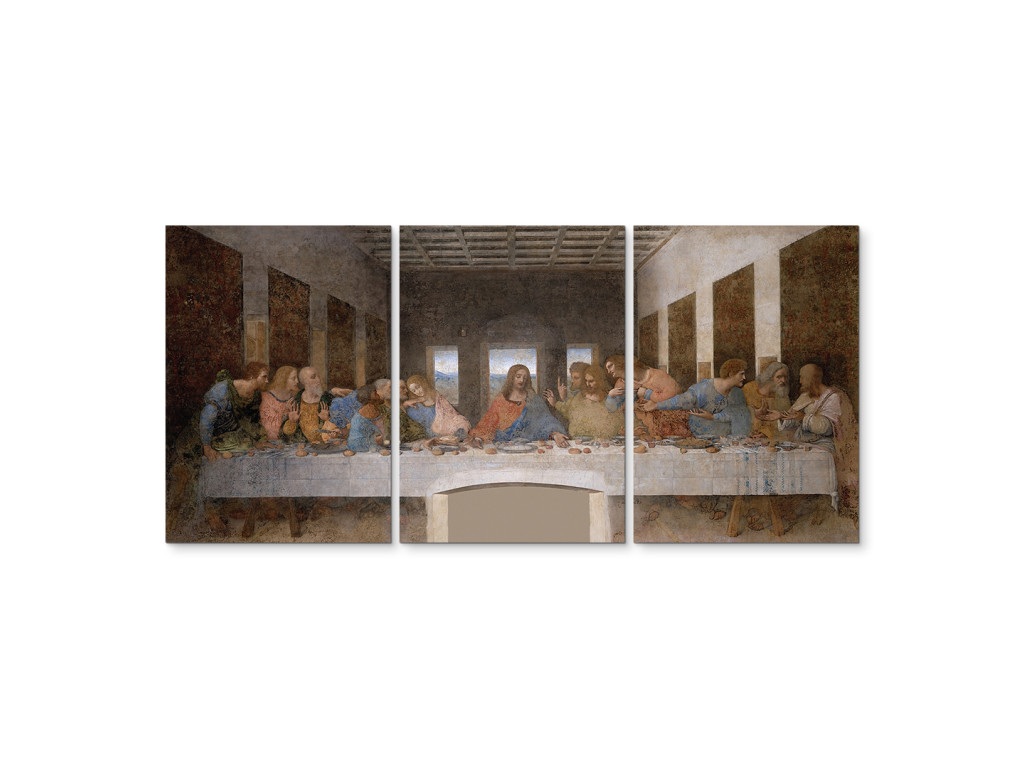 Dieses Triptychon zeigt die ikonische Szene des Letzten Abendmahls, die in drei Teile unterteilt ist, was die Dramatik und die Konzentration auf die zentrale Figur Jesu Christi verstärkt. Das Bild ist in warmen, klassischen Farbtönen gehalten, was ihm spirituelle Tiefe und einen zeitlosen Charakter verleiht.