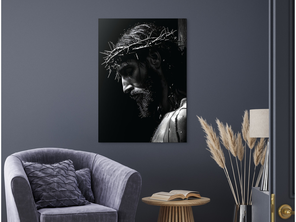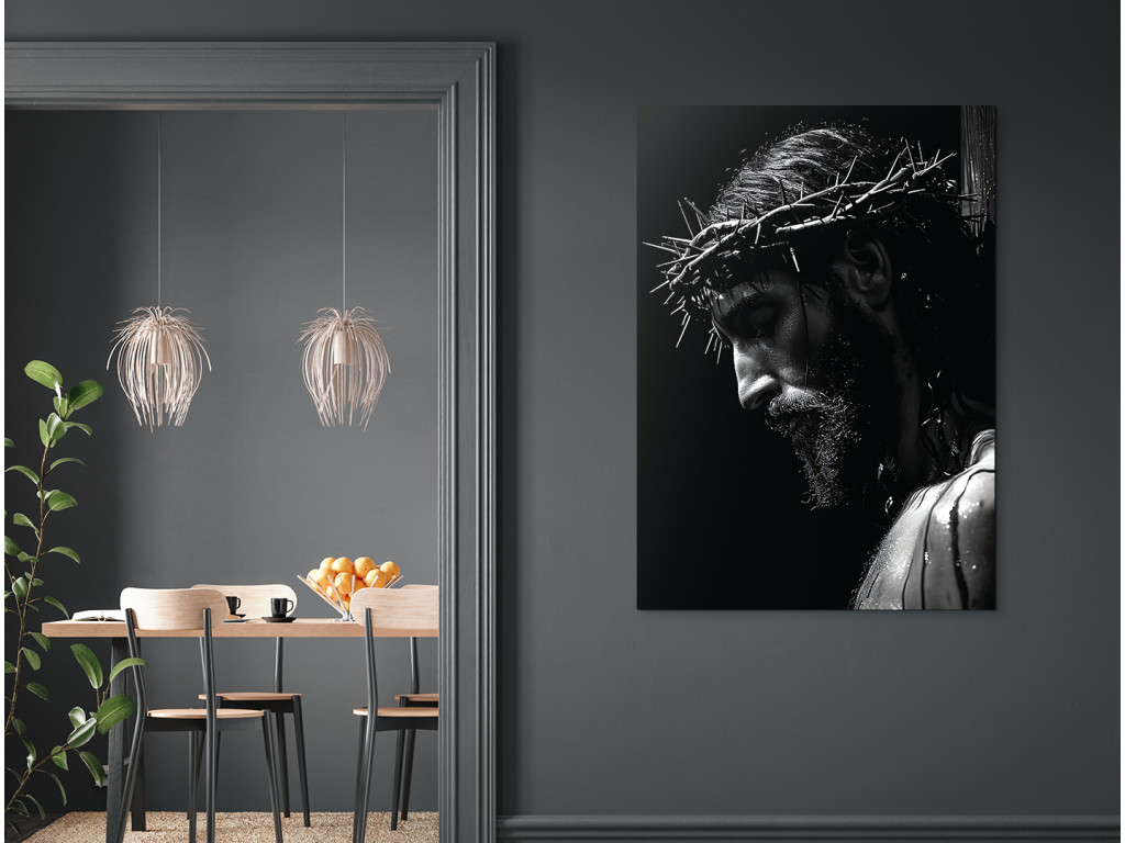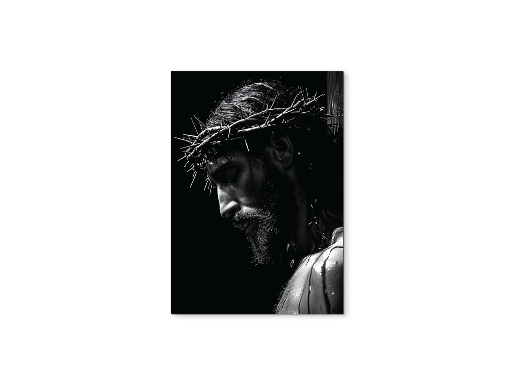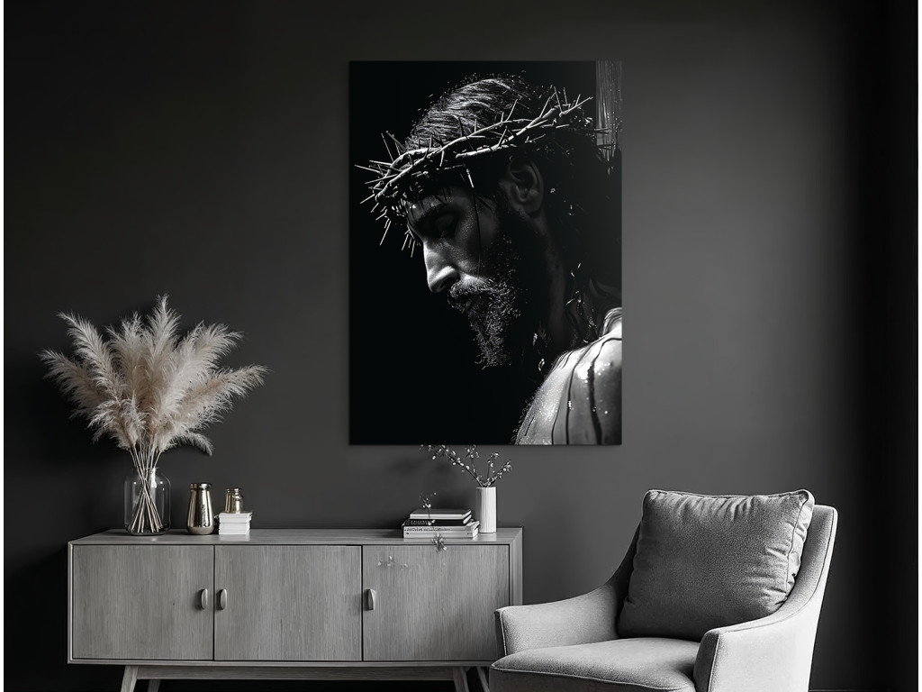 Das Schwarz-Weiß-Bild zeigt das Gesicht Jesu Christi mit der Dornenkrone, versunken in tiefes Leiden und Schweigen. Die minimalistische Gestaltung in Schwarz-, Grau- und Weißtönen verstärkt die emotionale Kraft des Ausdrucks, der voller Schmerz, Demut und Opferbereitschaft ist. Dieses Werk wirkt zeitlos und kontemplativ, lädt zum Innehalten und Mitgefühl ein.