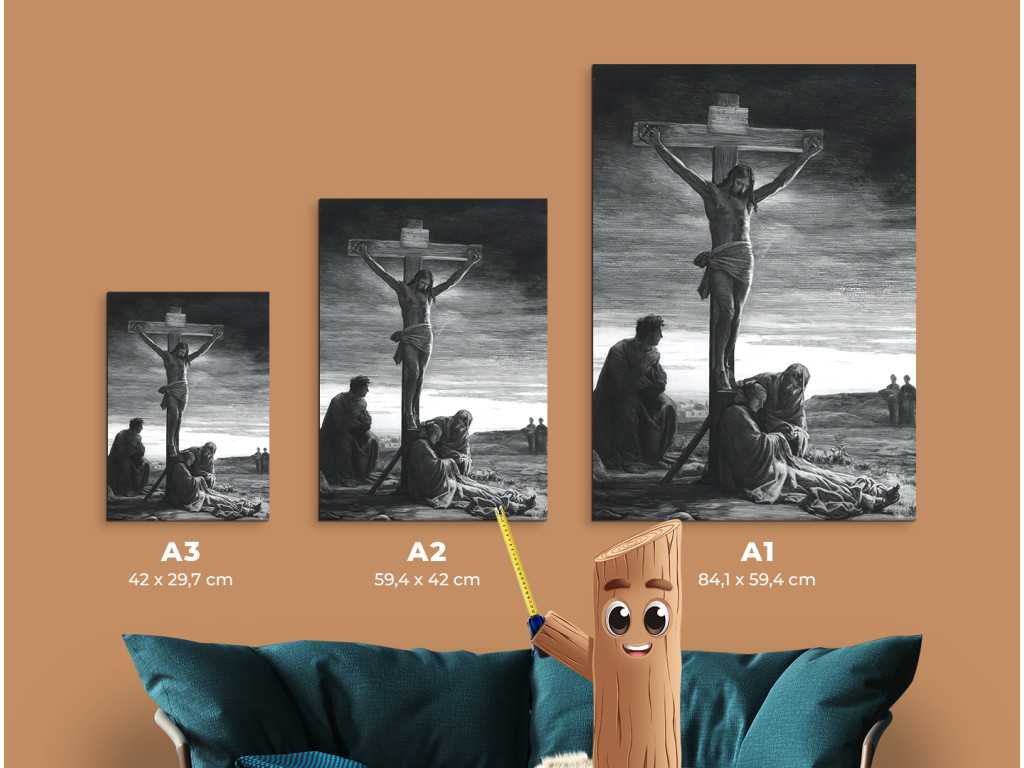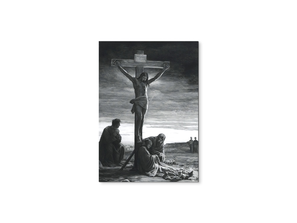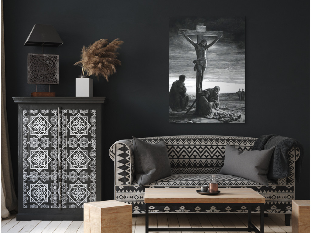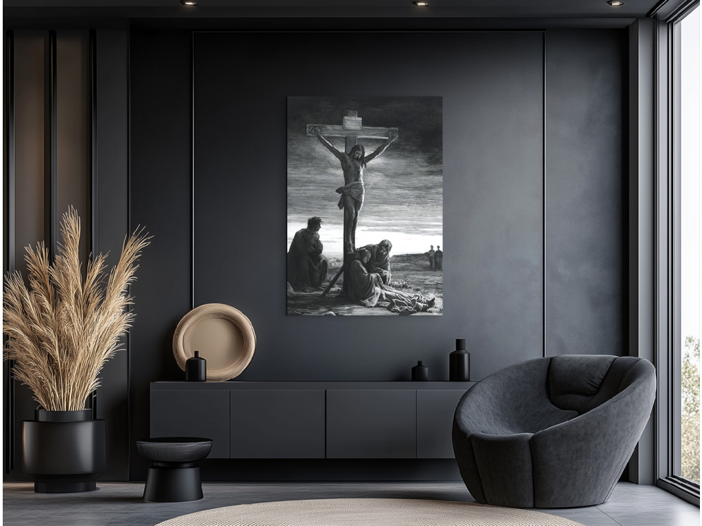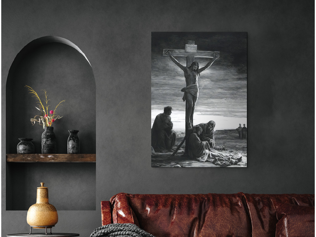 Das Bild zeigt Jesus Christus am Kreuz in einem realistischen Stil, der für die zweite Hälfte des 19. Jahrhunderts typisch ist. Die Betonung der Anatomie, des Gesichtsausdrucks und des Lichtspiels spiegelt die damaligen künstlerischen Ansätze wider, die den Schwerpunkt auf die emotionale Kraft der Darstellung und die spirituelle Botschaft legten. Das Werk gehört zu den klassischen christlichen Motiven und wirkt im Innenraum als starkes Symbol des Glaubens und der Hoffnung.