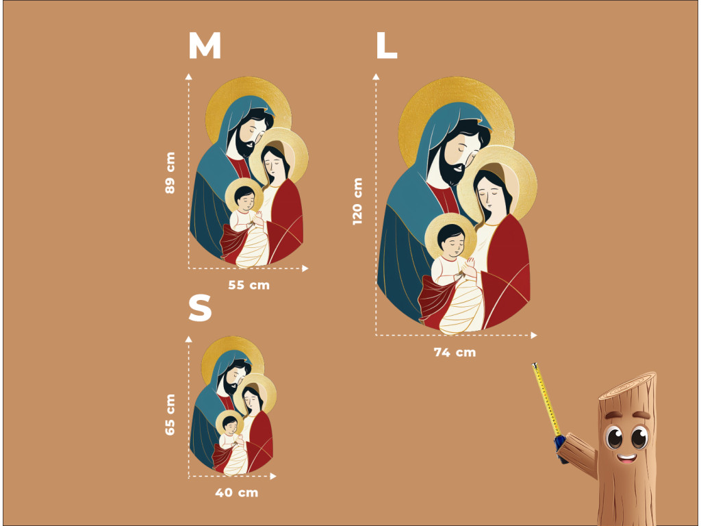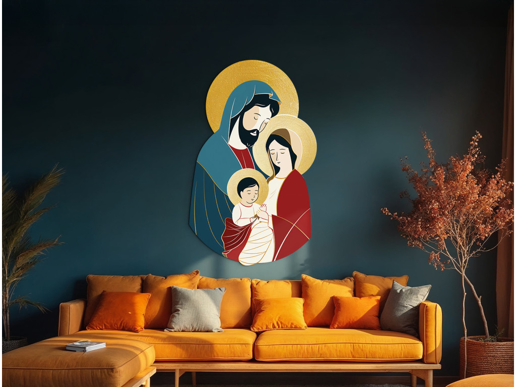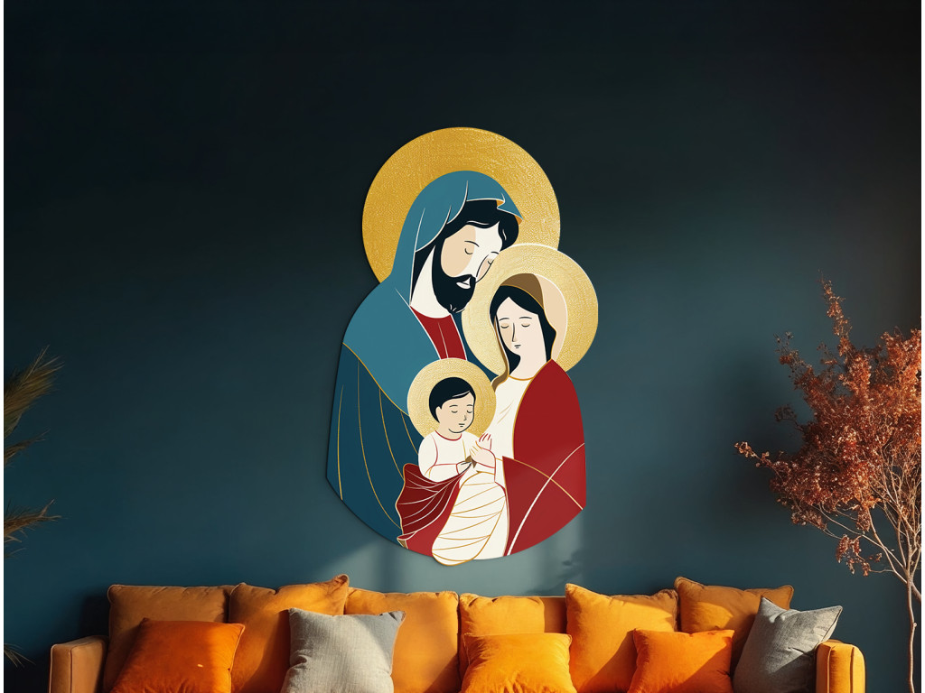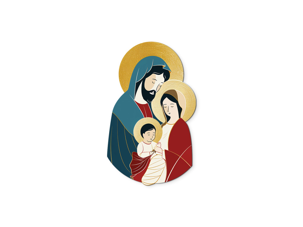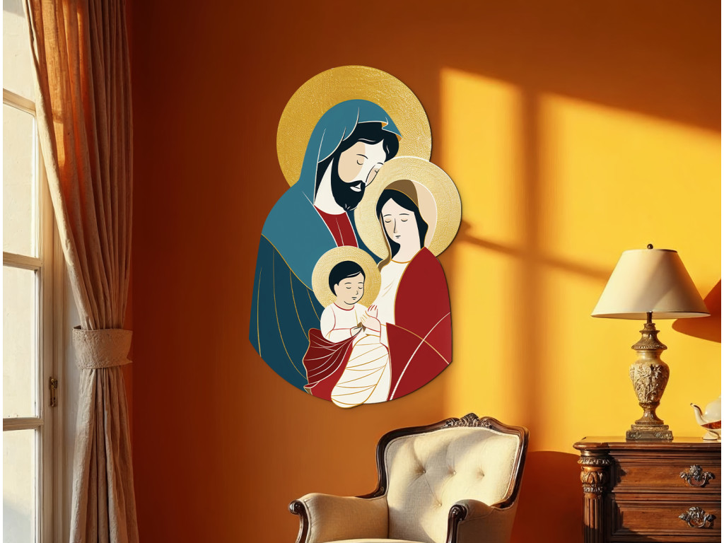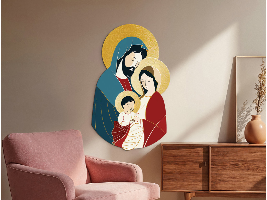 Das Bild zeigt die gemalte Heilige Familie – die Jungfrau Maria in Rot, den Heiligen Josef in Blau und das Jesuskind in weißer und roter Kleidung. Die sanften Linien und vereinfachten Formen werden durch goldene Heiligenscheine ergänzt, die der Szene spirituelles Licht und Ruhe verleihen. Dank der sanften Farbgebung und der liebevollen Atmosphäre ist dieses Bild auch eine schöne und einfühlsame Ergänzung für ein Kinderzimmer – als stille Erinnerung an Liebe, Schutz und familiäre Nähe.