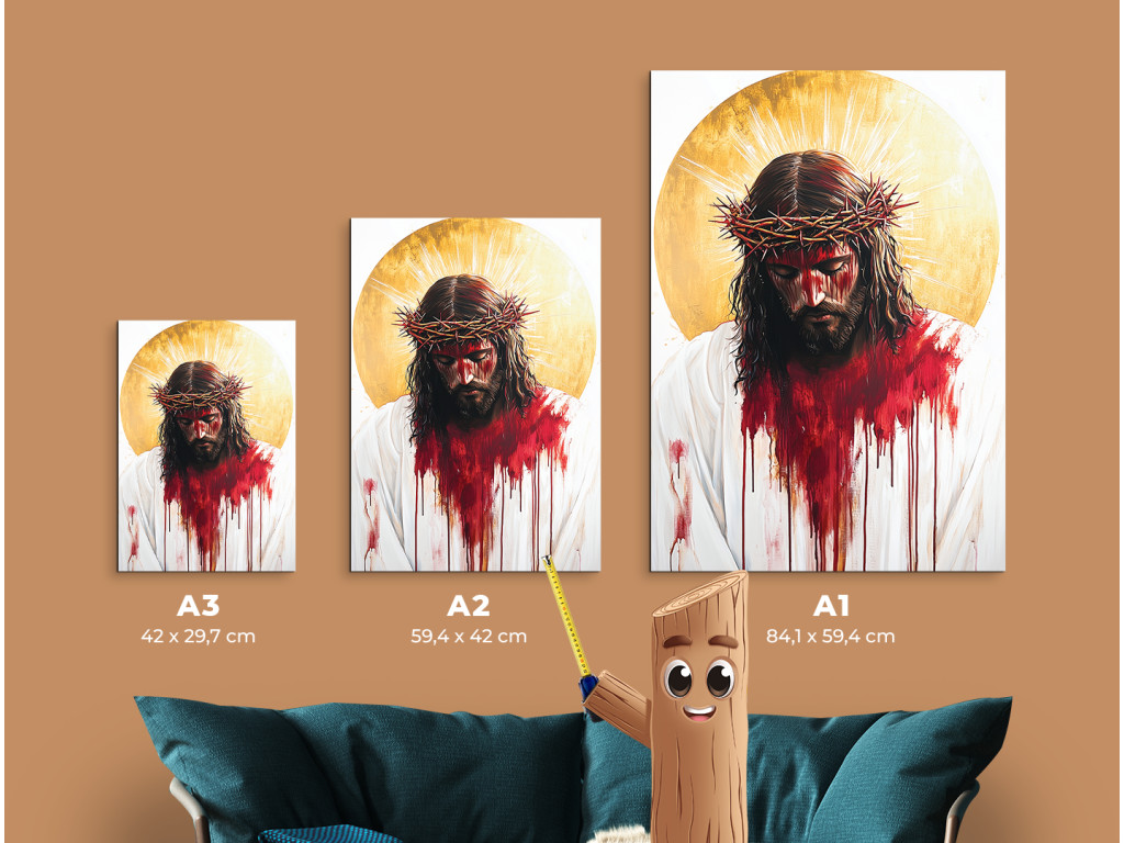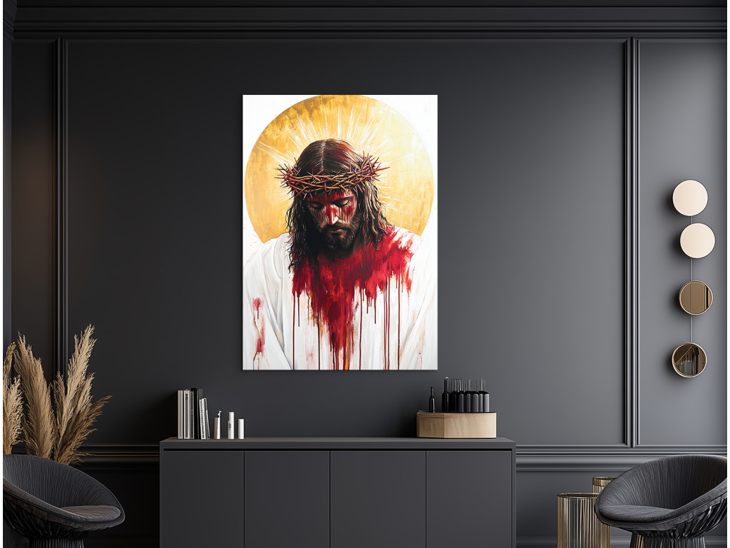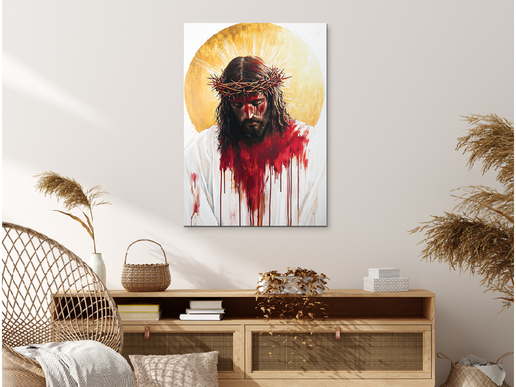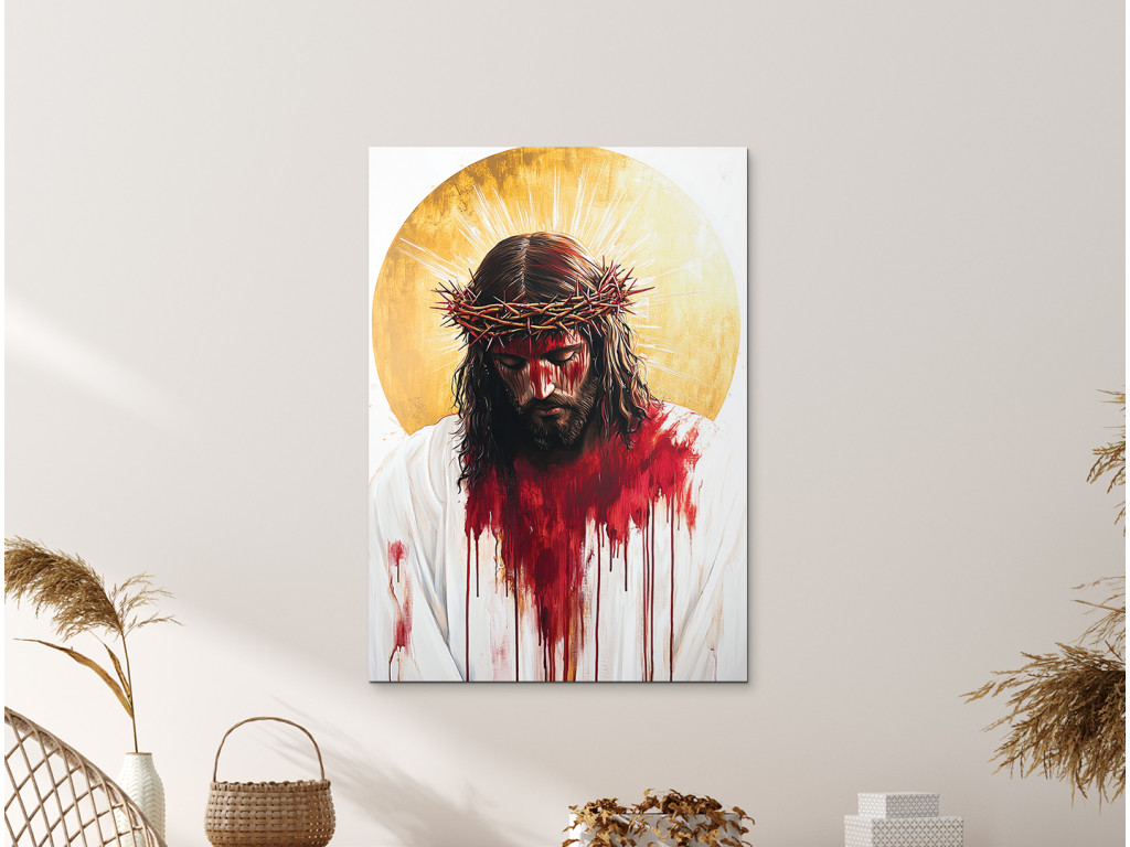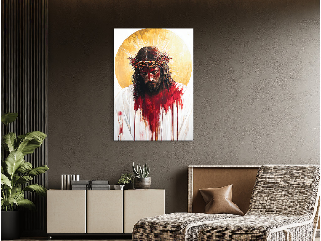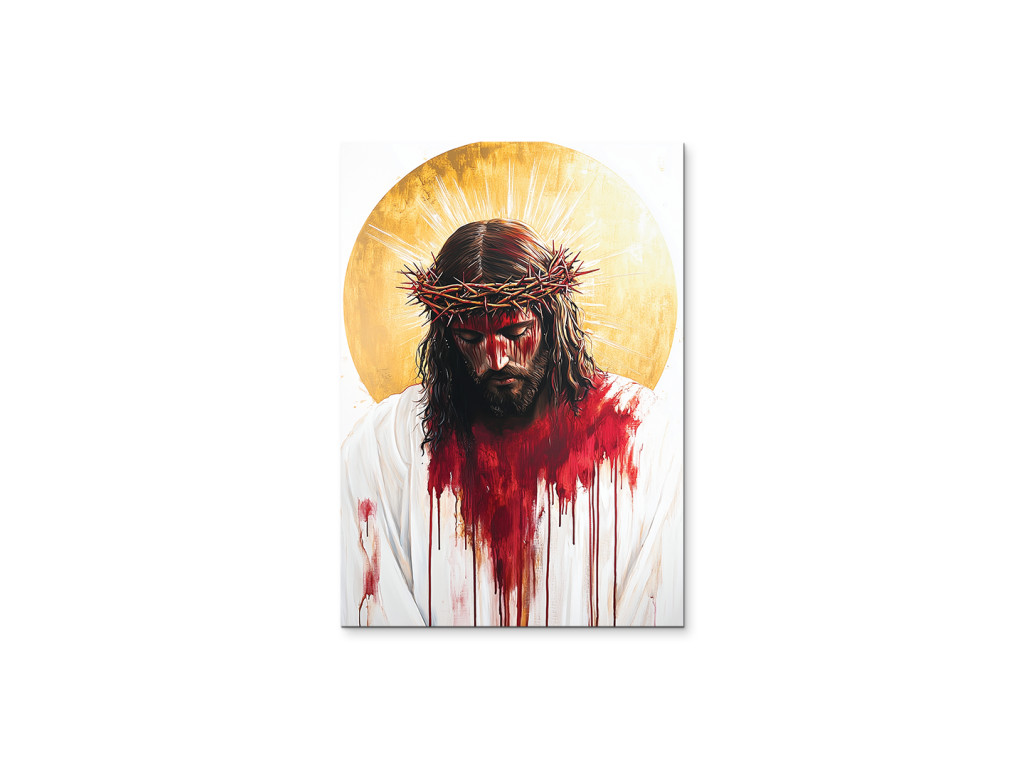 Das farbintensive Gemälde zeigt Jesus Christus im Moment seines Leidens, mit einem von Blut, Schmerz und einer Dornenkrone gezeichneten Gesicht. Die Farben sind kräftig und dramatisch – das rote Blut kontrastiert mit der blassen Haut und dem weißen Hintergrund, was die ausdrucksstarke Wirkung und emotionale Wirkung noch verstärkt. Das Werk strahlt eine intensive Kraft des Opfers und tiefes Mitgefühl aus und erinnert an den Preis der Erlösung.