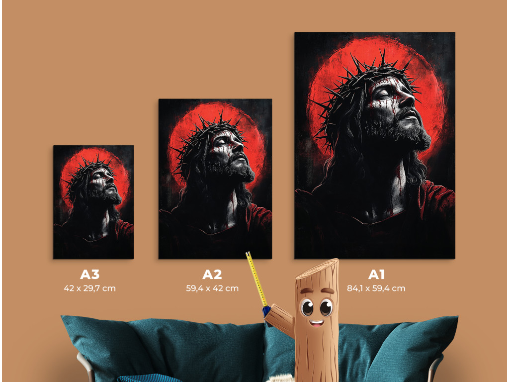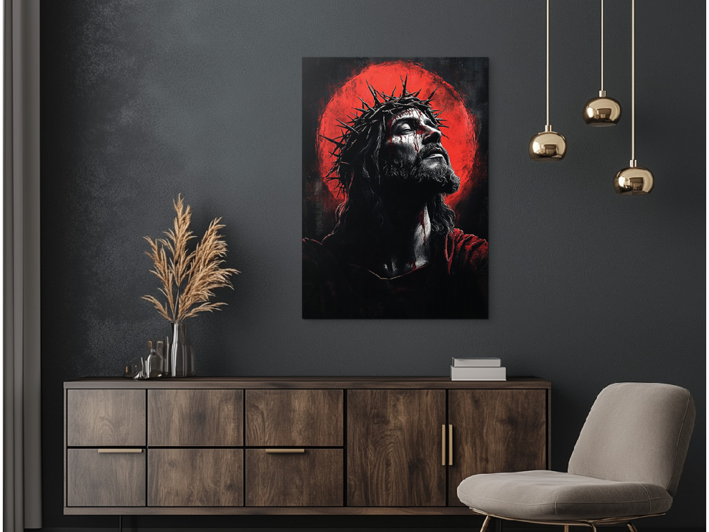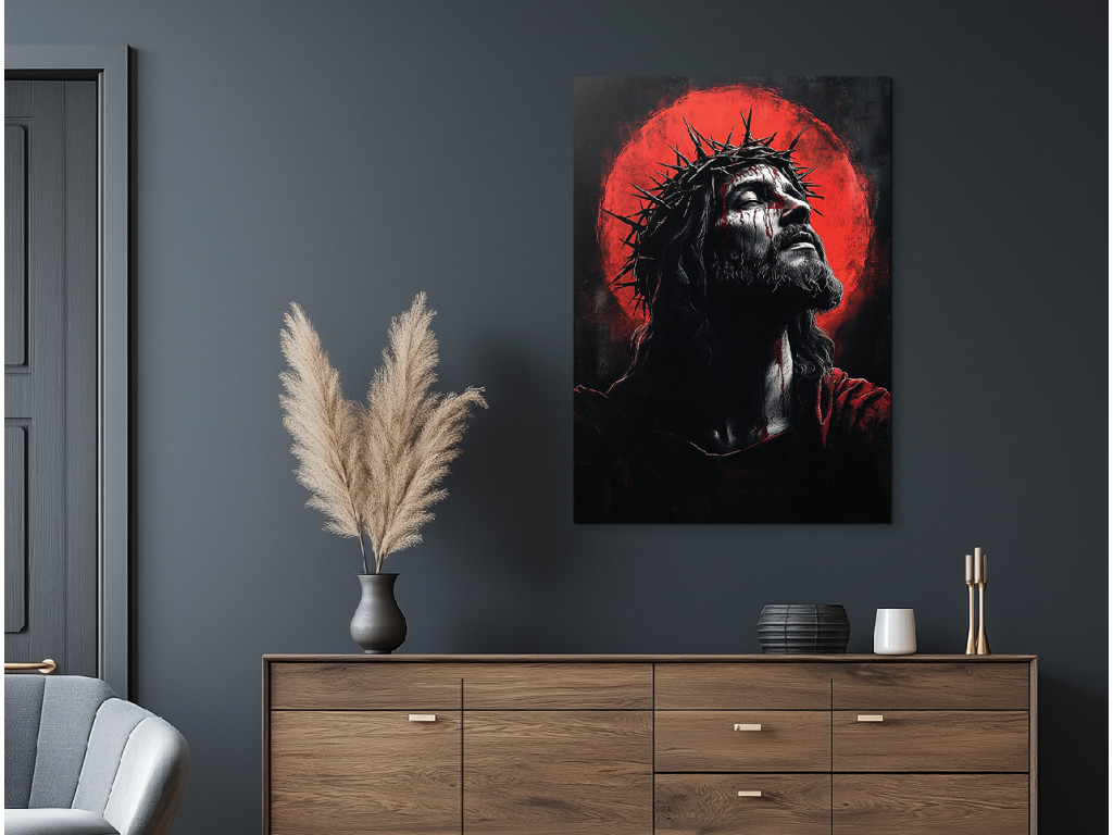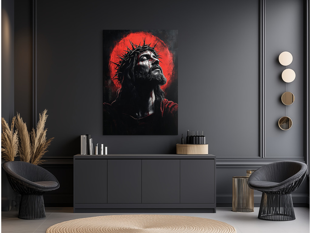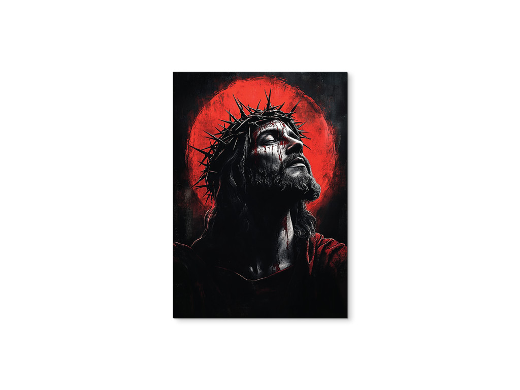 Dieses Bild zeigt das Gesicht Jesu Christi in einem Moment tiefen Leidens, mit einer Dornenkrone fest auf sein Haupt gedrückt. Sein Blick ist gesenkt, voller Schmerz und Mitgefühl, wodurch er seine stille, aber unendliche Liebe zur Menschheit zum Ausdruck bringt. Die Kontraste von Schatten, Farben und Licht auf seinem Gesicht betonen die spirituelle Tiefe des Opfers und die Kraft der erlösenden Liebe.