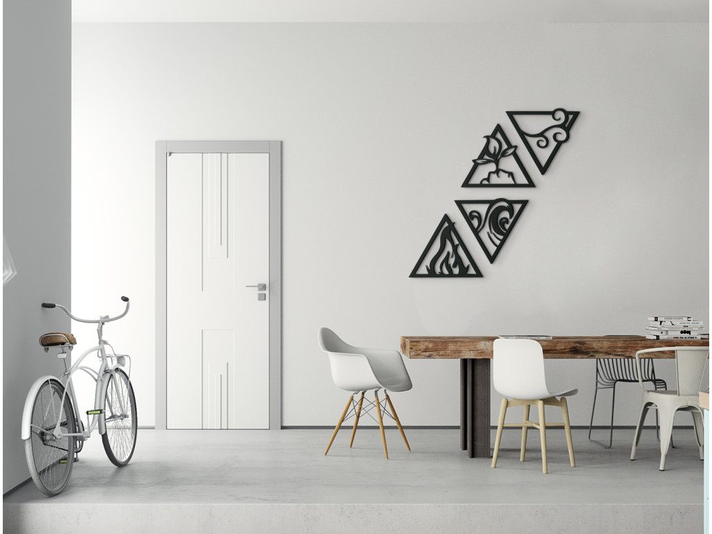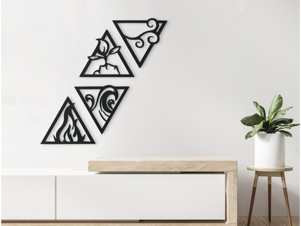 Die 4 Elemente des Holzstickers bringen originelles Design in jeden Raum. Die Sticker in Dreiecksform können im Hoch- und im Querformat angebracht werden. Sie passen in die moderne Einrichtung eines Wohnzimmers, Flurs, Esszimmers oder Büros.