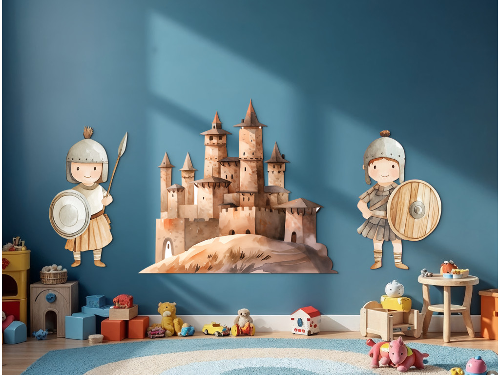 Das gezeichnete Schloss mit Türmchen wie aus der Zeit der Prinzessinnen wird von zwei lächelnden Soldaten in alten Uniformen bewacht. Das gesamte Bild wirkt märchenhaft und verspielt – wie eine Szene aus einem Kinderbuch voller Prinzessinnen, Ritter und Abenteuer. Die ideale Ergänzung für das Kinderzimmer kleiner Träumer und Prinzessinnen.