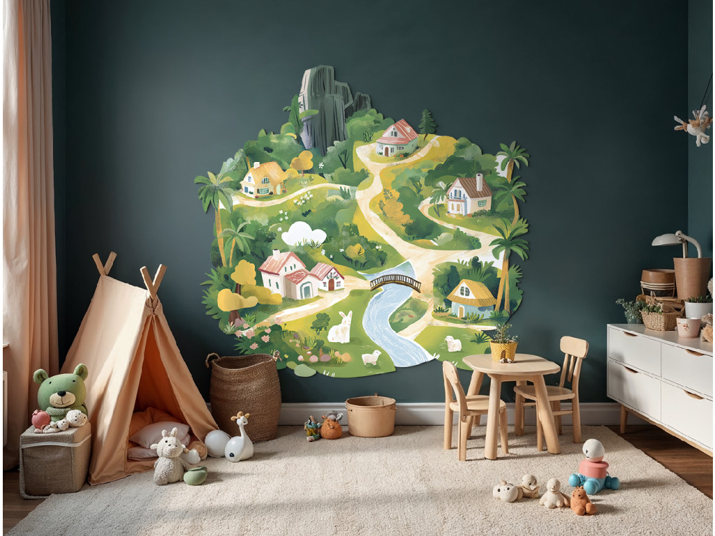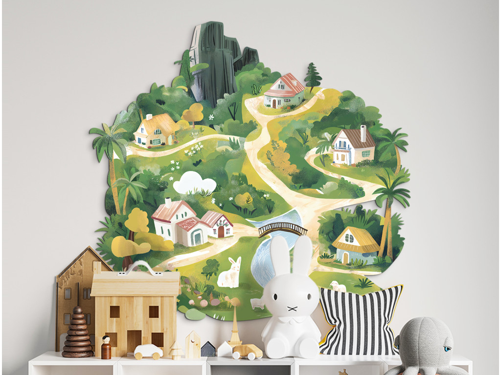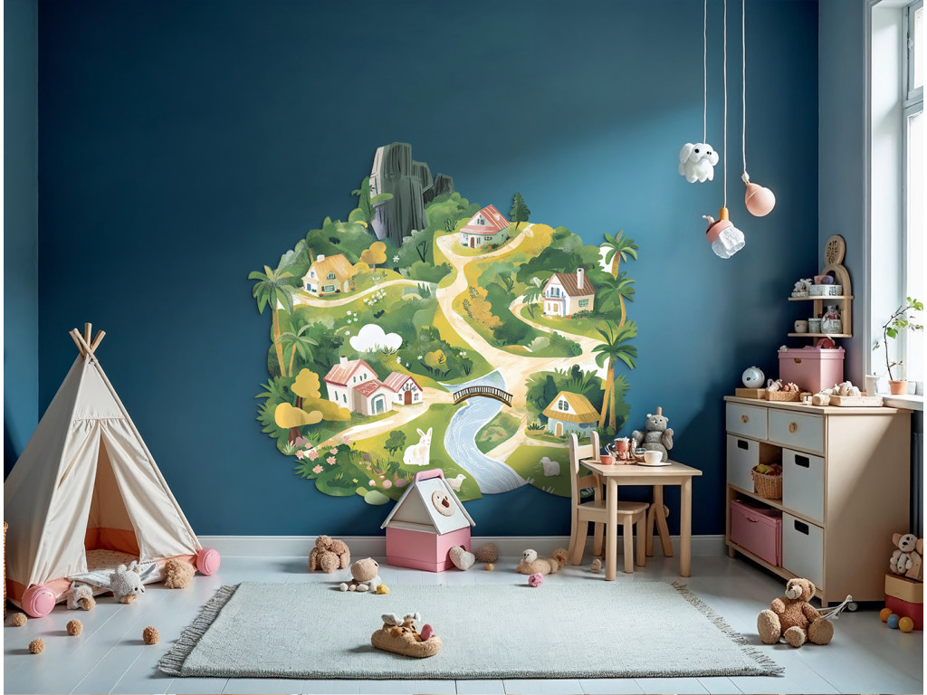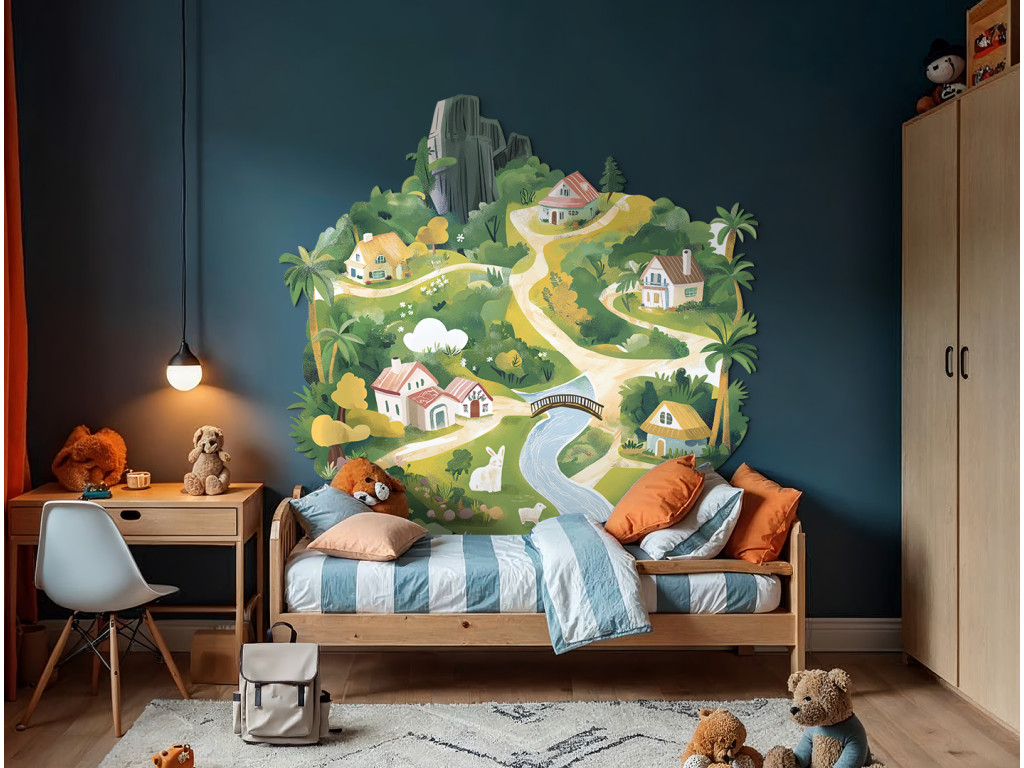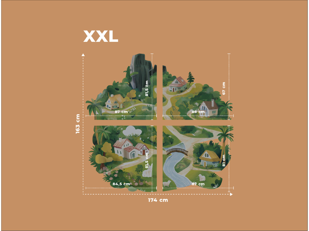 In dieser ruhigen Landschaft fließt ein Fluss, weiden Schafe und führt der Weg über Brücken zu Häusern auf einem Hügel. Entdecken Sie eine Landschaft, in der Natur, Tiere und stille Abenteuer in Harmonie miteinander leben.