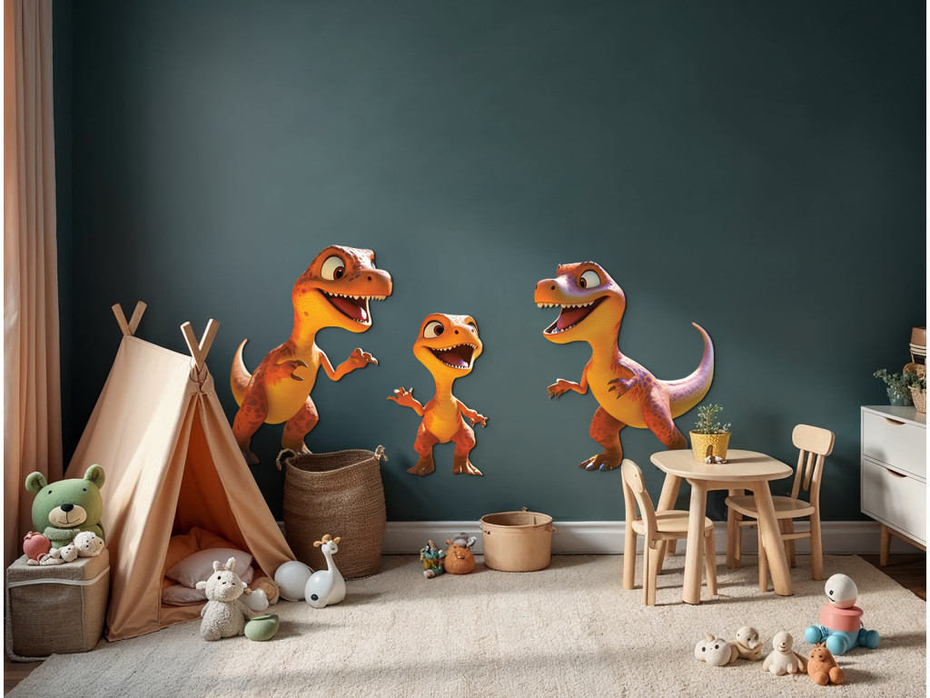 Drei niedliche kleine Dinosaurier im Cartoon-Stil verschönern jedes Kinderzimmer! Diese Wanddekoration bringt die Welt der prähistorischen Kreaturen in einer freundlichen, farbenfrohen und sanften Form zum Leben. Perfekt für kleine Abenteurer, die Dinosaurier lieben, aber auch für Eltern, die eine stilvolle und verspielte Wanddekoration suchen.